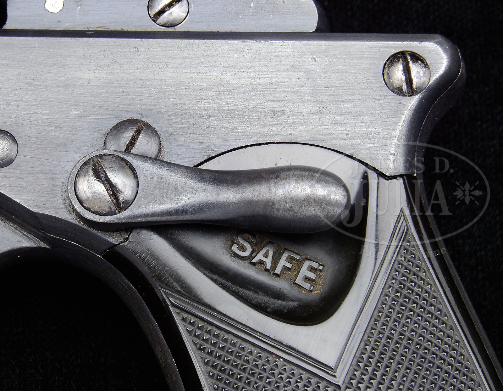 *◊ VERY SCARCE WEBLEY FOSBERY M1903 REVOLVER, SHORT BARREL.SN 3820. Cal. .455. Very scarce Webley Fosbery M1903, blued, with small cyl & frame, smooth trigger, with usual self-cocking mechanism/zig-zag cyl, having a 4″ bbl, with fixed front & rear sights. Levered top break release. Bbl rib marked “P. WEBLEY & SON. LONDON & BIRMINGHAM.” Left side of top strap is marked “WEBLEY FOSBERY”; left side of frame has the Webley flying bullet logo followed by “.455 CORDITE”. SN is on the right side of the frame & repeated under the bbl & on back of cyl. Crown/BP & Crown/BV proofing on cyl & bbl. Mounted on left side of frame is a thumb safety that, when engaged in the “up” position, exposes the word “SAFE” that has been molded into the left grip panel. At the base of the frame is a rotatable lanyard ring. Fitted with orig, dark brown & checkered, hard rubber 2-pc grips. PROVENANCE: Collection of Dr. Geoffrey Sturgess. CONDITION: Approx 98% factory refinish, perfect brushed blue tonality. The only way to discern is by looking at the very fine pitting under the blue on each side of the frame and few small areas on cyl. Small parts, usually blackened, with the same brushed blue finish. Crisp orig grips with few superficial handling marks. Mirror bore. Perfect manual mechanics. One of very, very few short bbl revolvers Webley Fosberys to leave the company, a real find for the Webley Fosbery collector. 43475-312 LMA (10,000-15,000) – Lot 3635