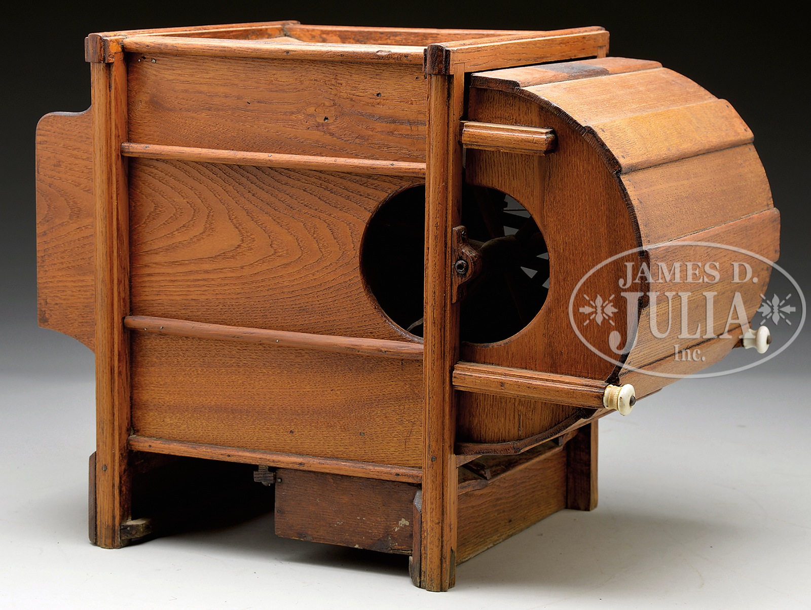 SALESMAN SAMPLE GRAIN SEPARATOR.Elaborate all wood model with funnel at top leading through a hand crank paddle and several graduated wire screens that shake to and fro with a catching drawer below. Retains partial decal stating the date of 1880. SIZE: 18″ l x 14″ h x 11″ w. CONDITION: Good to very good with minor chips and scratches. 1-13981 (500-700) – Lot 3640 Auction: Advertising, Toy & Doll - Spring 2014 Please Note: All prices include the hammer price plus the buyer’s premium, which is paid by the buyer as part of the purchase price. The prices noted here after the auction are considered unofficial and do not become official until after the 46th day. |