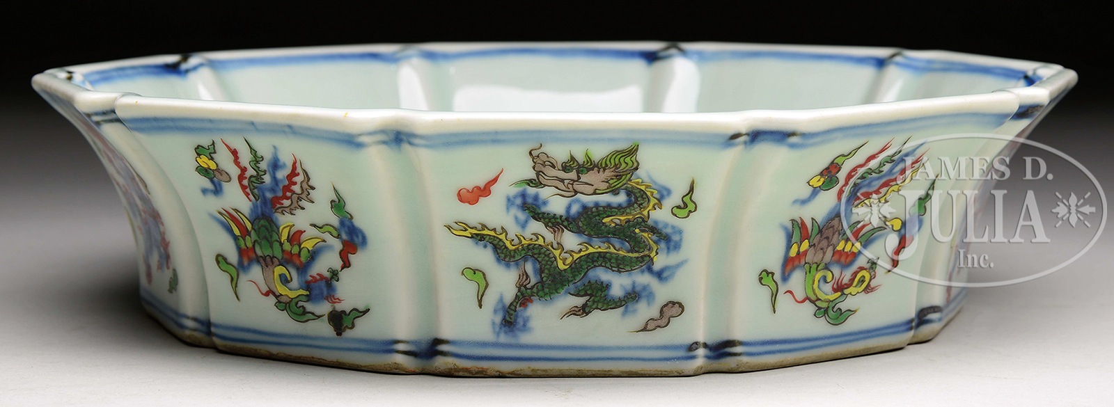 PORCELAIN SHAPED DISH.20th century, China. 10-sided dish with Wu Tsai decoration of dragons and phoenixes, six-character Hsuan Te mark on the base. SIZE: 9″ dia. CONDITION: Very good. 9-93240 (600-900) – Lot 3646
