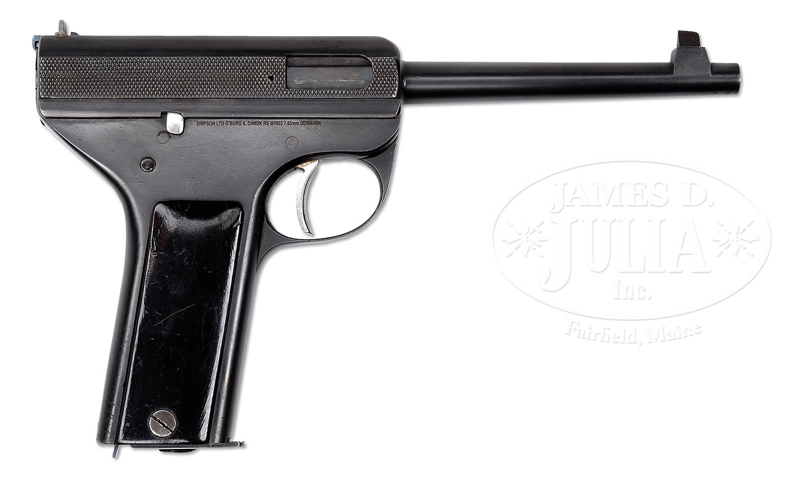 *◊ EXTREMELY RARE, HIGH CONDITION SCHOUBOE M1903, CALIBER 7.65MM.SN 108. Cal. 7.65mm. The Dansk-Rekylriffel-Syndikat in Copenhegan, Denmark, only made a handful of Schouboe pistols in 7.65mm. This rust blued example with a brightly polished trigger, marked only with the SN, has a 5-3/4″ bbl and a drift adjustable front & rear sight. The raised panel on each side of the slide is fully checkered for easier grasping. On the left side of the frame is a rotatable safety with rearward movement for engagement. SN appears on the back of the tang. Spring tensioned bottom magazine release. Smooth bakelite grip panels, each secured by a single large-headed screw at base. Matching magazine with nine indicator holes. As per later guns, disassembly is effected by depressing the plunger above the tang & rotating the bbl slide assembly off the frame, confirming the bbl, slide and hammer have matching SNs. PROVENANCE: Collection of Dr. Geoffrey Sturgess. CONDITION: At least 98% bright orig rust blue with minimal thinning around the muzzle & at bottom of front & backstrap. Comparable condition grip panels & magazine. Bright near mirror bore. Perfect manual mechanics. One of the rarest 7.65mm pistols in exemplary condition. 43475-323 LMA (9,500-12,500) – Lot 3646