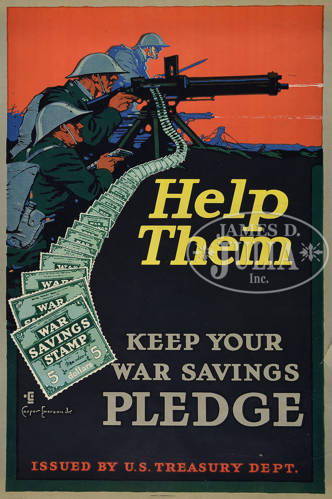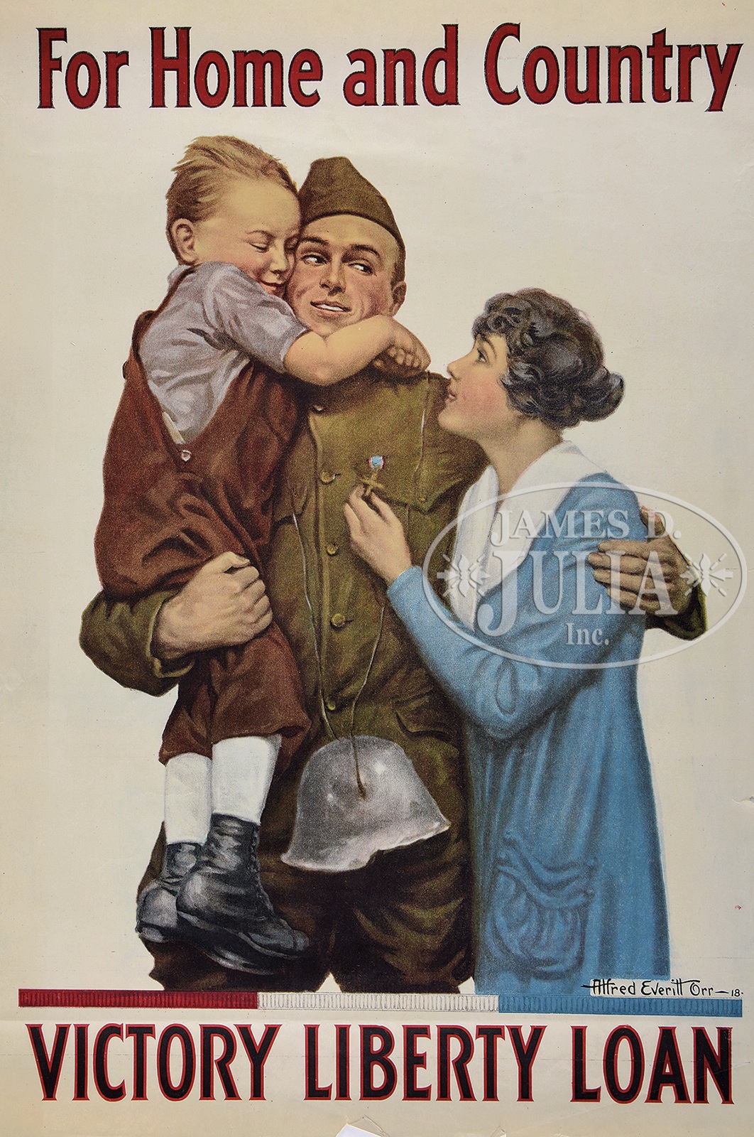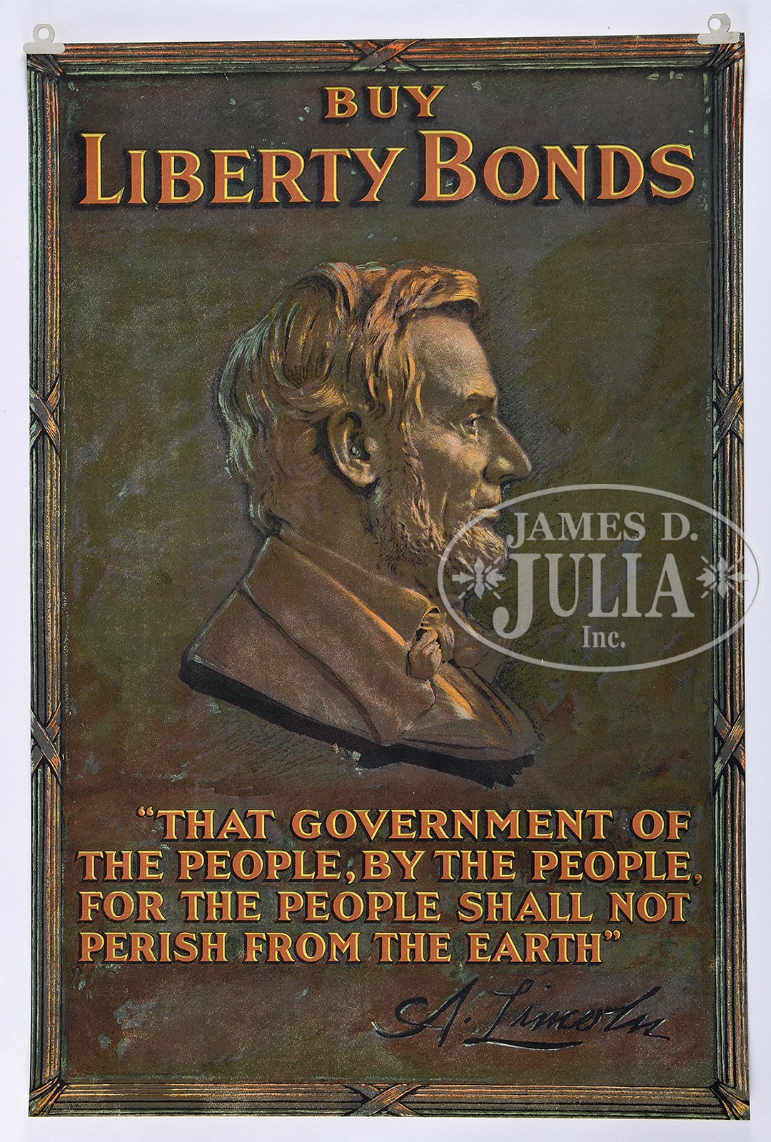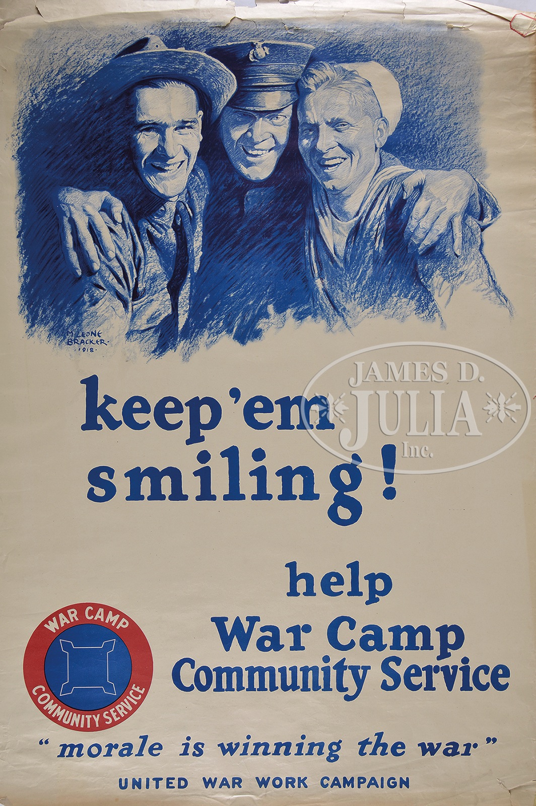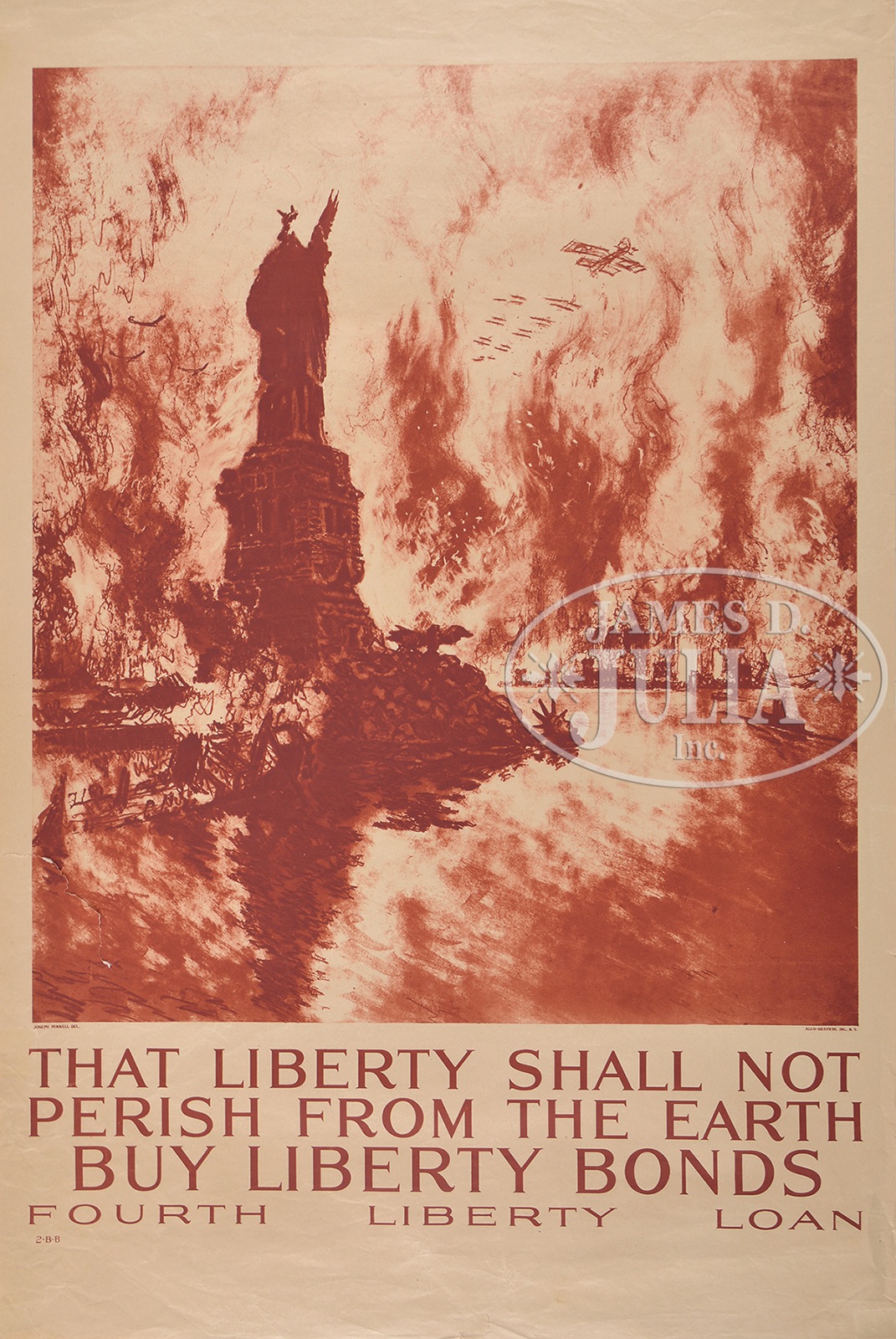 LOT OF 12 WAR BONDS AND STAMPS – RELATED WWI POSTERS.Lot includes: “Keep ’em Smiling – Help War Camp Community Service”; “John T. Burns Real Estate” hunting scene; “Help Them – Keep Your War Savings Pledge” (2); “Finish the Job – Subscribe to the Victory Liberty Loan”; “Buy a Liberty Bond”; Abraham Lincoln “Buy Liberty Bonds”; “That Liberty Shall Not Perish from the Earth Buy Liberty Bonds”; “Remember Belgium”; “Joan of Arc Saved France”; “Beat Back the Hun With Liberty Bonds”; and “For Home and Country”. SIZE: Ranges from 14″ w x 20″ h to 28″ w x 42″ h. CONDITION: Good to very good. 1-13760-3 (400-600) – Lot 3648 Auction: Advertising, Toy & Doll - Spring 2014 Please Note: All prices include the hammer price plus the buyer’s premium, which is paid by the buyer as part of the purchase price. The prices noted here after the auction are considered unofficial and do not become official until after the 46th day. |