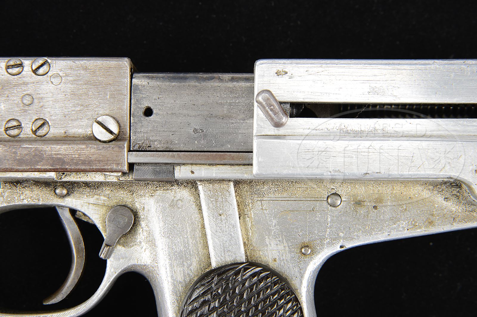 *◊ UNIQUE ORMAN SELF-LOADING PISTOL, WITH CAST ALUMINUM FRAME, PATENT MODEL.SN 4C. Cal. .45. Very unusual big bore single action semi-automatic pistol, patented by Orman in 1912 under British Patent No. 14746. 4-1/4″ bbl with fixed banded front sight & fixed rear sight. Pistol has no manufacturer markings. SN “4C” was applied to the left frame for purpose of importation. Crown/V London proofs are under the bbl, over the chamber, left side of bolt, and on left side of bolt housing. The two-lug bolt has a threaded shaft that rotates the bolt head for locking & unlocking and slide recoil is assisted by an accelerator lever pivoted on the left side of the barrel mounting block. Another unique feature relates to the cast aluminum used to make the housing for the bolt and frame, this being one of the earliest, if not the first, weapon (1912) to apply light metal technology to firearm manufacture. A rotating safety mounted to left frame, just behind the trigger guard, acts as a trigger block. A modified W&S .455 magazine, drilled with six indicator holes, releases at the butt. A thin guide, pinned to the left side, has a clawed top to retain the follower. Brown hard rubber grips, molded with coarse checkering, are each secured to the frame with two screws. PROVENANCE: Ex Dinely collection. Collection of Dr. Geoffrey Sturgess. CONDITION: The bbl, orig in-the-white, has oxidized to a near uniform brown that also covers the separately constructed barrel mounting/receiver. Bolt has lost much of its orig blue & cast aluminum parts, still with coarse mold markings, have oxidized to varying shades of grey. Most of the orig blue remains on the trigger & safety lever. Excellent grips showing only minor handling. Bright near mirror bore and perfect manual mechanics. 43475-252 LMA112 (5,000-10,000) – Lot 3650