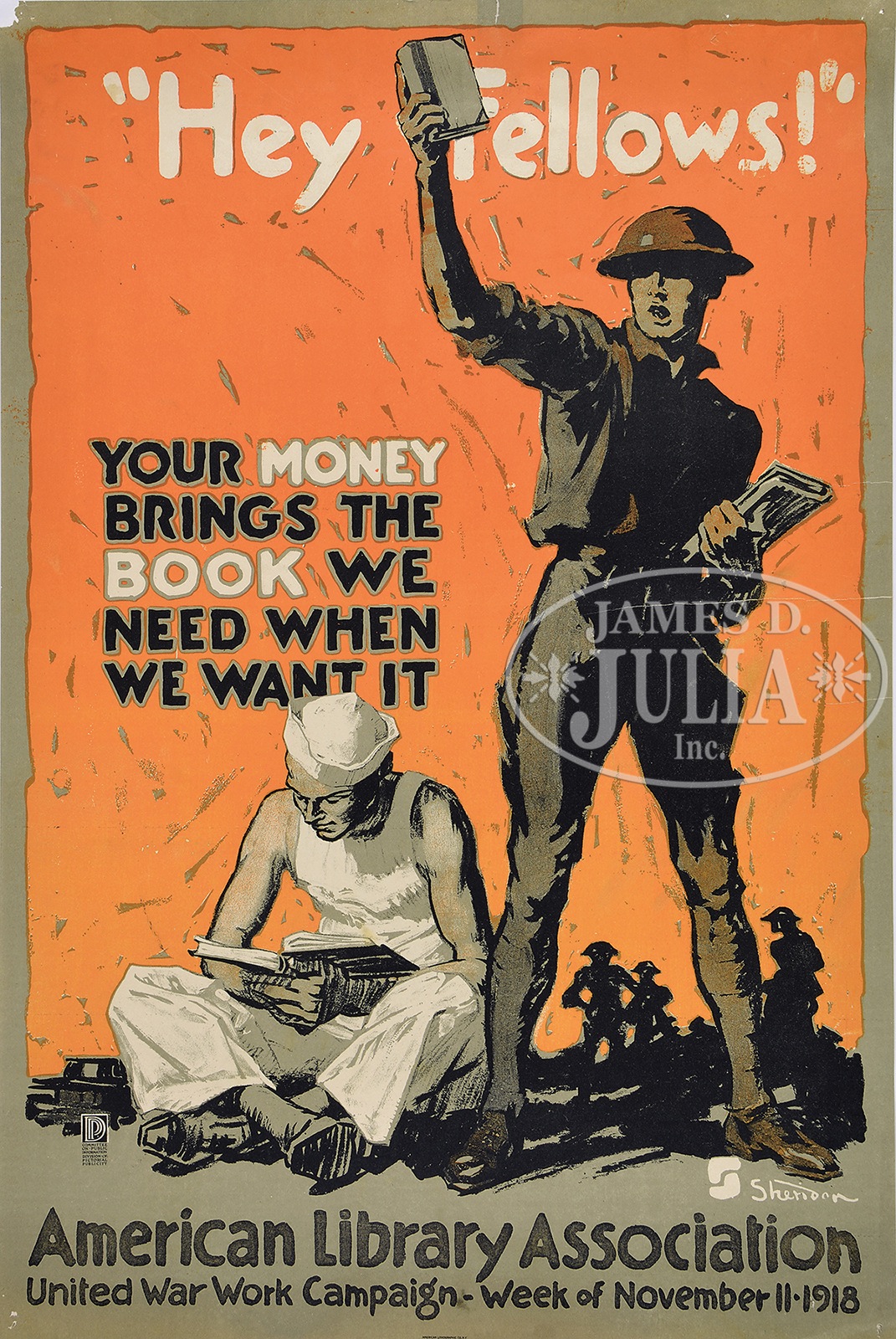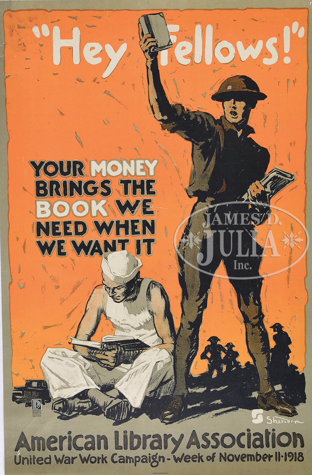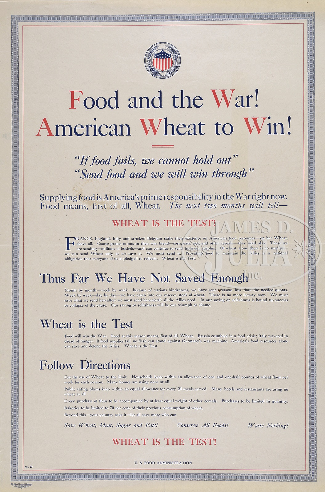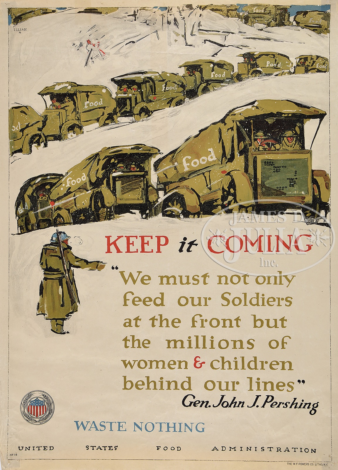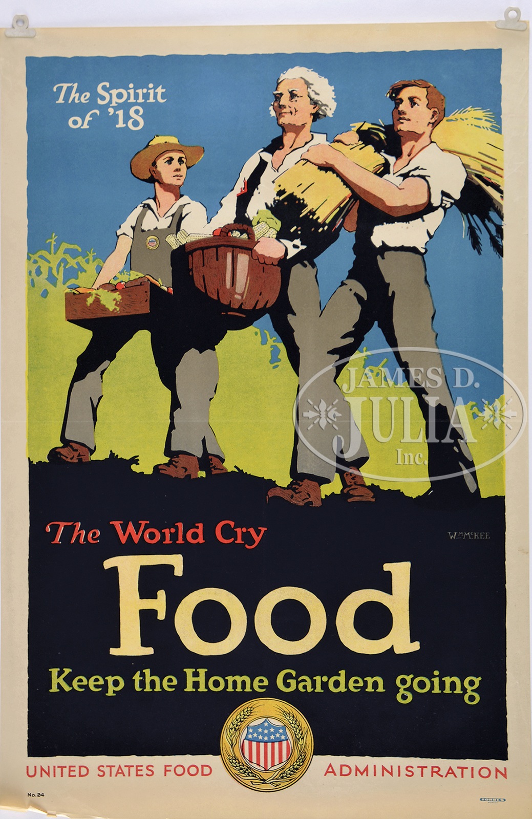 LOT OF 20 FOOD-RELATED WWI POSTERS.Lot includes: “Food is Ammunition”; “Food and the War” (2); “Victory is a Question of Stamina”; “Food-Don’t Waste It”; American Library Association – “Hey Fellows” (2); “Save the Products of the Land”; “Save Wheat, Meat, Fats, Sugar”; “Keep It Coming”; “Blood or Bread”; “Keep the Home Garden Going”; “Cardinal Mercier”; “Hun or Home”; “See Him Through” (2); “War Rages in France-We Must Feed Them”; “This is What God Gives Us. What Are You Giving So That Others May Live?”; “Feed a Fighter”; “Food and the War – American Wheat to Win”. SIZE: Average 20″ h x 20″ w. CONDITION: Overall very good. 1-13760 (800-1,200) – Lot 3651 Auction: Advertising, Toy & Doll - Spring 2014 Please Note: All prices include the hammer price plus the buyer’s premium, which is paid by the buyer as part of the purchase price. The prices noted here after the auction are considered unofficial and do not become official until after the 46th day. |