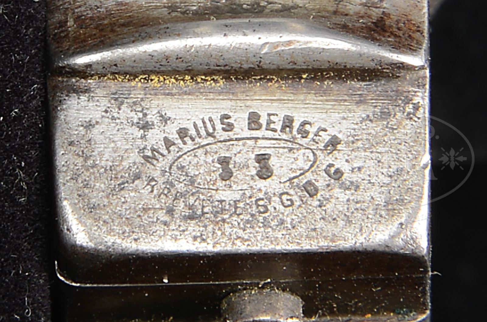 VERY UNUSUAL BERGER REPEATING PISTOL.SN 33. Cal. 7.5mm. The Berger repeating pistol, made in France, has a unique mechanism that involves a double set of hammers. Gun has a 5-1/4″ bbl and an overall length of 9-3/4″. A large, fixed front sight, made of copper, sits on the bbl overriding a tubular magazine that loads from the front. The only marking on this pistol is an oval logo on the front of the frame “MARIUS BERGER/33/BREVETTE S.G.D.G.” The finger loop trigger is well tensioned and the grips are of smooth, varnished wood. Pulling the trigger actuates the cartridge elevator while cocking both hammers. The forward hammer/breechblock, that carries the firing pin, falls first. The rearmost hammer immediately follows, striking the now-protruding firing pin. Relaxing the finger loop allows the trigger to spring back into position. PROVENANCE: Ex-Visser Collection; Collection of Dr. Geoffrey Sturgess. CONDITION: Very little finish remains on this largely gray-brown gun with shallow etching on receiver and a replaced firing pin. Original grips, darkened from use, have superficial handling dings but no significant chips and no splits. Surprisingly bright bore with strong rifling and only mild frosting. Perfect manual function. An exceeding unusual repeater with double falling hammers for a single ignition! 43475-257 LMA39 (2,500-4,000) – Lot 3652