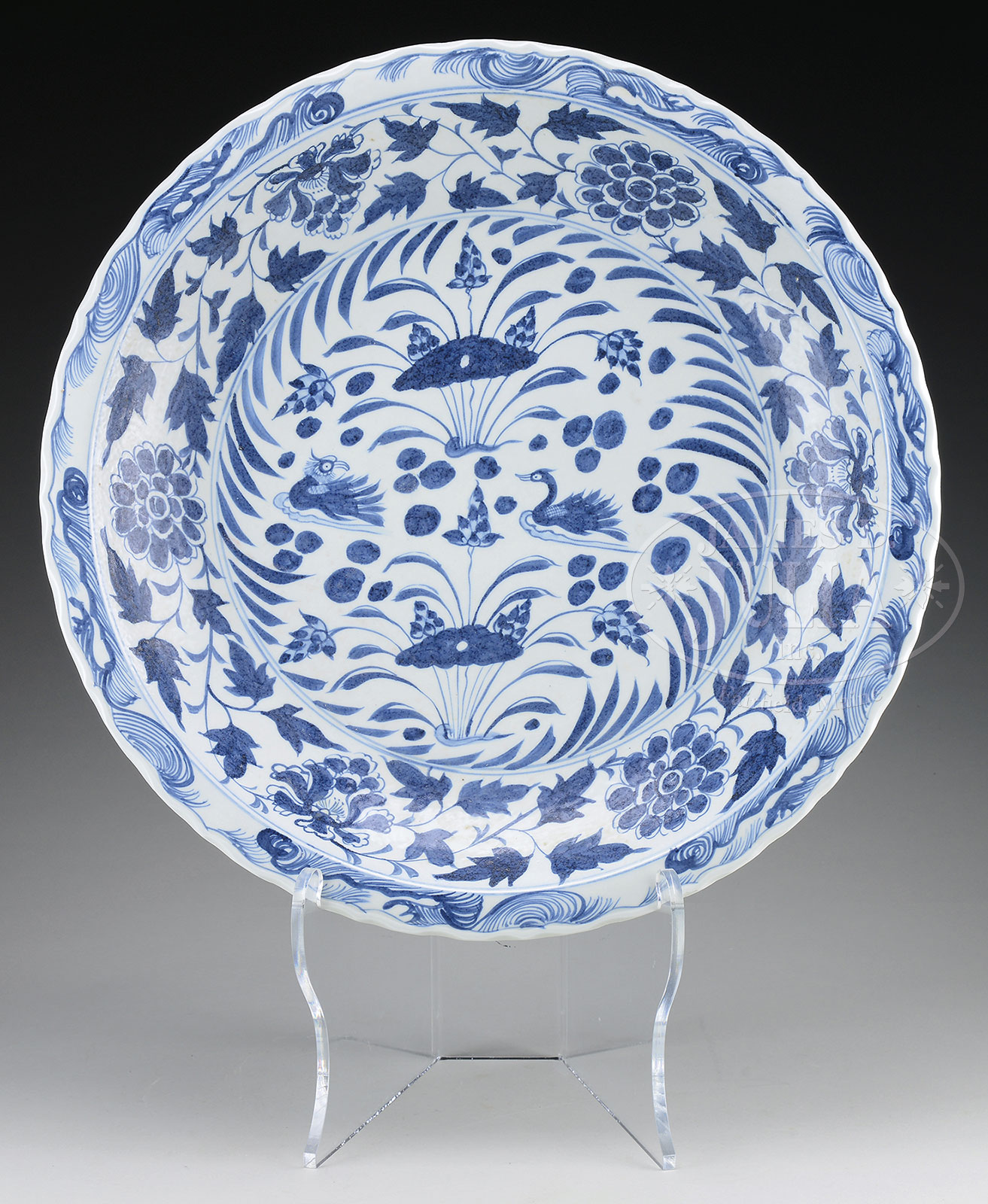 20th century, China. The charger painted in under-glaze blue with scenes of duck and lotus in the center surrounded by a foliate rim. SIZE: 23″ diameter. CONDITION: Very good. 51911-53 (400-600) – Lot 3655