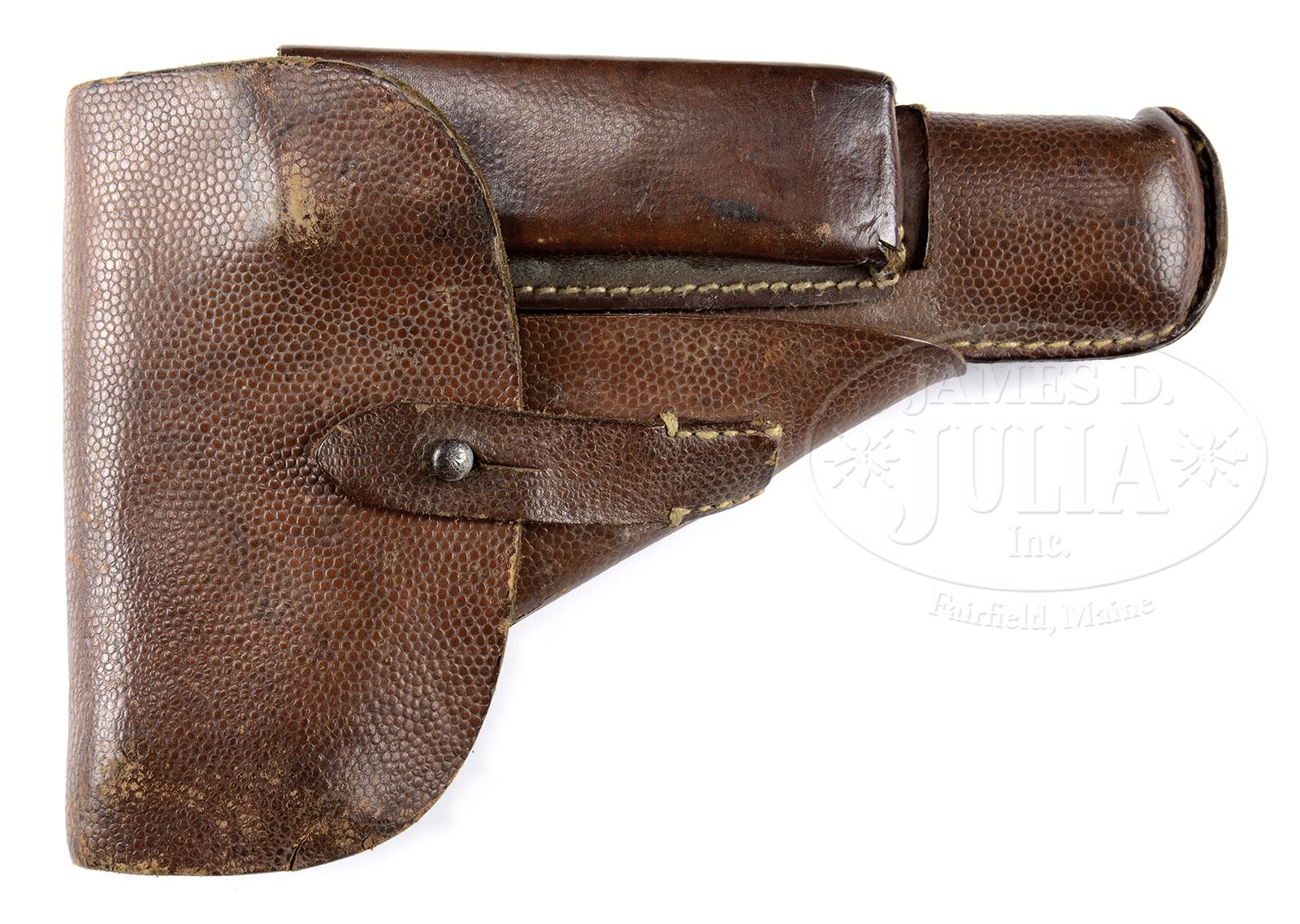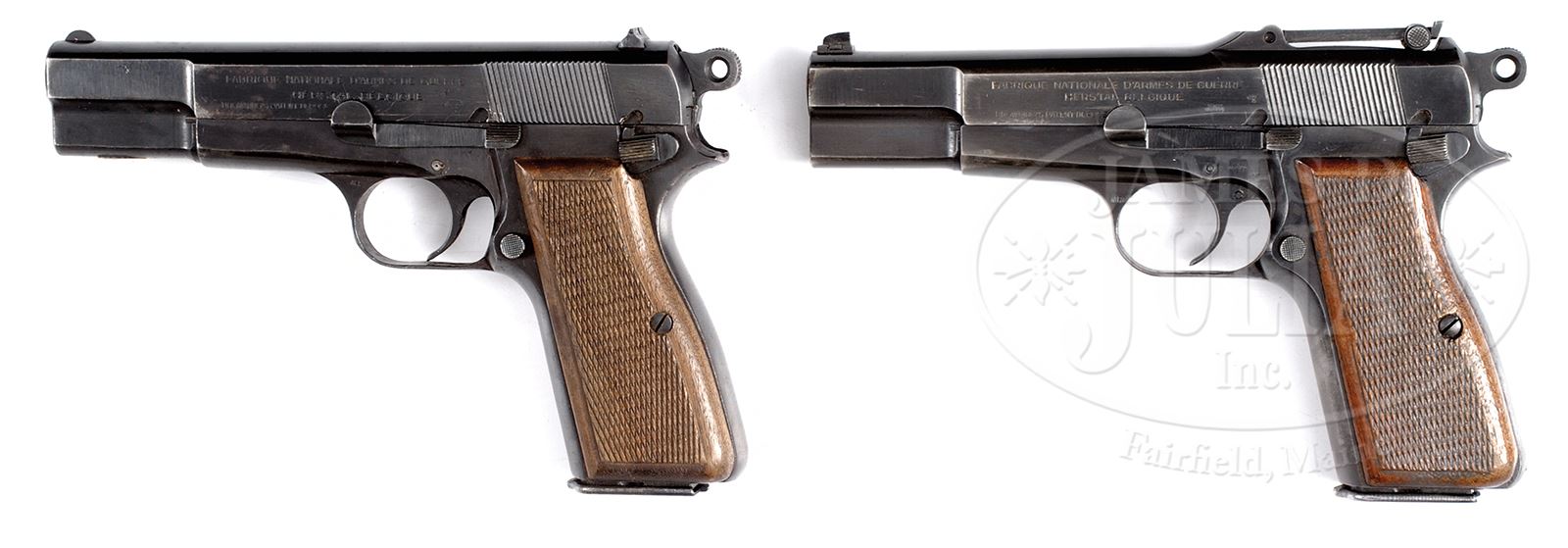 Important Note: The slot in the stock is not factory but was added after production of the gun. *◊ PAIR OF FN GP-35 NAZI HIGH POWERS: ONE WITH LATE TANGENT SIGHT, THE OTHER WITH FIXED SIGHT, EACH WITH HOLSTER.SN 109884 & 32930a. 1) Cal. 9mm Parabellum. Tangent sight Nazi High Power with 4-3/4″ bbl having drift adjustable front sight and slip-in tangent sight, fully graduated from 50-500. The left side of the slide marked with the usual 2-line FN address above the smaller legend referencing Browning’s patent. Full SN appears on the right side of the chamber where exposed in the ejection port, on the slide immediately below, and on the right side of the frame. Nazi acceptance markings that include eagle/WaA140 are on the left side of the slide and frame. An additional acceptance appears on the left side of the bbl hood. The backstrap is slotted to accept the shoulder stock. Correct unnumbered checkered panels with plain border. Unmarked magazine with aluminum follower and split tail base. Accompanied by chocolate brown military holster marked “CLGXX” under the retaining strap. 2) Cal. 9mm Parabellum. Late war Nazi High Power with 4-3/4″ bbl having fixed front sight and drift adjustable rear sight. Slide address and markings are identical to the previous gun, though this one is also British proofed with crown/BNP appearing at the rear of the right slide, right frame, and exposed portion of the bbl hood that has been additionally stamped with the British proofing “9MMP/9.5 TONS/ETC”. Correct unnumbered checkered panels with plain border. Unmarked magazine with aluminum follower and split tail base. Accompanied by a brown pigskin holster whose obverse surface is marked “jkh-43”. PROVENANCE: Collection of Dr. Geoffrey Sturgess. CONDITION: 1) Approx 75% orig blue with expected wear in areas of contact, particularly the front strap that has largely transitioned to a grey/brown. Grips in better condition retaining most orig varnish with minimal oil staining & handling dings. Excellent unmarked magazine that would be correct for a very late war or early post war pistol. Mirror bore with sharp rifling. Perfect manual mechanics. Near excellent holster with early mildewing and intact stitching. 2) Approx 85% orig blue with scattered freckling and expected wear in areas of contact, particularly the frontstrap. Better condition wood grips with sharply checkered surface and minimal handling marks. Oil staining and losses minimal. Near excellent condition magazine. Mirror bore with sharp rifling. Perfect manual mechanics. VG-excellent holster with intact stitching. 43475-199, 43475-200, LMA C&R (2,000-3,000) – Lot 3657