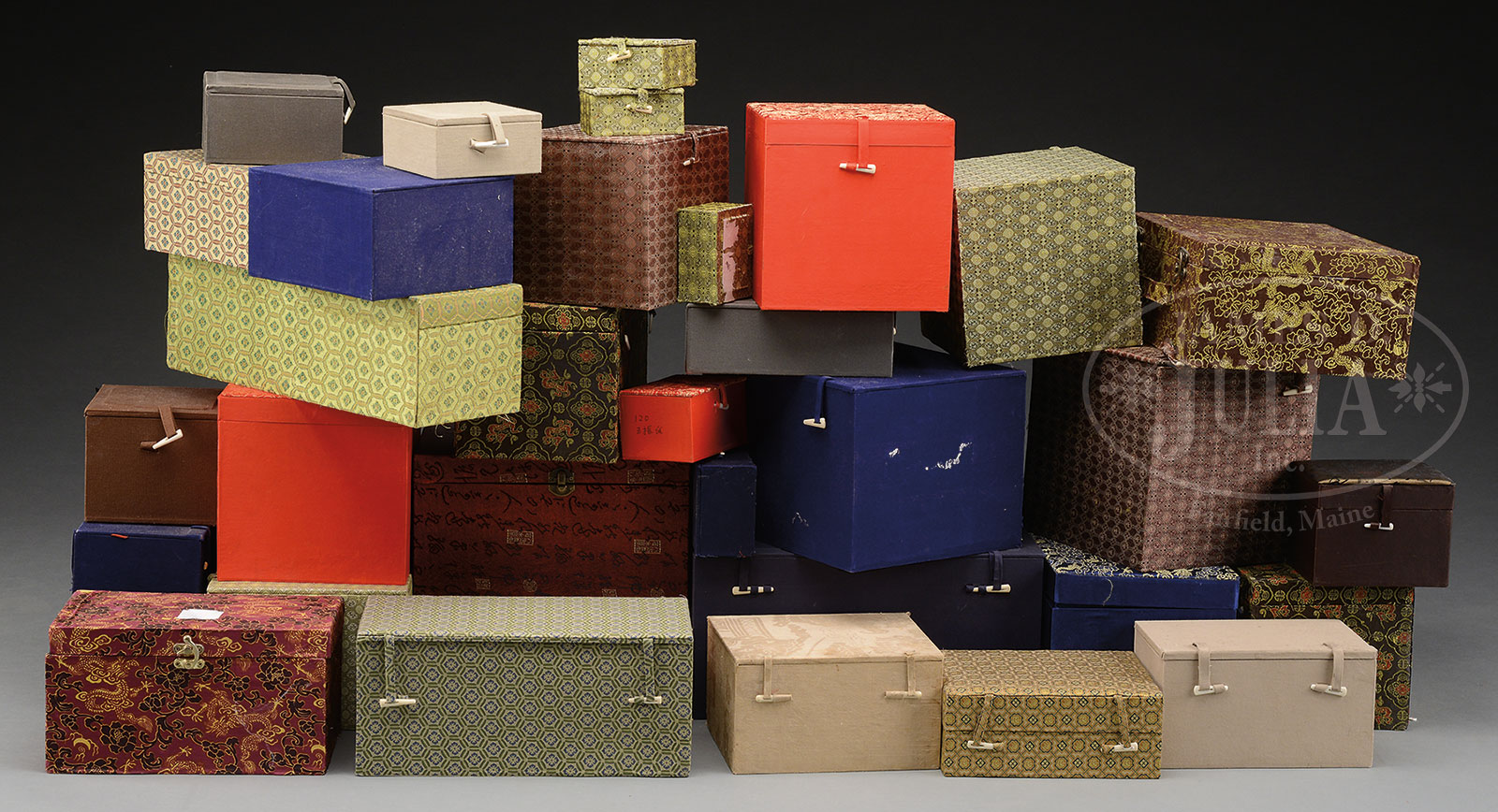 ASSORTED DECORATIVE BOXES.Approximately 30 fabric covered and lined (some silk lined). SIZE: Ranging from 1-1/2″ h x 3-1/2″ w x 2-3/4″ d to 6-3/4″ h x 13-1/2″ w x 7-1/2″ d. CONDITION: Generally very good, some show slight wear. 49256-1 (100-150) – Lot 3660