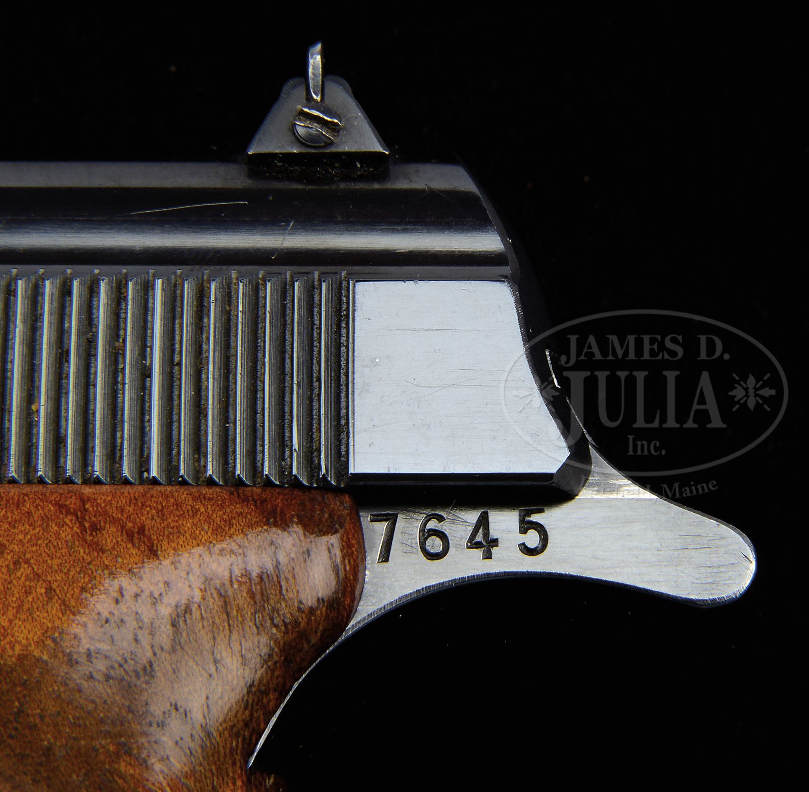 *◊ HIGH CONDITION WALTHER M1936 OLYMPIA, FULL COUNTERWEIGHT ASSEMBLY, TOOL, HOLSTER.SN 7645. Cal. .22 LR. Standard production M1936 Olympia Match pistol, salt blued, with 7-1/2″ (175mm) bbl, single action design with push button magazine release. Vertically adjustable front sight on a shallow serrated ramp with screw fixation. Rear sight is screw adjustable horizontally. Left side of the slide marked with the Walther banner followed by the usual 2-line Walther address and the model denomination “Olympia-Pistole”. Right side of the slide marked “CAL. 22 long rifle” as applied for export. Crown/N markings on right side of bbl & adjacent frame boss. The only markings on the frame are the safety detents “S/F” & SN “7645” applied to left tang. 2-pc wood grips, each secured with 2 screws, with shallow thumb rest on left panel & paneled, bordered checkering. Magazine with wood base extension marked with matching number “645”. Pistol is fitted with a full set of black anodized counterweights that attach to the muzzle & the forward frame. Weights are all marked “76” on left side and all securing square-head bolts are present. Complete with special key to manipulate the square-head bolts & a large black unmarked holster with a thin buckle strap to secure the lid and 2 belt loops. PROVENANCE: Collection of Dr. Geoffrey Sturgess. CONDITION: Exemplary 98-99% orig salt blue, no discernible thinning on & slight discoloration in areas of contact. Small chip missing from bottom of right panel at point of magazine insertion. Excellent condition magazine & wood base. Same high condition applies to set of weights & key. Near excellent condition holster with age related scuffing. All stitching intact. One of the better Olympia pistols with a full set of weights to be offered at auction. 43475-801 LMA (2,000-3,000) – Lot 3663