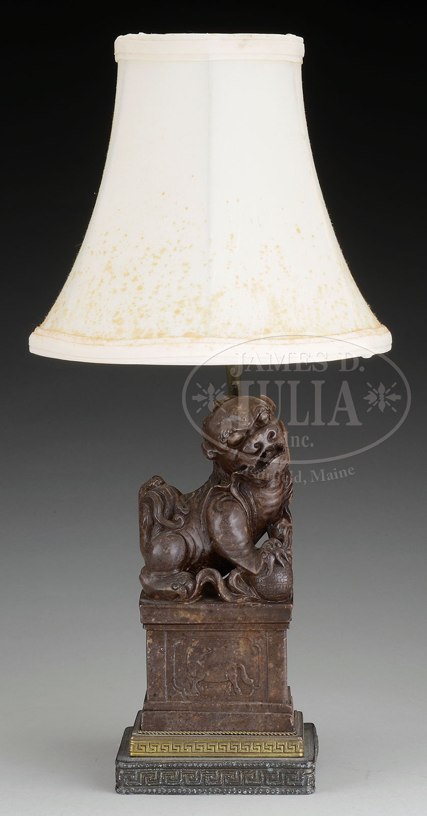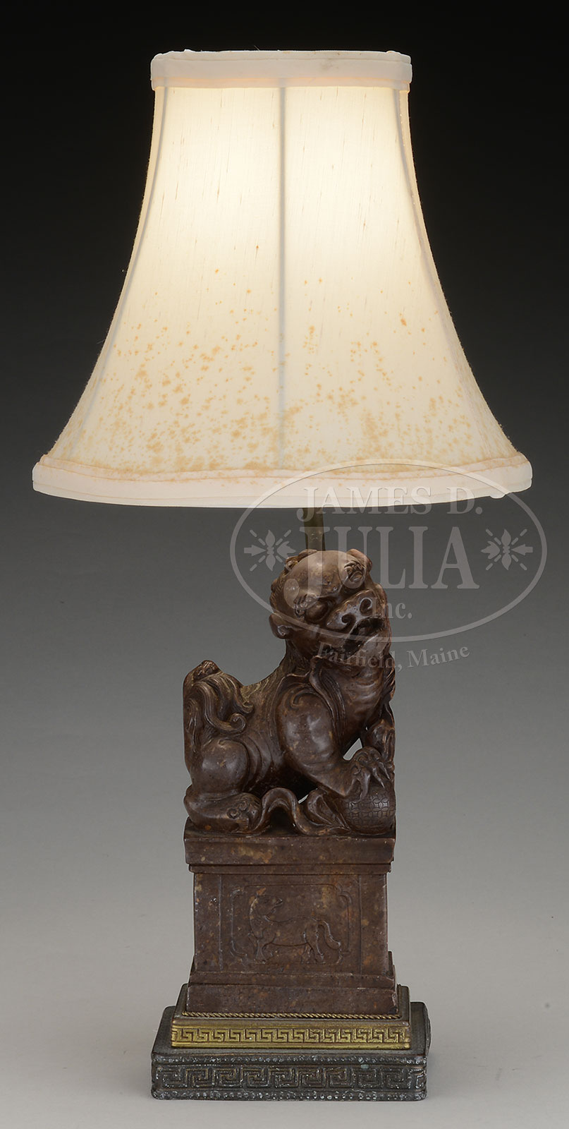 CARVED SOAPSTONE FOO DOG.China. Early 20th century. The well carved sculpture depicting a foo lion with head turned to the side and paw resting on a brocade ball. He is shown atop a rectangular plinth having panels around the outside carved with horses done in shallow relief. Now fitted as a lamp. SIZE: Stone 7-1/2″ h. Lamp 12-3/4″ h (without shade). PROVENANCE: The Webster Family Trust descended from the Rockefeller/Dodge Family. CONDITION: Scattered small chips, staining to the shade. 51508-17 (150-200) – Lot 3666