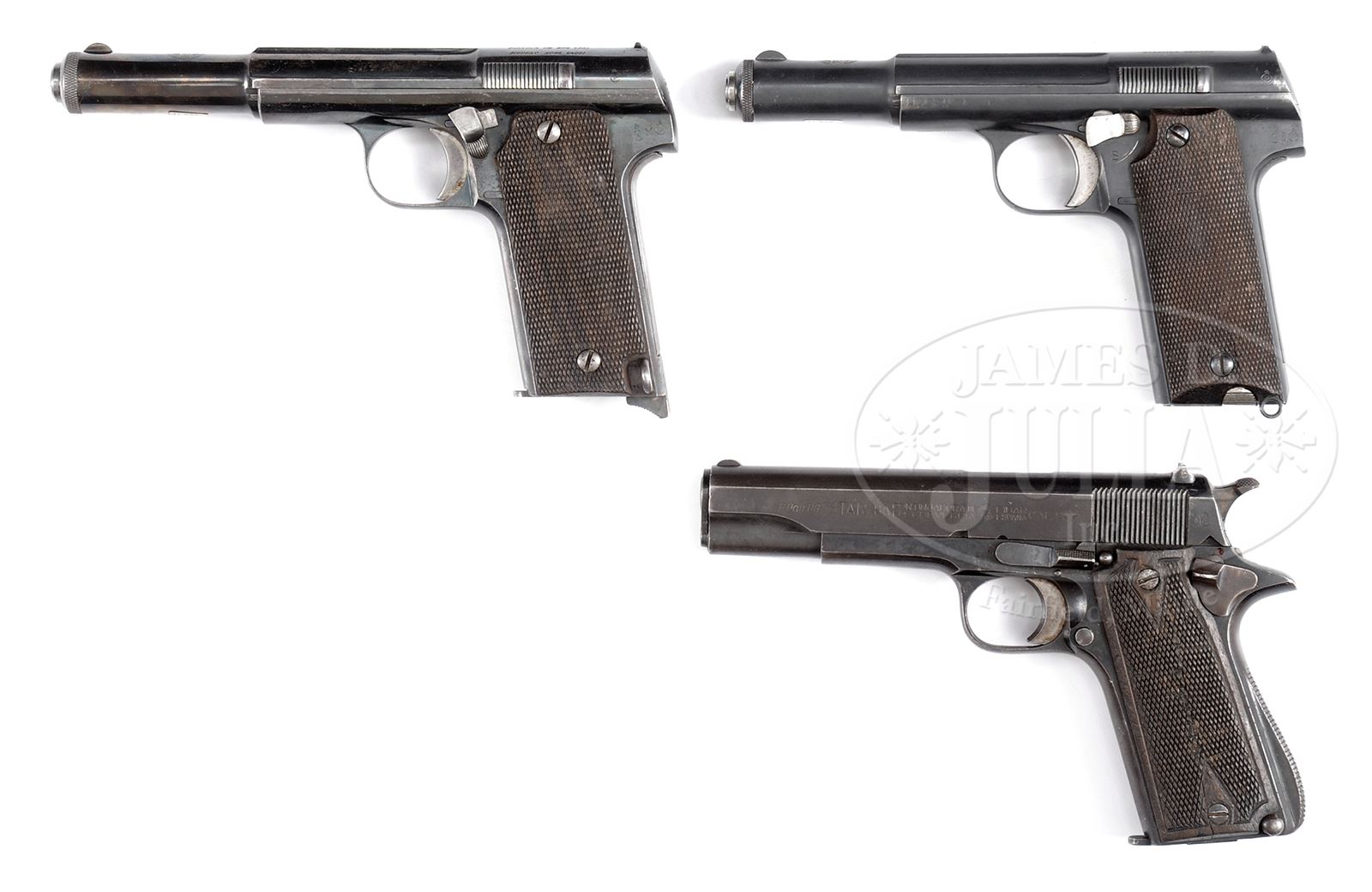 *◊ NAZI PISTOLS MADE IN SPAIN: STAR B, ASTRA M600, ASTRA M400.SN 244294, 9472, 95172. 1) Cal. 9mm Parabellum. Nazi procurement Star Model B with left slide marking “F.Patr08” followed by the usual 2-line Star address. The Eibar proofing triad that includes the N year code, was applied to the left frame. With the automatic pistol proof reappearing on the left side of the slide behind the serrations and the right side of the exposed bbl hood that is also marked “CAL.08.”. Waffenamt acceptance eagle/WaAD20 appearing on the right tang. Lanyard stud missing ring. Bottom of frame marked with “B” and SN “244294”. Fitted with wood checkered grips with prominent diamonds around the screws and border. Standard Star magazine marked “STAR” on floorplate. 2) Cal. 9mm Parabellum. Astra M600, one of approx 10,000 such pistols procured by the Nazis. Standard 5-1/2″ bbl with slide having fixed front & rear sight. Top of slide with split 2-line “UNCETA Y COMPANIA S.A./GUERNICA SPAIN” legend. Circular Astra logo on forward slide. The left tang is marked with Eibar proofing triad with the automatic pistol proof repeated on the rear of the left slide and on the right side of the bbl where exposed in the ejection port. This portion of the bbl is also marked “PIST.PATR.08.” The SN appears on the right side of the slide, right tang and internally under the chamber. Adjacent to the SN on the frame is a double stamped eagle/WaAD20 acceptance. Fitted with uniformly checkered wood grips that are unmarked. Correct Astra magazine whose base was armorer matched “9472” followed by “1”. 3) Cal. 9mm Largo. Astra supplied 6000 Model 400 pistols to the Nazi military in the serial range 92,851 – 98,850. This pistol, SN “95172”, falls in the middle of that range. As per standard production guns, it has a 6″ bbl and a slide with fixed front & rear sight. The front of the slide is marked with Astra U/C logo while the rear of the slide has the usual 4-line Astra address that includes the model designation. The back end of the slide has been drilled to accept a slotted screw, presumably to allow removal of the firing pin. The Eibar proofing triad including the “M” year code was applied to the left tang with the automatic pistol proof having been applied to the left side of the slide and the right side of the bbl where visible in the ejection port. Additional markings are on the bbl include the caliber “9M/M&38” along with the full SN that is repeated on the right side of the slide and the right tang. Safety and trigger are in-the-white and fitted with fully checkered grip panels. Unnumbered Astra magazine with the Astra “E/U” logo on the floorplate. PROVENANCE: Collection of Dr. Geoffrey Sturgess. CONDITION: 1) Approx 40% blue, largely in protected areas, the balance having transitioned to a brown/grey. Same general condition applied to grips that are discolored. Small chips missing from left panel and both have splits near lower screw. VG-excellent magazine. Bright bore with scattered oxidation. Perfect manual mechanics. 2) Approx 95% redip blue. Although external appearance is excellent, extractor has been salt blued as are internal surfaces of slide and frame. Excellent condition grips with sharp checkering and minimal losses. Comparable condition magazine. Bright bore with sharp rifling. Perfect manual mechanics. 3) Approx 65-70% high polish reblue with freckling and thinning in areas of usual contact. Grips are in slightly better condition though checkering, particularly on the right panel, is blunted. VG condition magazine with orig finish. Slightly dulled bore with sharp rifling. Perfect manual mechanics. 43475-203, 43475-204, 43475-205, LMA C&R (2,000-3,000) – Lot 3668