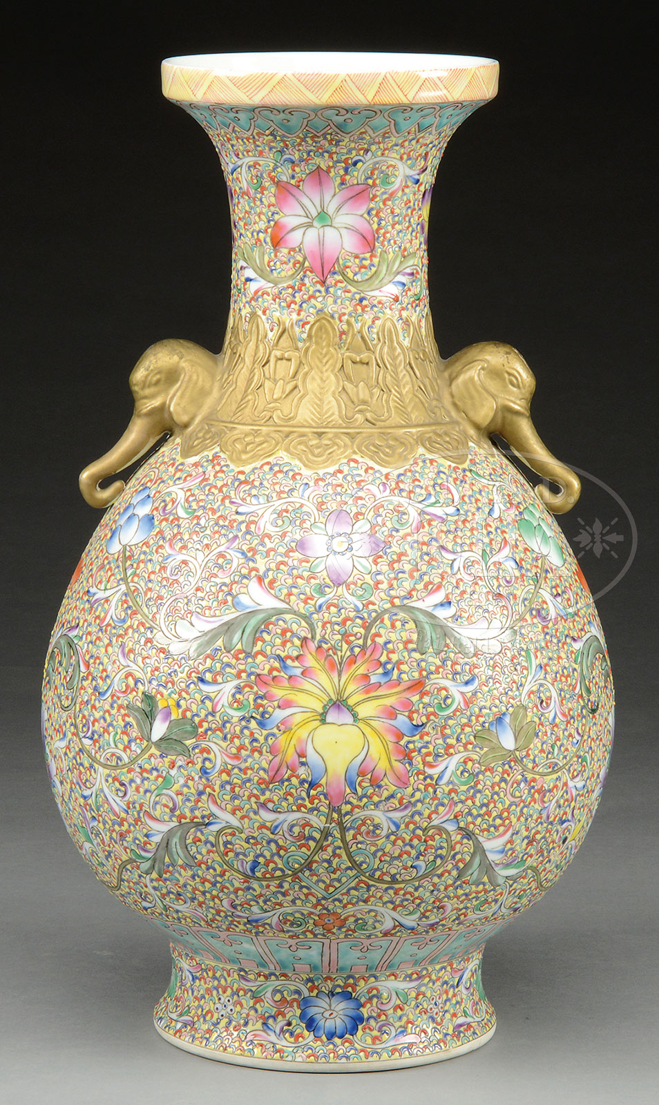 China. 20th century. The large example colorfully painted with a network of blossoming vines accented with a band of relief leaves and ruyi encircling the neck along with two elephant form handles. An apocryphal Qianlong seal to the underside. SIZE: 23″ h. CONDITION: Very good. 52014-3 (300-400) – Lot 3669
