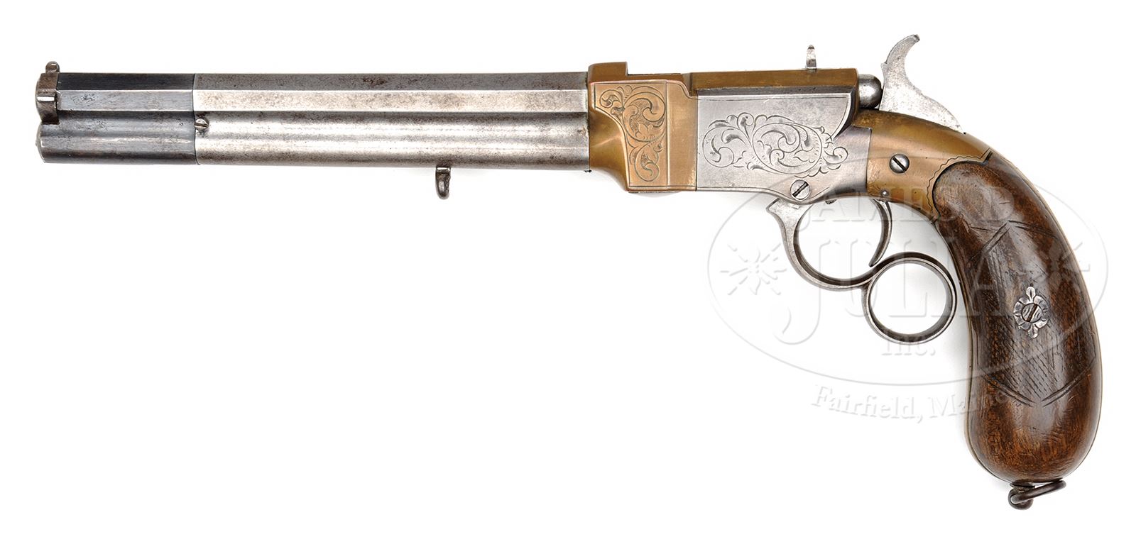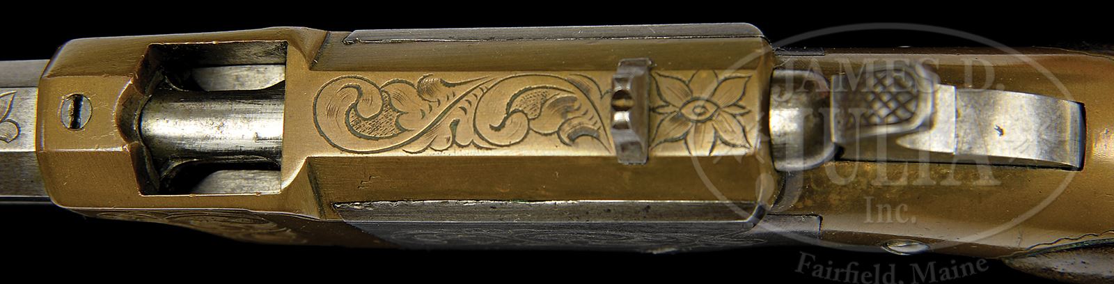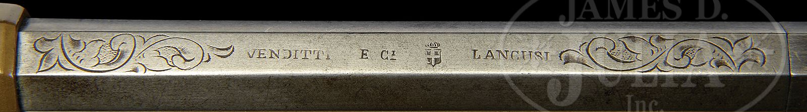 RARE VENDITTI COPY OF A VOLCANIC LEVER ACTION PISTOL.SN NSN. Cal. approximately 10mm Centerfire (a very short caseless bullet/cartridge having the powder and primer contained in the base of the lead bullet). Italian copy of a Navy sized Volcanic pistol with 6-7/8″ oct bbl that has integral magazine with steel follower and loading sleeve like a Volcanic with pinched post front sight and fixed rear sight in top flat of receiver. Top flat of bbl has the left hand address “VENDITTI E CI LANCUSI” with a crown over shield in the middle. Frame of the pistol and elongated bag shaped grip are of brass with steel sideplates. Grip frame has a lanyard stud & ring. Lever & carrier are very similar to a Volcanic. Sideplates, front side flats of receiver, top of receiver, top flat of bbl and backstrap are all very nicely engraved in foliate arabesque patterns with nice shading. Mounted with 2-pc walnut grips with checkered center panels and steel escutcheons. PROVENANCE: Collection of Dr. Geoffrey Sturgess. CONDITION: Very good. Loading sleeve retains about 75% thin orig blue with a couple of small spots of pitting on right side; bbl, magazine & sideplates are gray metal patina; frame, front & backstraps are a very dark brass patina; hammer is a silver patina and lever a dark patina. Grips are sound showing heavy wear and a hand worn patina. Mechanics are fine, strong bore with moderate pitting. 43475-270 JR388 (5,000-10,000) – Lot 3681