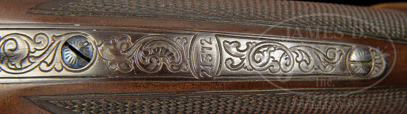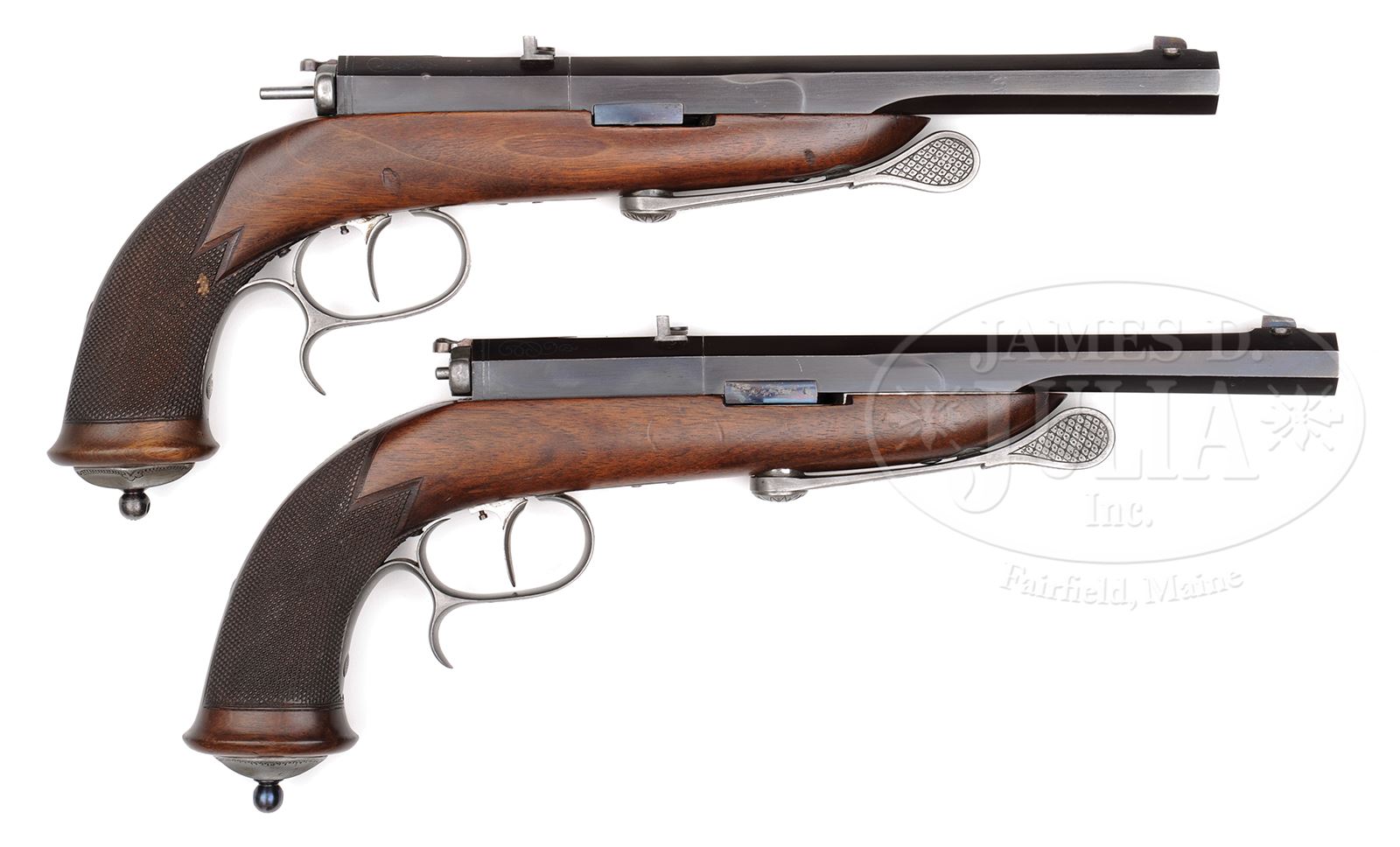 MAGNIFICENT CASED PAIR OF DREYSE NEEDLEFIRE UNDERLEVER DUELLING PATTERN PISTOLS.SN 21372, 21374. Cal. 9.5mm. Superb pair of matching, nearly new Dreyse needlefire pistols with 7.5″ bbls and an overall length of 14.25″ The front sight is drift adjustable; screw fixation allows the rear sight to be more precisely adjusted. The top of the barrel is marked “F.v. DREYSE SOMMERDA”. A light scroll adorns the receiver behind the sight, the backstrap, the grip cap, the underlever and trigger guard. The bbl and receiver are blued. The other metal parts were generally left in the white, or possibly case hardened, for their tone is a very attractive and uniform grey, that highlights the engraving. In keeping with the high-art profile of these guns, every screw head has been engraved. The screw securing the underlever anchor in the forend is fire blued, as is the flat spring on the right side of the barrel and the lanyard at the base of each grip cap. The extractor, mounted on the left side of the barrel, is strawed. To open the breech, the underlever is disengaged from its retaining station and rotated counter clockwise. This action moves the barrel forward, while keeping the extractor in place, cocks the firing pin, then swings the barrel counterclockwise to expose the chamber. On the metal projection in the forend, now uncovered by the bbl, is marked “Med :Patr/ 9.5mm2/24 Pulv.” Opened in this manner, a matching serial number is evident under the barrel, just beyond the forend, and repeated on the inner surface of the underlever. To remove the color case hardened bolt, one simply needs to depress the checkered spring at its rear and retract, pulling the trigger to free the bolt from the receiver. As expected, wear to this area is negligible. The guns are finished with densely grained walnut stocks, finely checkered in a broad area on each side of the grip. The pair of guns come in a nicely fitted oak case, with a brass handle in the center of the lid, brass fittings, that is secured with a centrally keyed lock. The case is lined with dark green felt and compartmentalized for the pair of pistols, and an equally ornate brass tipped cleaning rod. There are also two smaller lidded compartments. One holds some cleaning cloths, the other a pair of oil droppers. PROVENANCE: Dr. Geoffrey Sturgess Collection. CONDITION: The pair of pistols is truly superb. #21372 has a small pressure dent on the left side of the stock above the trigger and two similar size dents on the right side: one above the trigger, the other near the front of the forend. A few diamonds are missing from the right side of the checkering. #21374 has some minor spotting of the fire blued bbl spring and a few scattered handling dings. Neither gun has any appreciable use-related wear. Bores are mirror-bright with sharp rifling. Comparable condition cleaning rod. The lid of the case has a longitudinal crack that runs near the center but does not affect its utility. A second crack, 4″ long, runs along the back on the right side. The felt is well kept, showing only a few scuffs at the usual pressure points and minimal staining. Overall, a stunning set of early Dreyse, needlefire, underlever pistols. 43475-124 LMA111 (7,500-12,500) – Lot 3682
