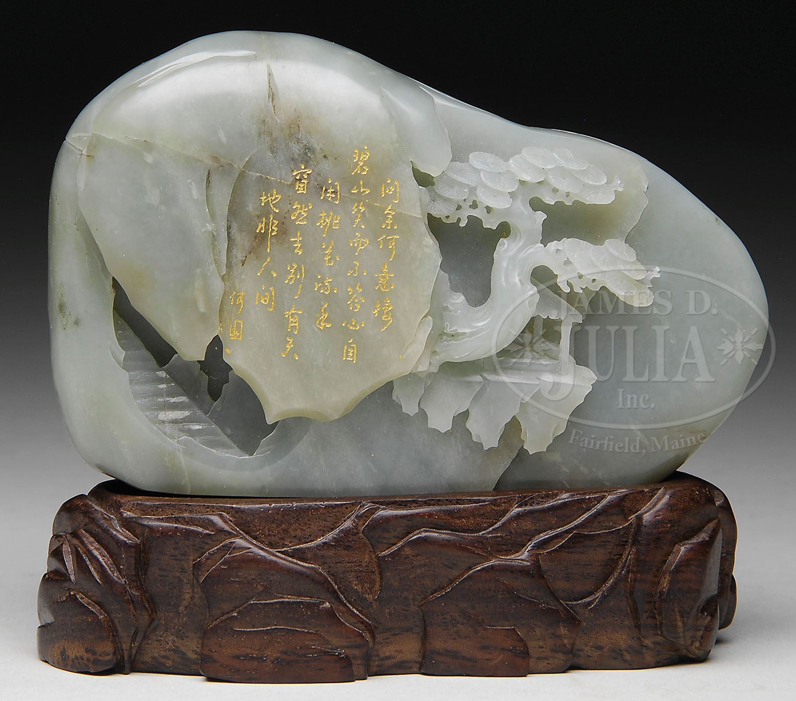 CARVED JADE BOULDER. 20th century, China. Celadon stone deeply carved with figures in a landscape, the reverse deeply carved with conifers and pavilion in a landscape centering an inscription. Accompanied by hardwood stand. SIZE: Stone: 3-1/4″ h x 5″ l. PROVENANCE: Estate & Collection of Philip Kirkeby. CONDITION: Very good overall with natural fissures. 9-28374 (800-1,200)