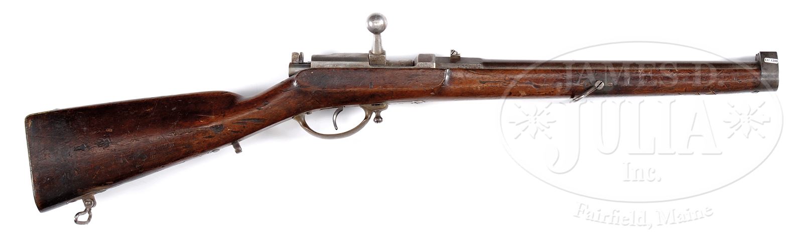 RARE STRETCHER BEARER’S DREYSE MODEL 57 NEEDLEFIRE CARBINE.SN 347. Cal. .14 mm. 15″ rnd bbl with oct chamber, fixed rear sight with flip-up sight for longer range. “Stahl” above chamber (identifying steel barrel) & Crown/FW on left. Multiple Imperial proofs on right side of chamber. Visible numbers are matching except for bolt assembly and stock. “Soemmerda FvD./Mod:57” on left receiver. 1870 date on right receiver. Full walnut stock with Imperial proofs and a large Crown/W on right. Brass buttplate is Unit marked “92. R. 5.” (Braunschweigisches Infanterieregiment Nr 92, weapon no 5) Brass trigger guard. Large added sling swivels which identify this as the stretcher bearer’s model of the M57 Carbine. PROVENANCE: Collection of Dr. Geoffrey Sturgess. Ex Hank Visser Collection. CONDITION: Very good, retaining 30% blue with deep dings on top of bbl. Proper patina on metal and brass with scattered corrosion. Wood has deep dings and nicks overall with a few deep gouges on bottom close to muzzle. There is a 2″ crack on the left side of forearm, forward from the sling swivel mount. Bore is bright and sharp. Mechanics are good. 43475-827 BWS (4,000-6,500) – Lot 3686