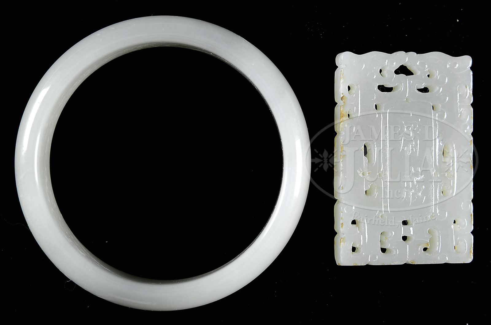 JADE BRACELET AND PLAQUE. 20th century, China. A small bracelet and a rectangular pendant with characters and archaic scrolling. Both of a celadon green color. SIZE: 2-1/4″ dia and 2″ t x 1-1/4″ w. CONDITION: Very good. 9-90692 (400-600)
