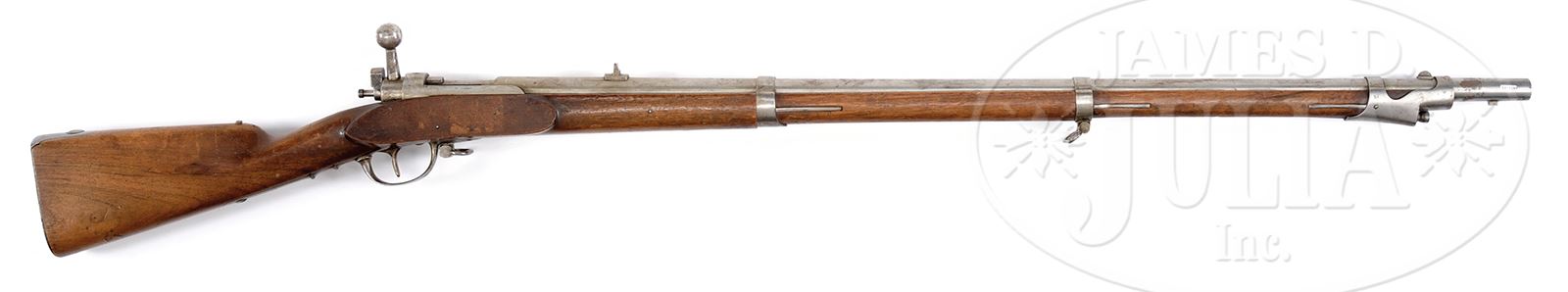 RARE BELGIAN NEEDLEFIRE RIFLE SERIAL NUMBER 12.SN 12. Cal. .14 mm. 36″ bbl with fixed rear sight. Belgian proof on left receiver. Bolt is numbered and matching. Walnut stock with 3 bbl bands. Orig cleaning rod. Sling swivels on middle bbl band and trigger guard. Steel buttplate. PROVENANCE: Collection of Dr. Geoffrey Sturgess. CONDITION: Fine. Metal is in the white with appropriate patina & scattered corrosion. There is an area of red rust on bbl in front of front sight. Wood has scattered dings and dents. Bore has light wear. Mechanics are fine. 43475-1031 BWS (3,000-5,000) – Lot 3694