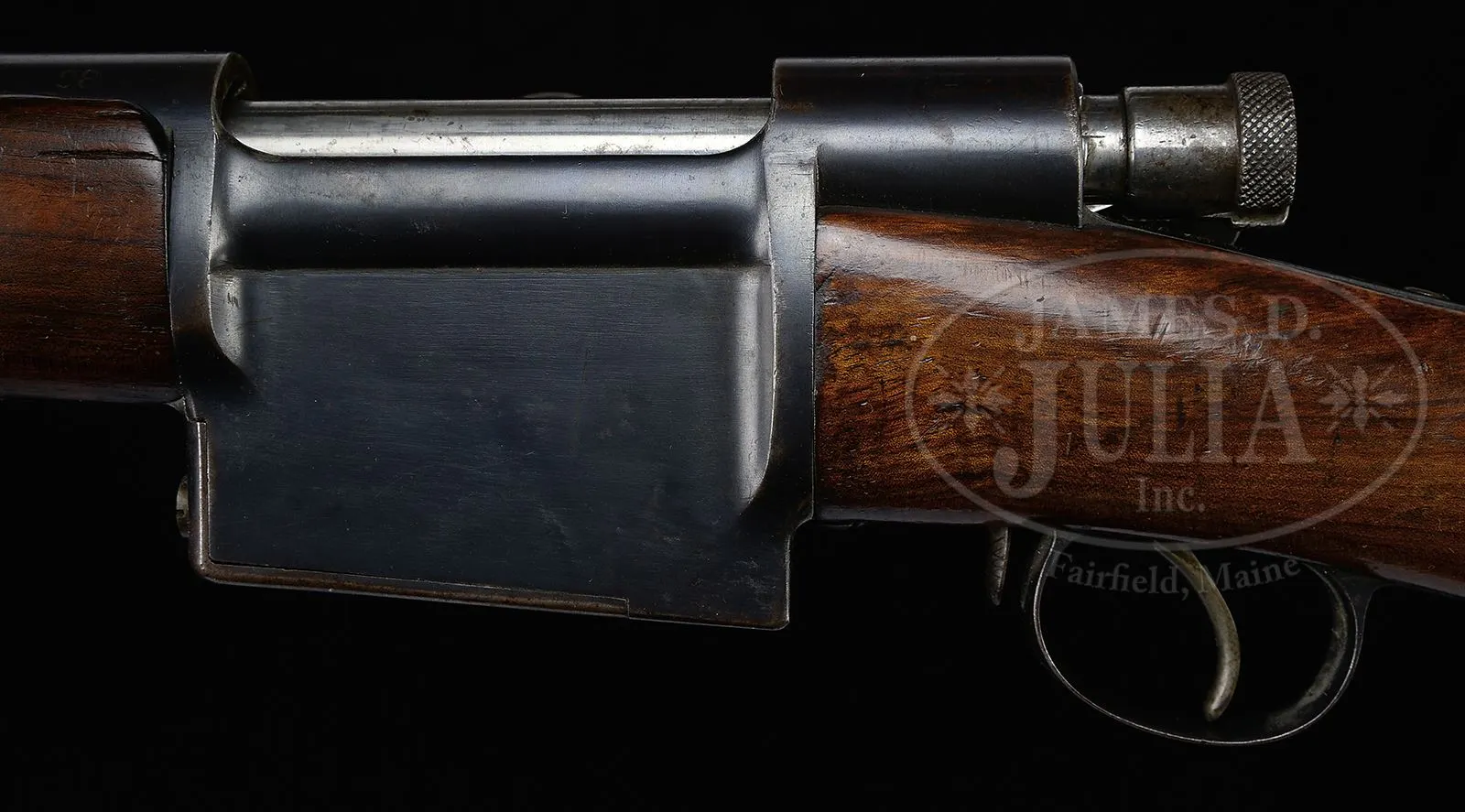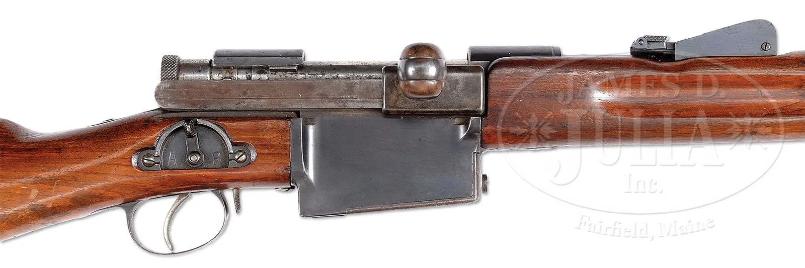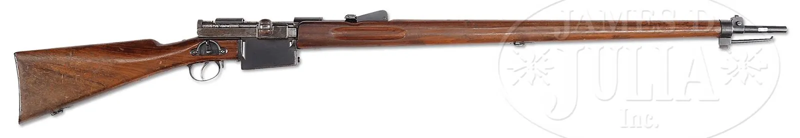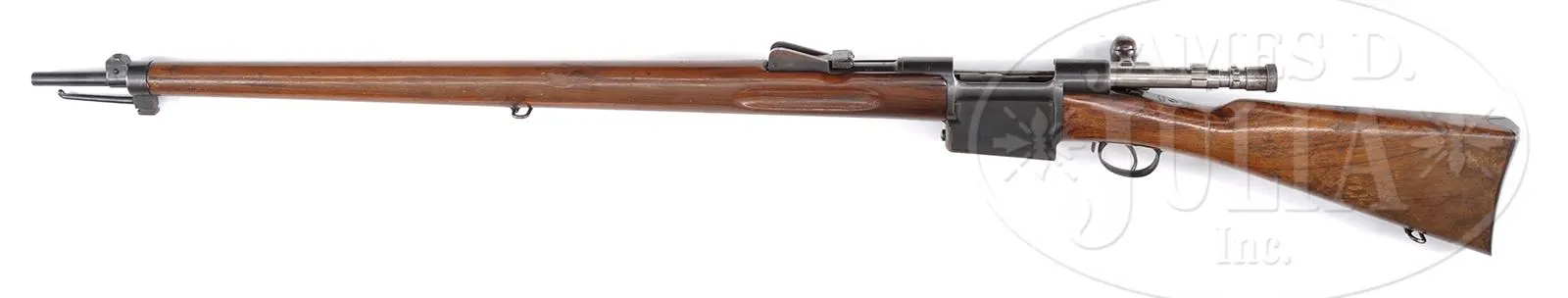 EXTREMELY RARE SWISS SIG MONDRAGON MODEL 1894 “MARCHING FIRE” RIFLE.SN 98. Cal. 5.22mm. 29-1/2″ round bbl, blue finish, walnut stocks. The Type IIA Mondragon is an extremely rare rifle with a straight pull bolt that was made by SIG of Switzerland to the advanced concepts of Gen. Manuel Mondragon of the Mexican Army. It was developed to fire a unique small caliber high velocity cartridge using an “en bloc” clip loading type magazine as later implemented in the Garand. The unique “piston” cartridge for this rifle incorporated a cartridge case with internal case diameter washer (piston) attached to the base of the small (5.2 mm dia) bullet which was used to transmit the initial gas impulse to the bullet over the initial bullet/piston travel of ca. 20 mm before the piston/bullet assembly separated as the piston washer impacted the inside of the shoulder of the cartridge case. The bolt has three separate sets of locking lugs: one set is around front of the bolt body, a second set is at the rear of the bolt body, the third set is around the cocking knob assembly. More interesting is the 3-position selector switch mounted on the right side, just above the trigger, marked “A” (safe), “L” (normal fire position),”R” (rapid fire). The idea was to be able to fire the gun by pulling the trigger normally or fire by simply driving the bolt forward (not touching the trigger). Most of the quick firing was to be done while advancing, hence the “marching fire” appellation for this rifle. The rifle has a 2-pc stock with a machined receiver and a very intricately designed bolt. The fore-end is a single piece of wood that wraps around the bbl, much in the manner of a Mannlicher M1897/03 Carbine. The forward bbl band & lug are reminiscent of a Swiss K31. In the center of the forend is a rotating sling swivel. The rear sight is graduated from 6-20 and has a flip-up option for 400 meters. SN “98” appears at the rear of the bbl, left side of the receiver, on the follower and on the bolt handle. On the rear tang is the manufacturer identification: “FAB.D’ARMES/NEUHAUSEN”. The buttstock is fitted with a single sling swivel and a metal buttplate. Although very few of these rifles were made, the prospect of marching rapid fire was a novel consideration and laid the groundwork to explore automatic loading selective fire. PROVENANCE: Collection of Dr. Geoffrey Sturgess. CONDITION: Near excellent with approx 95% orig rust blue finish showing speckling and fine patina as one would expect in an experimental/military gun of this vintage. The sides of the rifle present extremely well with much of the patina confined to the in-the-white bolt assembly and the bottom of the magazine well. Wood retains a commensurate amount of orig varnish with some flaking near bottom of buttstock and scattering of handling dings as one might expect after over 100 years. Bore is dark with seemingly sharp rifling. Perfect manual mechanics. An extraordinarily rare rifle by any standard and one that could easily be the centerpiece of an advanced collection. 43475-922 LMA (20,000-30,000) – Lot 3705