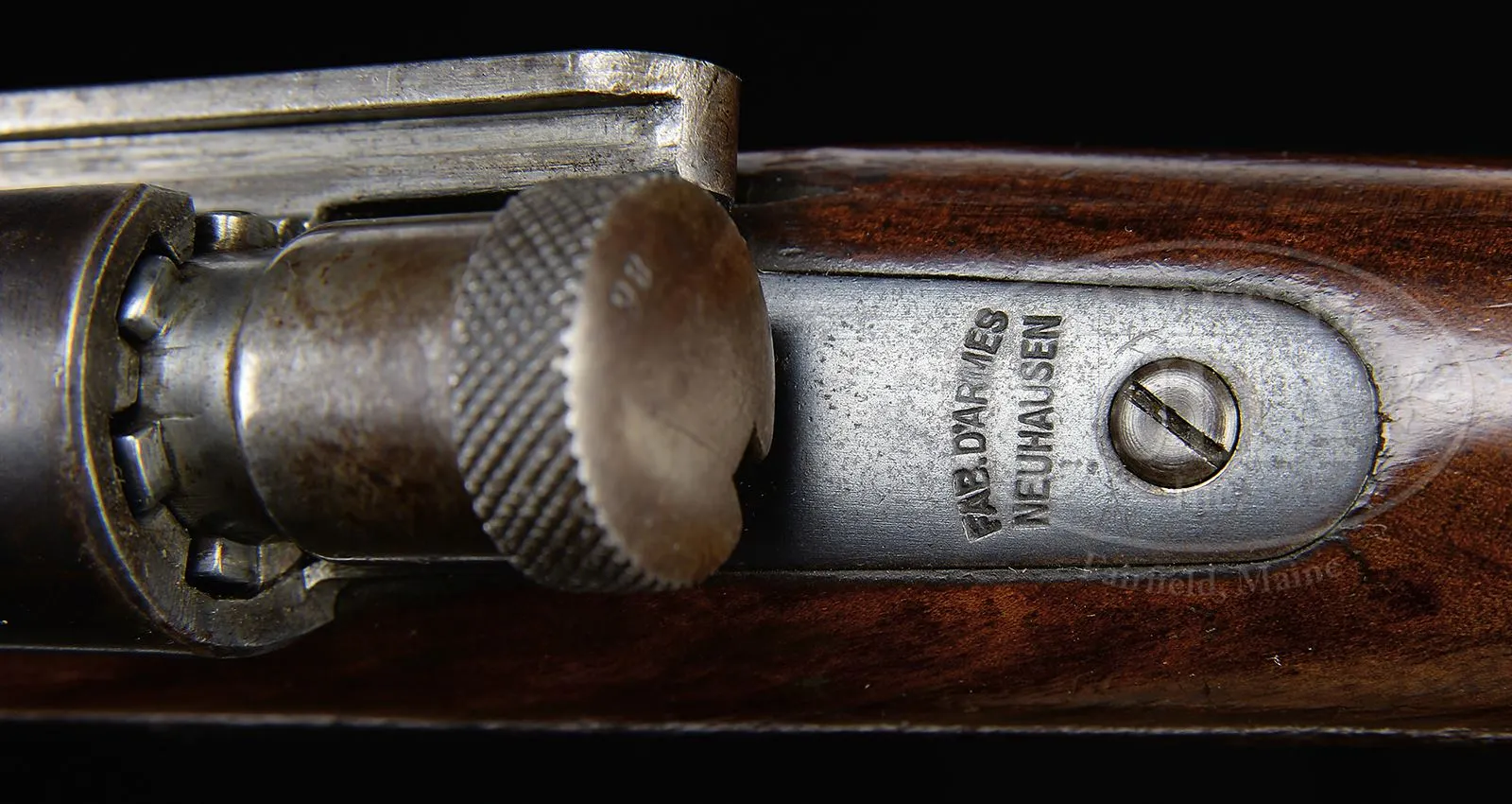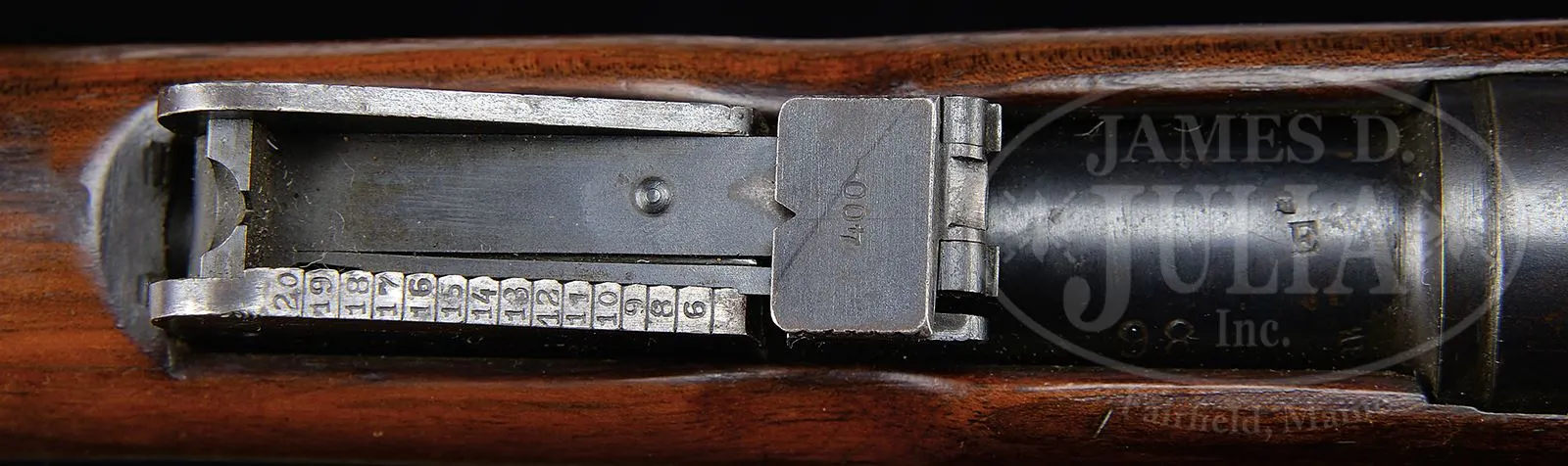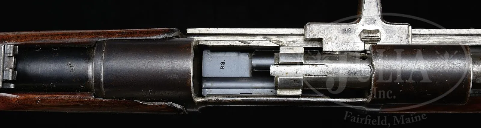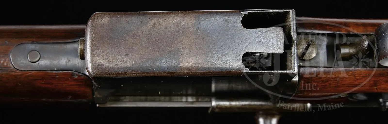 EXTREMELY RARE SWISS SIG MONDRAGON MODEL 1894 “MARCHING FIRE” RIFLE.SN 98. Cal. 5.22mm. 29-1/2″ round bbl, blue finish, walnut stocks. The Type IIA Mondragon is an extremely rare rifle with a straight pull bolt that was made by SIG of Switzerland to the advanced concepts of Gen. Manuel Mondragon of the Mexican Army. It was developed to fire a unique small caliber high velocity cartridge using an “en bloc” clip loading type magazine as later implemented in the Garand. The unique “piston” cartridge for this rifle incorporated a cartridge case with internal case diameter washer (piston) attached to the base of the small (5.2 mm dia) bullet which was used to transmit the initial gas impulse to the bullet over the initial bullet/piston travel of ca. 20 mm before the piston/bullet assembly separated as the piston washer impacted the inside of the shoulder of the cartridge case. The bolt has three separate sets of locking lugs: one set is around front of the bolt body, a second set is at the rear of the bolt body, the third set is around the cocking knob assembly. More interesting is the 3-position selector switch mounted on the right side, just above the trigger, marked “A” (safe), “L” (normal fire position),”R” (rapid fire). The idea was to be able to fire the gun by pulling the trigger normally or fire by simply driving the bolt forward (not touching the trigger). Most of the quick firing was to be done while advancing, hence the “marching fire” appellation for this rifle. The rifle has a 2-pc stock with a machined receiver and a very intricately designed bolt. The fore-end is a single piece of wood that wraps around the bbl, much in the manner of a Mannlicher M1897/03 Carbine. The forward bbl band & lug are reminiscent of a Swiss K31. In the center of the forend is a rotating sling swivel. The rear sight is graduated from 6-20 and has a flip-up option for 400 meters. SN “98” appears at the rear of the bbl, left side of the receiver, on the follower and on the bolt handle. On the rear tang is the manufacturer identification: “FAB.D’ARMES/NEUHAUSEN”. The buttstock is fitted with a single sling swivel and a metal buttplate. Although very few of these rifles were made, the prospect of marching rapid fire was a novel consideration and laid the groundwork to explore automatic loading selective fire. PROVENANCE: Collection of Dr. Geoffrey Sturgess. CONDITION: Near excellent with approx 95% orig rust blue finish showing speckling and fine patina as one would expect in an experimental/military gun of this vintage. The sides of the rifle present extremely well with much of the patina confined to the in-the-white bolt assembly and the bottom of the magazine well. Wood retains a commensurate amount of orig varnish with some flaking near bottom of buttstock and scattering of handling dings as one might expect after over 100 years. Bore is dark with seemingly sharp rifling. Perfect manual mechanics. An extraordinarily rare rifle by any standard and one that could easily be the centerpiece of an advanced collection. 43475-922 LMA (20,000-30,000) – Lot 3705