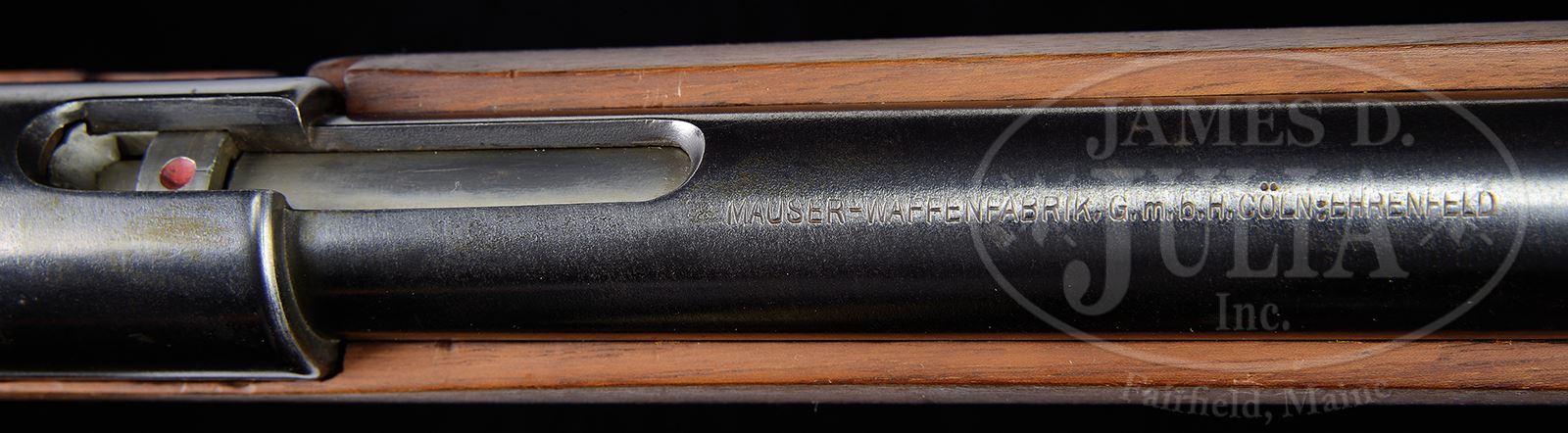MAUSER SEMI-AUTOMATIC PROTOTYPE RIFLE ACTION, MADE FOR MAXIMILAN J. OCHES, IN COLN, EHRENFELD.SN NSN. Unique pneumatic semi-automatic rifle action made by Mauser on behalf of U.S. citizen Maximilan J. Oches, then a resident of Cleveland OH, 1916, for patent purposes. Unmarked 18″ bbl with no sights having a compressed air actuation extension centered 4-3/4″ forward of the receiver that is marked on top with the single line address “MAUSER-WAFFENFABRIK, G.m.b.H. COLN: EHRENFELD”. At the back of the receiver is a screwed-on cap. The pneumatic mechanism functions via a long operating rod housed in a separate in-the-white tube below the bbl and chamber. When the bolt is fully closed it may be locked in place by rotating the knurled forward extension of the operating rod counterclockwise. Rotating the housing clockwise exposes a red dotted indicator over the bolt, indicative of the fire ready status. After the bolt and operating rod are pushed fully to the rear the pneumatic effect can be appreciated as the parts cycle forward, nearly halfway to battery. This mechanism is for patent purposes only, as a trigger mechanism has not been implemented, despite the attached trigger guard. Plain wood stock without checkering or varnish and smooth metal buttplate. PROVENANCE: Previously part of the factory collection of the Mauser Coln (Koln – Cologne) Ehrenfeld plant founded by Alfons Mauser (son of Wilhelm Mauser) to manufacture pressed steel wares prior to WWI but which collaborated with Mauser Oberndorf in munitions production during WWI. Collection of Dr. Geoffrey Sturgess. CONDITION: Approx 85-90% with fading on the bbl and touchup over the receiver and trigger guard. The in-the-white tubing that houses the operating rod with only minimal oxidative changes. Stock has minimal oil staining and only a few superficial handling dings. A unique prototype mechanism made by Mauser and previously unknown to this cataloger. 43475-1021 LMA (5,000-10,000) – Lot 3707