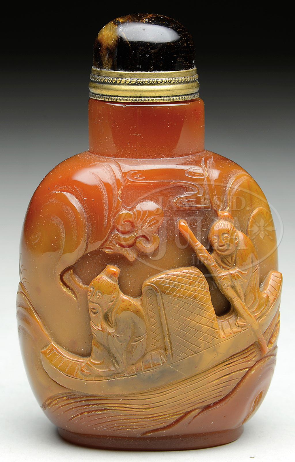 AGATE SNUFF BOTTLE. 20th century, China. Well hollowed. Butterscotch and amber colored stone. Carving of a scholar in a boat and a horse before a city gate. SIZE: 2-3/4″ t. CONDITION: Cap absent, otherwise very good. 7-70488 (300-500)