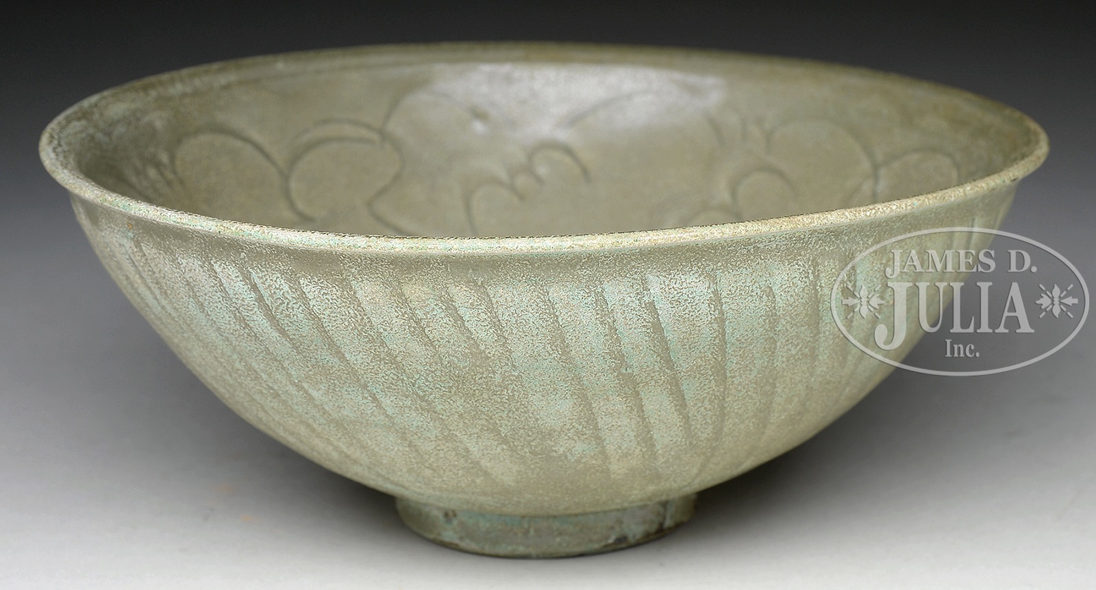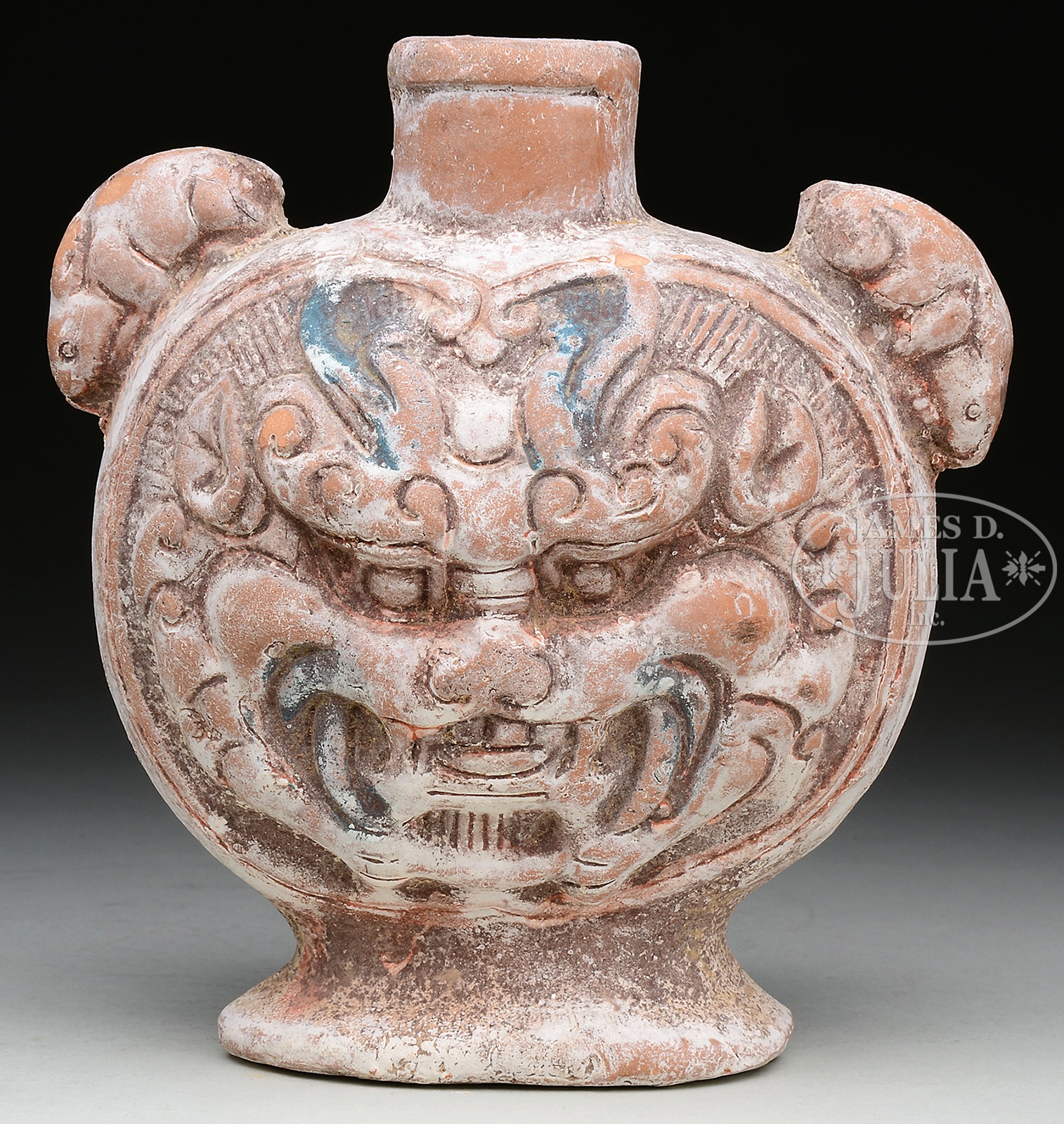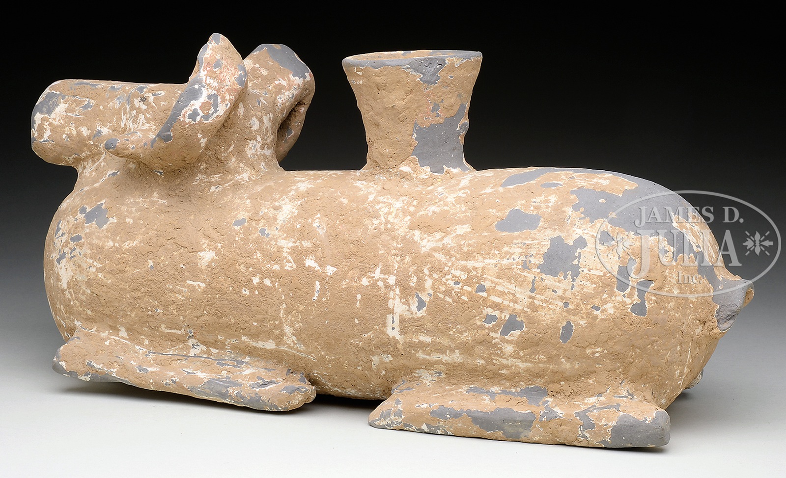 GROUP OF POTTERY.1) Carved celadon bowl. China. The Sung style pottery bowl with carved blossoms around the interior and ribbed design around outside wall. All finished under a lightly applied celadon glaze. 2) pottery ram form container. Possibly Han Dynasty, China. Modeled as a recumbent ram with a funnel on its back. 3) Pottery Tang style flask. China. The flattened sides with monster head faces, the shoulder with rabbit handles. 4) Han style pottery statue. China. The large statue wearing a tied robe with right hand raised and stern expression to the face. Traces of pigment still visible throughout, and writing to the bottom of each foot. SIZE: 1) 7-1/2″ h. 2) 17″ w. 3) 6-1/2″ h. 4) 18-1/2″ h. CONDITION: 1) Very good. 2) Wear to glaze revealing the gray ceramic underneath. Some possible restorations. 3) Age wear, but good. 4) Dirt encrustation to much of the exterior, scattered losses to the pigment and a chip to the tip of the nose. 50270-56, 50270-62, 50270-63, 50270-64, (800-1,200) – Lot 3709