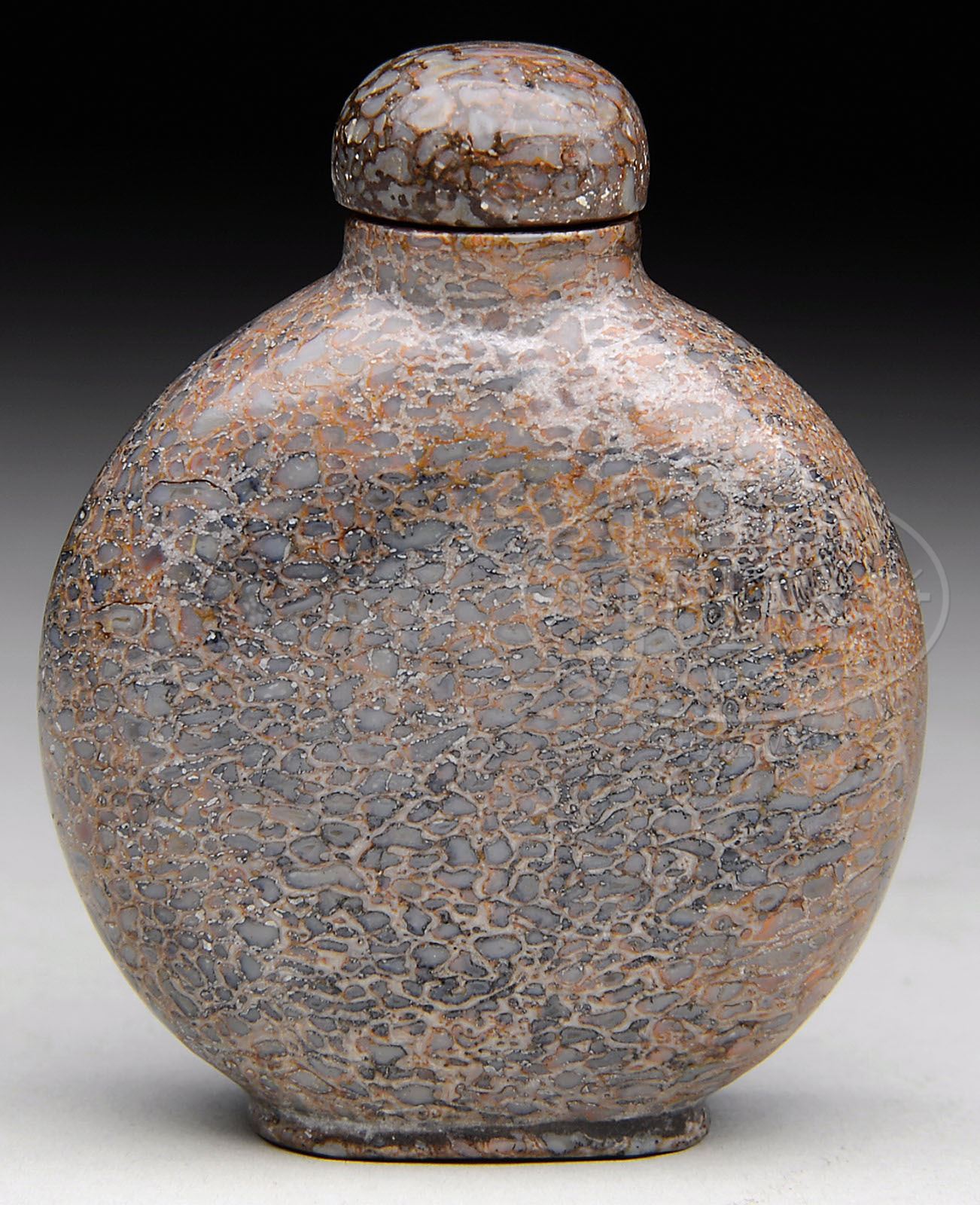PUDDINGSTONE SNUFF BOTTLE. 19th century, China. Flattened rounded form. Very well hollowed. With top. SIZE: 1-3/4″ t. CONDITION: Very good. 7-74212 (200-300)