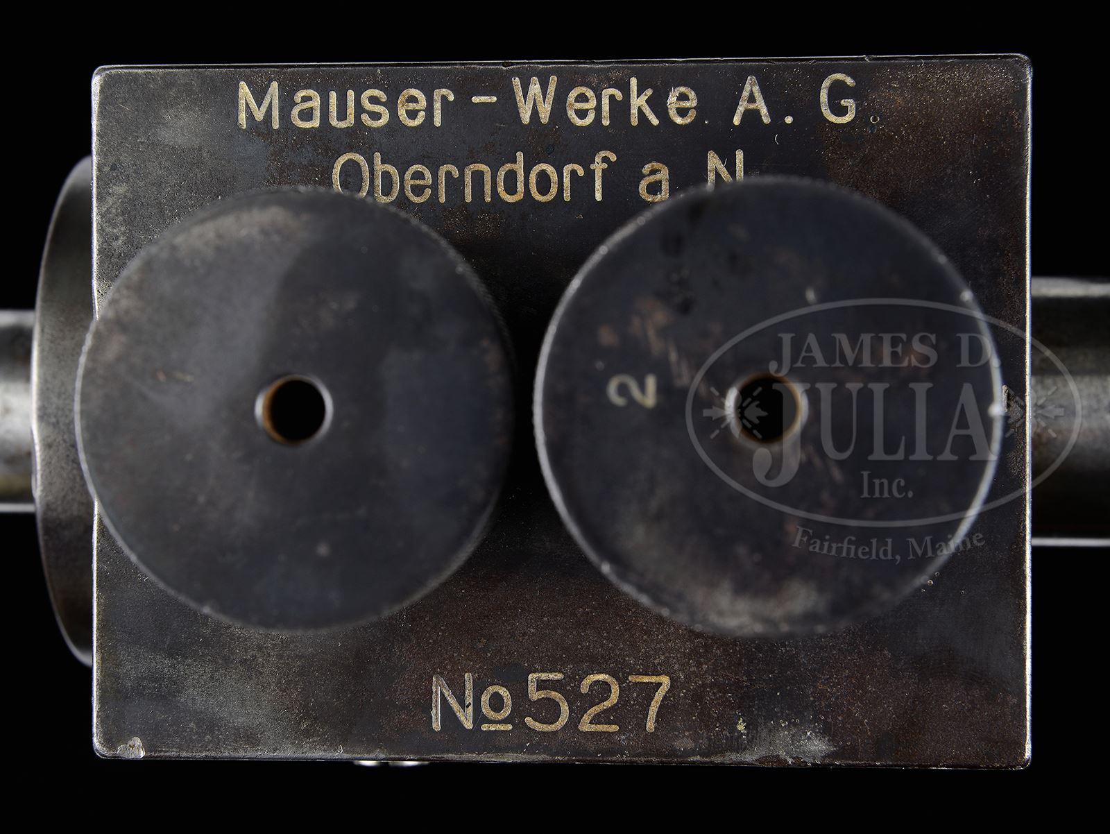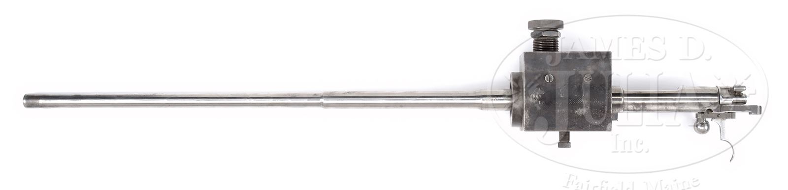 *◊ RARE MAUSER DOUBLE OVER CHAMBER PISTON GEW98 PRESSURE TEST GUN.SN 527. Cal. 7.92 MM. Three step 30″ quick change bbl with “Made in Germany” on top of first step, “Apparat No 527 Kal.7,9 X 8,2 X 240” on top of second step, “L1” on top of third step. Cubical pressure test chamber with “Mauser-Werke A.G./Oberndorf a.N.” on top. Dual matching numbered pressure port nuts that are numbered 1 & 2 on top. Threaded pressure port holes are also numbered 1 & 2. Matching numbered receiver. Bolt assembly is unnumbered. Long trigger. PROVENANCE: Collection of Dr. Geoffrey Sturgess. CONDITION: Fine. Sides of bbl and pressure chamber have stippling from being clamped in a vise. Bbl has scattered light corrosion. Blue on pressure chamber and nuts is 80% with some light pitting. Receiver has areas of corrosion mostly on bottom and in chamber port. Bore is bright and sharp. 43475-10 BWS (5,000-10,000) – Lot 3714