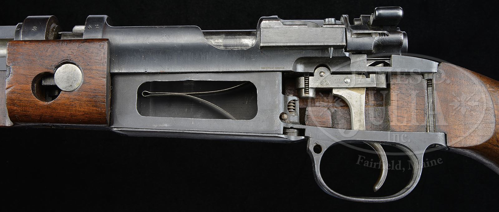 *◊ RARE REICHSWEHR MAUSER GEWEHR 98 CUTAWAY RIFLE, WITH FLAT TANGENT SIGHTS FOR HEAVY BALL AMMUNITION.SN 281. Cal. 7.92mm. Very scarce early Third Reich training rifle. The butt has been cut off by the factory in production midway through the small of the stock. Rear sight only is coded “S42” for Mauser Oberndorf with correct Waffenamt inspection marks “Eagle/WaA63”. No other Waffenamts appear on this rifle, except for “Eagle/H.Za.Jt 10” which is stamped under the forestock below the rear sight. Rifle is SN “281” and is 100% matching, although many components show evidence of being renumbered when the rifle was assembled at the Ingolstadt Ordnance Depot (Eagle/H.Za.Jt 10). No sling or cleaning rod. Missing the small retaining screw at the front of the trigger guard assembly and the cleaning rod. The receiver cutaway section has eliminated the manufacturer’s marking. PROVENANCE: Collection of Dr. Geoffrey Sturgess. CONDITION: Retains 98% of the finish applied at the depot. Stock has had its butt removed during conversion to cutaway. . Remaining stock has minor abrasions consistent with classroom use as a training aide. Trigger guard is bent slightly inward at approx 6 o’clock. The depot marking on the forestock is particularly crisp & legible. This rifle is in extremely fine condition given its age and wartime use. 43475-889 JJW1 (6,000-10,000) – Lot 3716