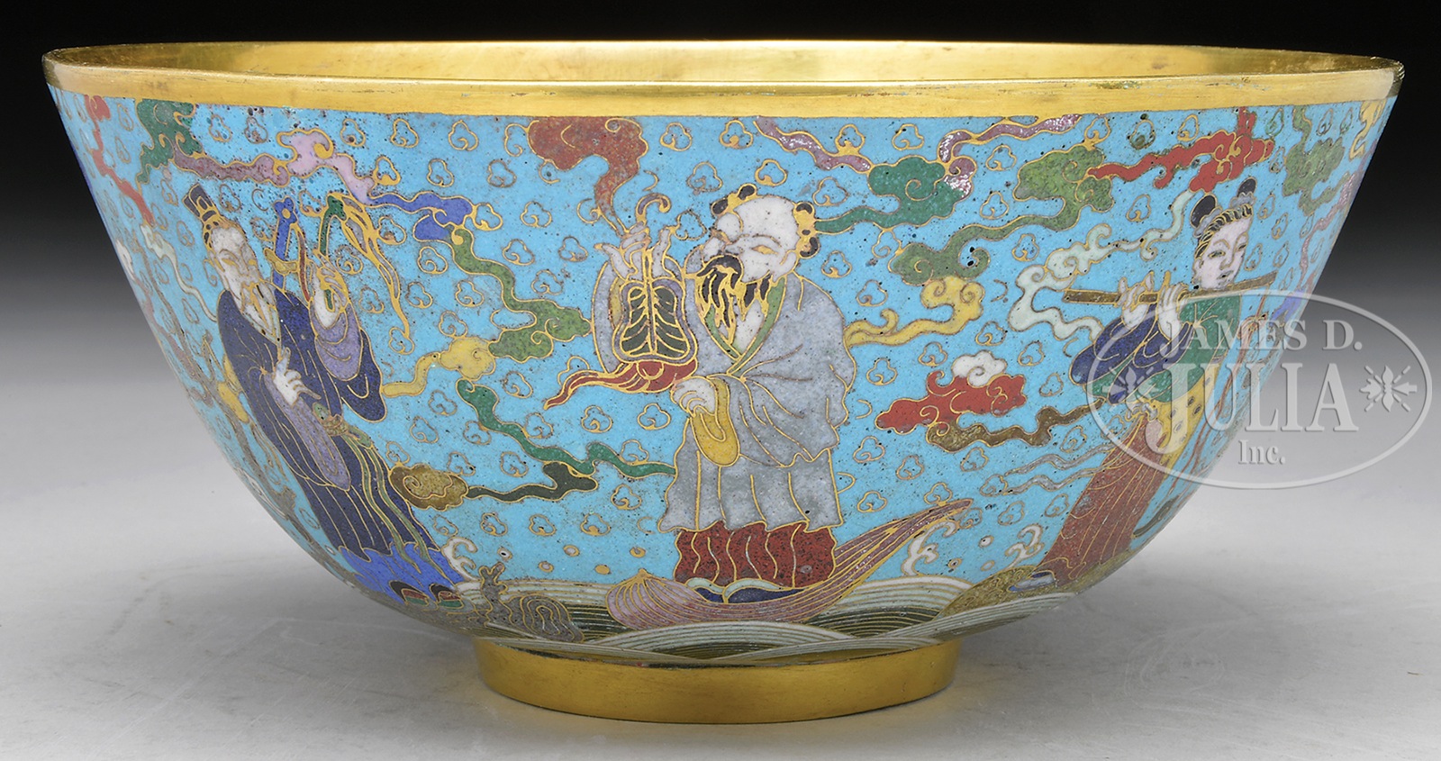 CLOISONNE BOWL.20th century, China. Heavy gilt interior. Decoration of the eight immortals on a turquoise ground. Ching Tai mark on base. SIZE: 7-3/8″ dia. CONDITION: Very good with light abrasion to interior of bowl on gilded surfaces. 7-73950 (400-800) – Lot 3719