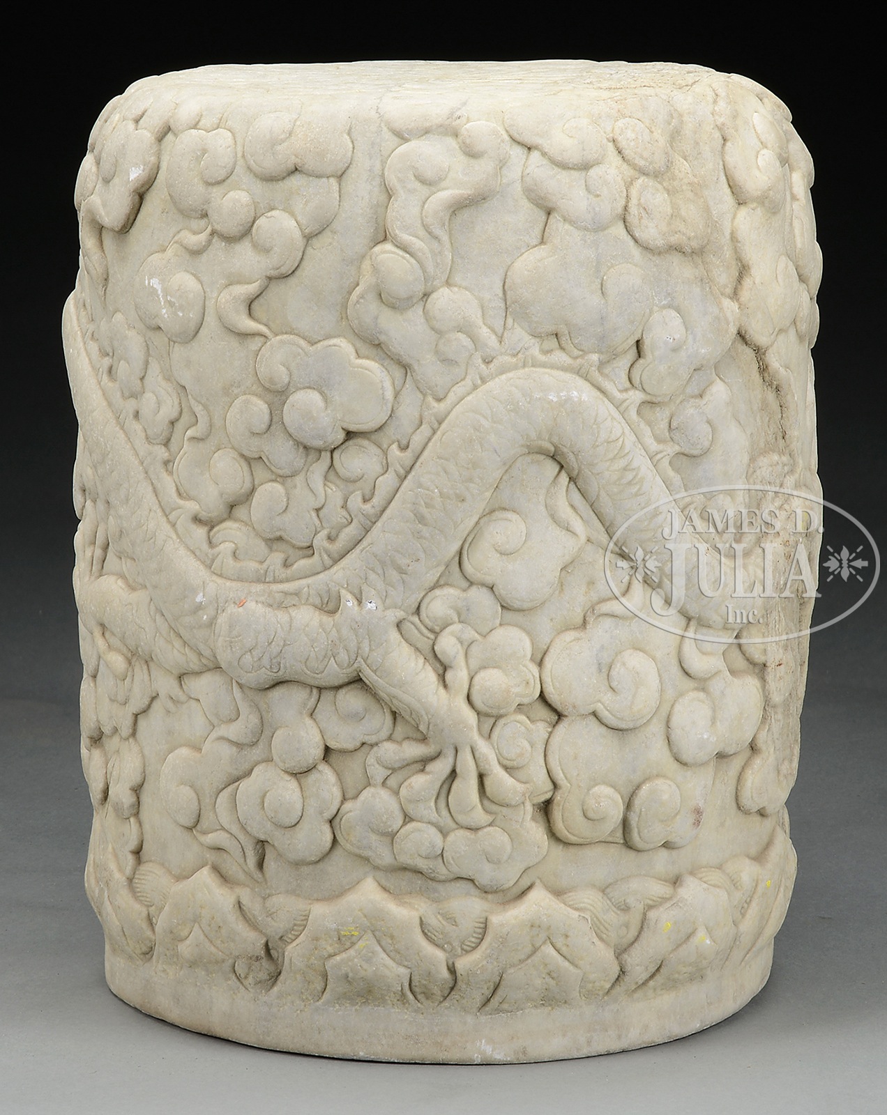 CARVED MARBLE GARDEN SEAT WITH DRAGON.20th century, China. Made in barrel form with deeply carved design of a dragon chasing a flaming pearl on a ground of stylized clouds. SIZE: 18-1/2″ h. CONDITION: Some chipping to the raised decoration. 50270-20 (300-500) – Lot 3728