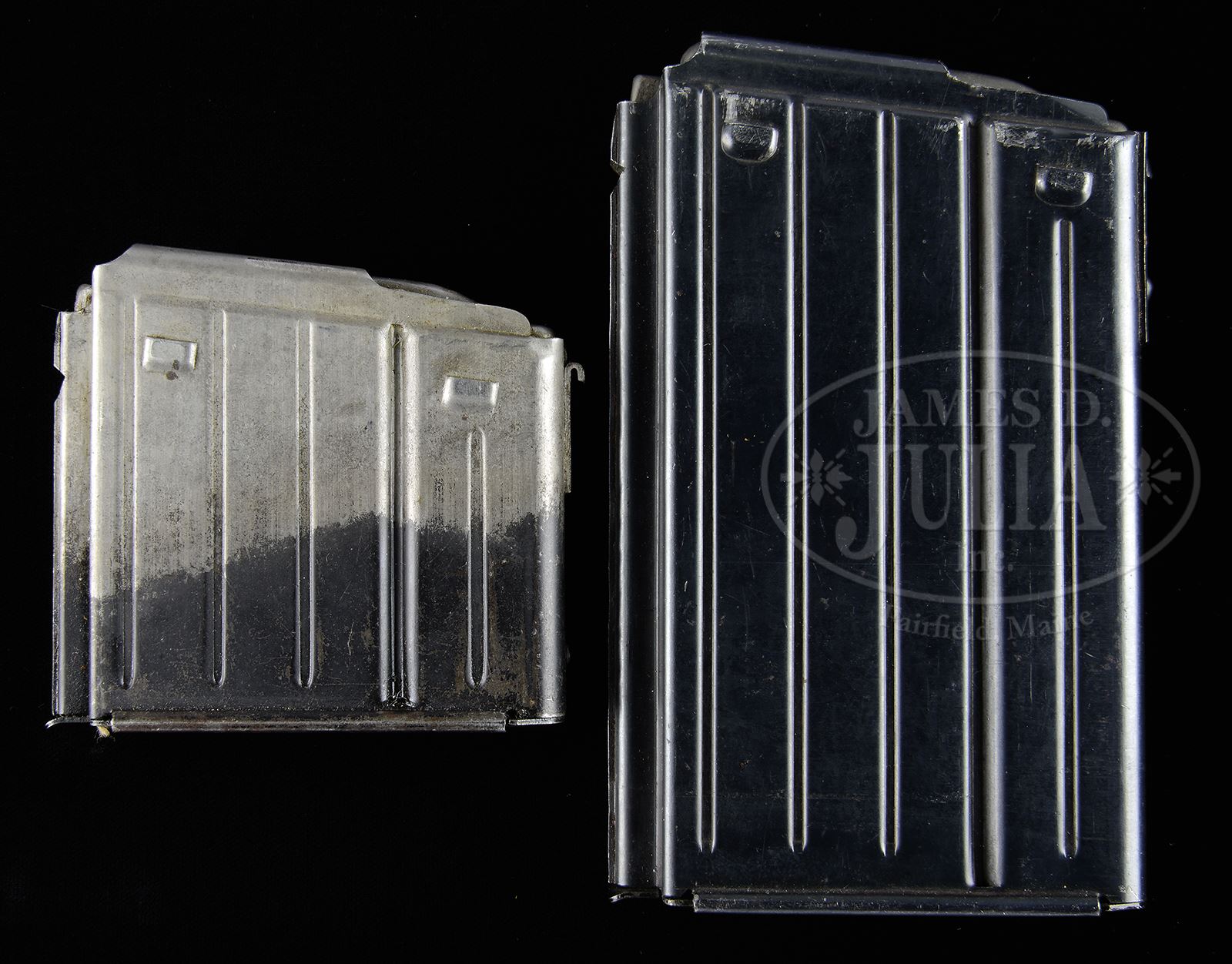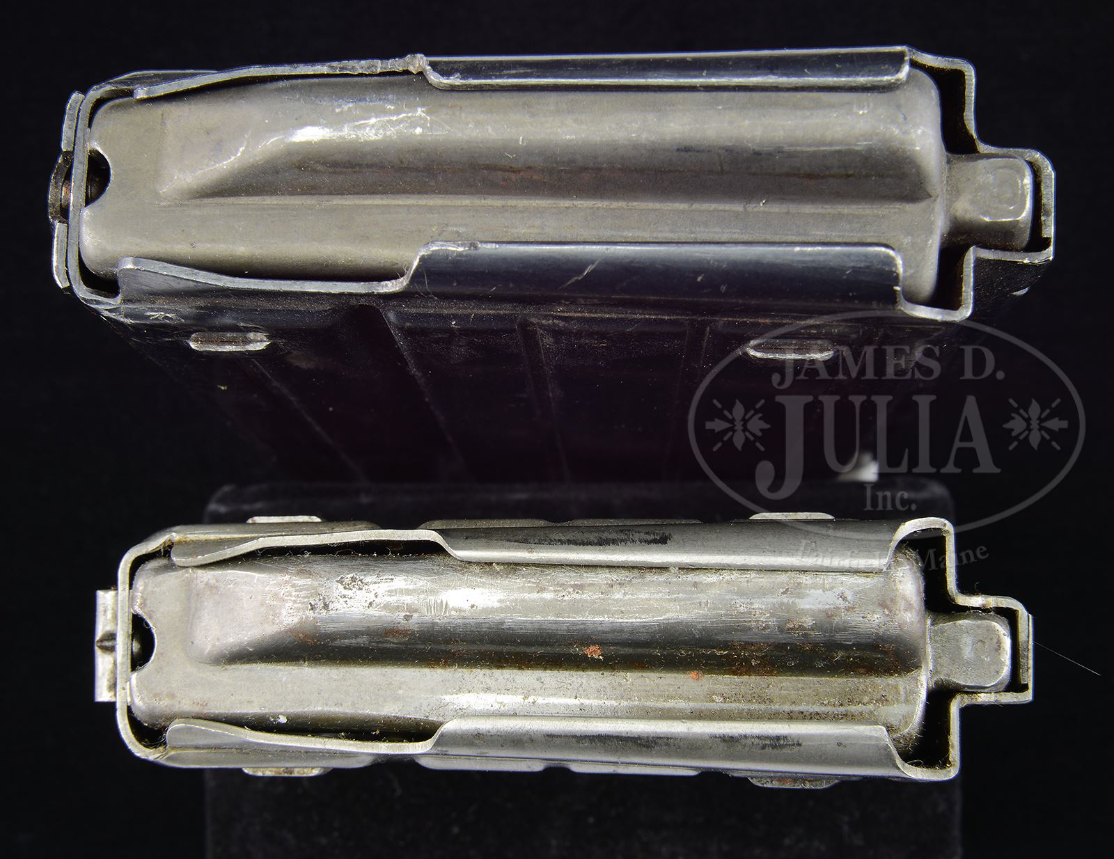LOT OF TWO UNIQUE/VERY RARE EXPERIMENTAL K-43 MAGAZINES.Two experimental K-43 magazines both unmarked. First, probably unique, 10 shot specimen has a simplified front mounting hook and front body pressing. The other is a 20 shot extended magazine. 10 rd magazine has a simple folded/stamped sheet metal retention hook spot welded on the plain forward edge, instead of having the usual hook formed into the front body, and only partial bluing to the lower half, the upper part of the body being originally unfinished; 20 rd magazine has a much wider sheet metal reinforcement plate at the forward edge with a stamped hook and the body is formed with experimental tooling as a single, longer than standard pressing. These very rare 20 shot magazines are also known with the maker’s mark “slj” (as seen on some 2nd Pattern FG42 magazines but absent here). As experimental items these both correctly show no WaA acceptance markings or date. PROVENANCE: Collection of Dr. Geoffrey Sturgess. CONDITION: 10 rd magazine retains fine original blued finish, on the lower 3rd with some scattered light pitting on the upper part, left in-the-white during manufacture, which now shows even gray patina, spring is strong and it appears fully serviceable. 20 rd mag retains over 95% of its smooth lustrous finish, spring is strong and it appears fully serviceable. 43475-1119 JWK67 (5,000-6,000) – Lot 3730