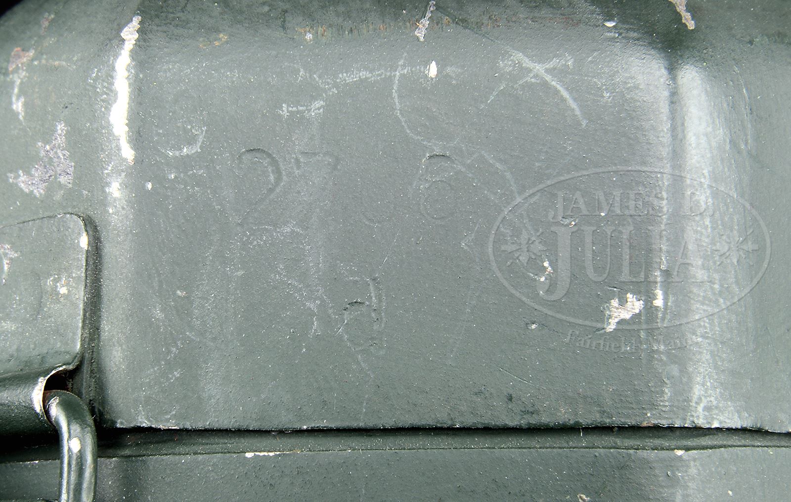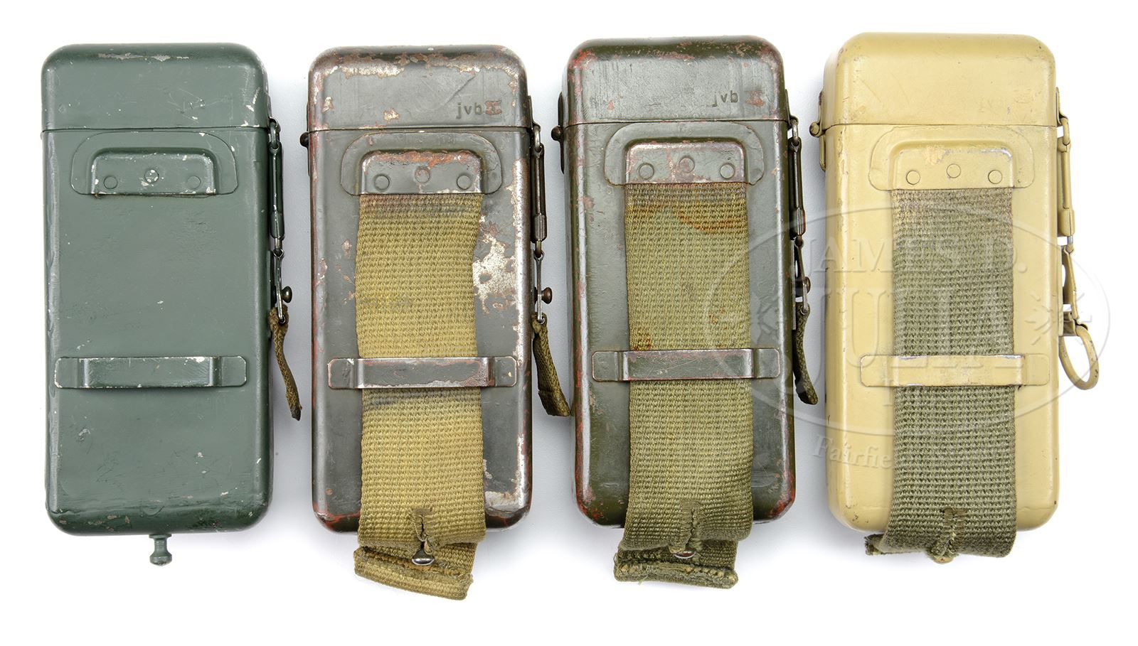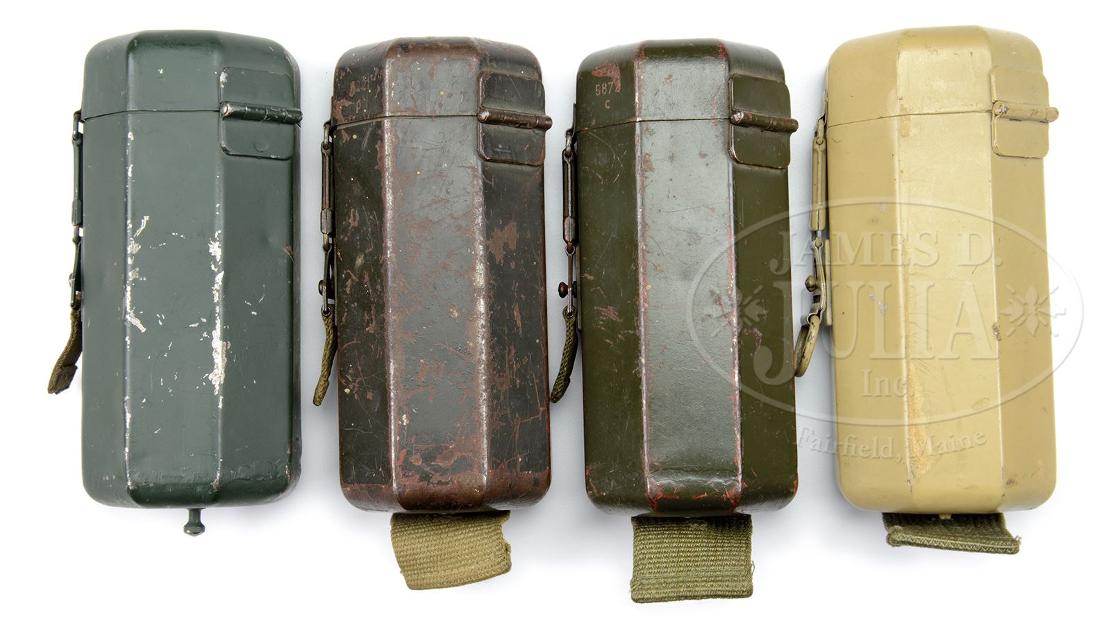 RARE GROUP OF FOUR ZF41 SCOPES WITH CASES.SN NA. 1) BMJ code scope. Mount is SN 5872 with matching green “jvb” coded can. 2) CXM coded scope with unnumbered mount and unnumbered “jvb” coded sand-colored can. 3) “jve” coded scope. SN 3104 on mount. Dark gray “jvb” coded can with numbers that do not match. 4) “cxm” coded scope with unnumbered mount in green “jvb” coded green can. PROVENANCE: Collection of Dr. Geoffrey Sturgess. CONDITION: 1) Retains 97% orig blue. Optics are good. Can has wear and corrosion in corners and edges. 2) 97% blue with good optics. Can has very little wear. 3) Scope & mount 70% blue with scattered corrosion overall. Can is worn with light pitting and retains about 60% orig paint. Optics are good. 4) Scope & mounts retain 95% blue. Optics are good. Can has light wear on edges and corners. 43475-1096 BWS (2,000-3,000) – Lot 3732
