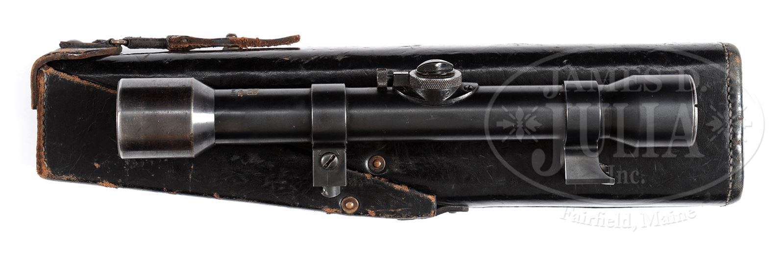 EXTREMELY RARE WEIMAR PERIOD CARL ZEISS ZIELVIER SCOPE IN UNIT MARKED ZF 39 PRECURSOR LEATHER CASE.SN 5585C. 10-1/2″ l, “Carl Zeiss/Jena” logo above “Zielvier/Nr. 18669” on top towards back. SN on front mount which is the Reichsheer period sem-circular base pattern. In a black leather “A. WUNDERLICH/BERLIN S.W.” 1927 dated precursor of the ZF 39 pattern case that is Reichsheer unit marked “9.J.R.16.159” on top flap and also stamped with Reichsheer (Weimar period) Army acceptance marks. PROVENANCE: Collection of Dr. Geoffrey Sturgess. CONDITION: Fine, optics are clear, scope retains 98% orig blue with normal wear on sharp edges. Case is solid and retains 90% orig dye, normal cracking and flaking on flap hinge and belt loop, minor scuffs and scratches with normal wear on sharp edges and corners. 43475-1067 BWS (2,000-3,000) – Lot 3733