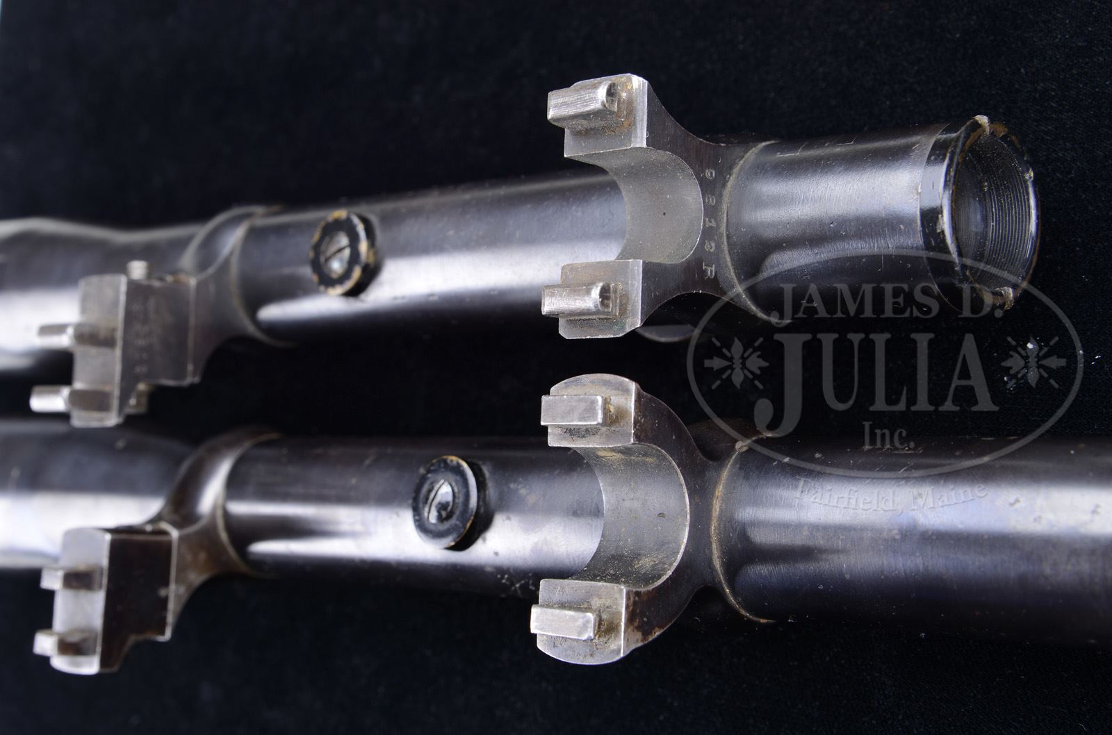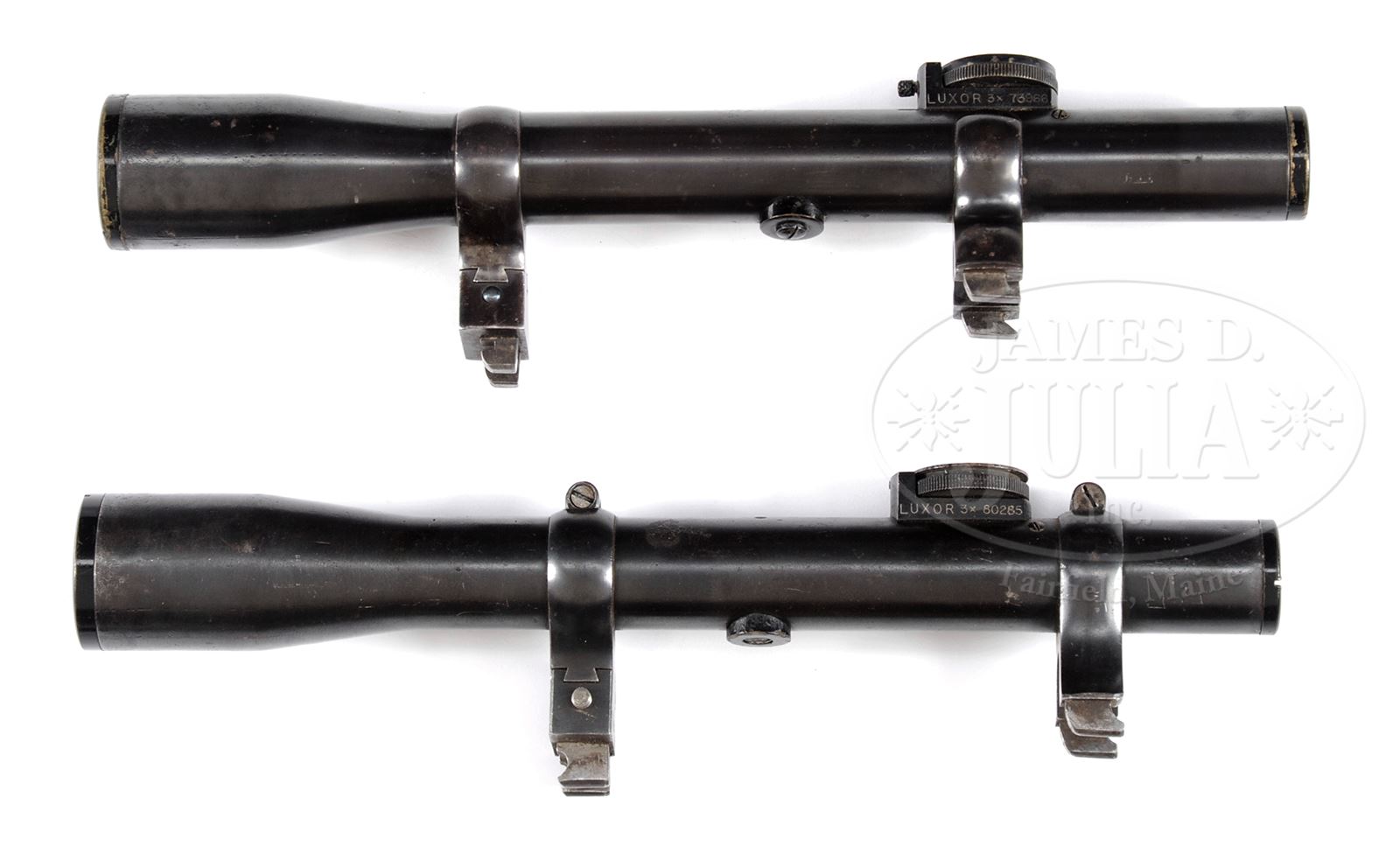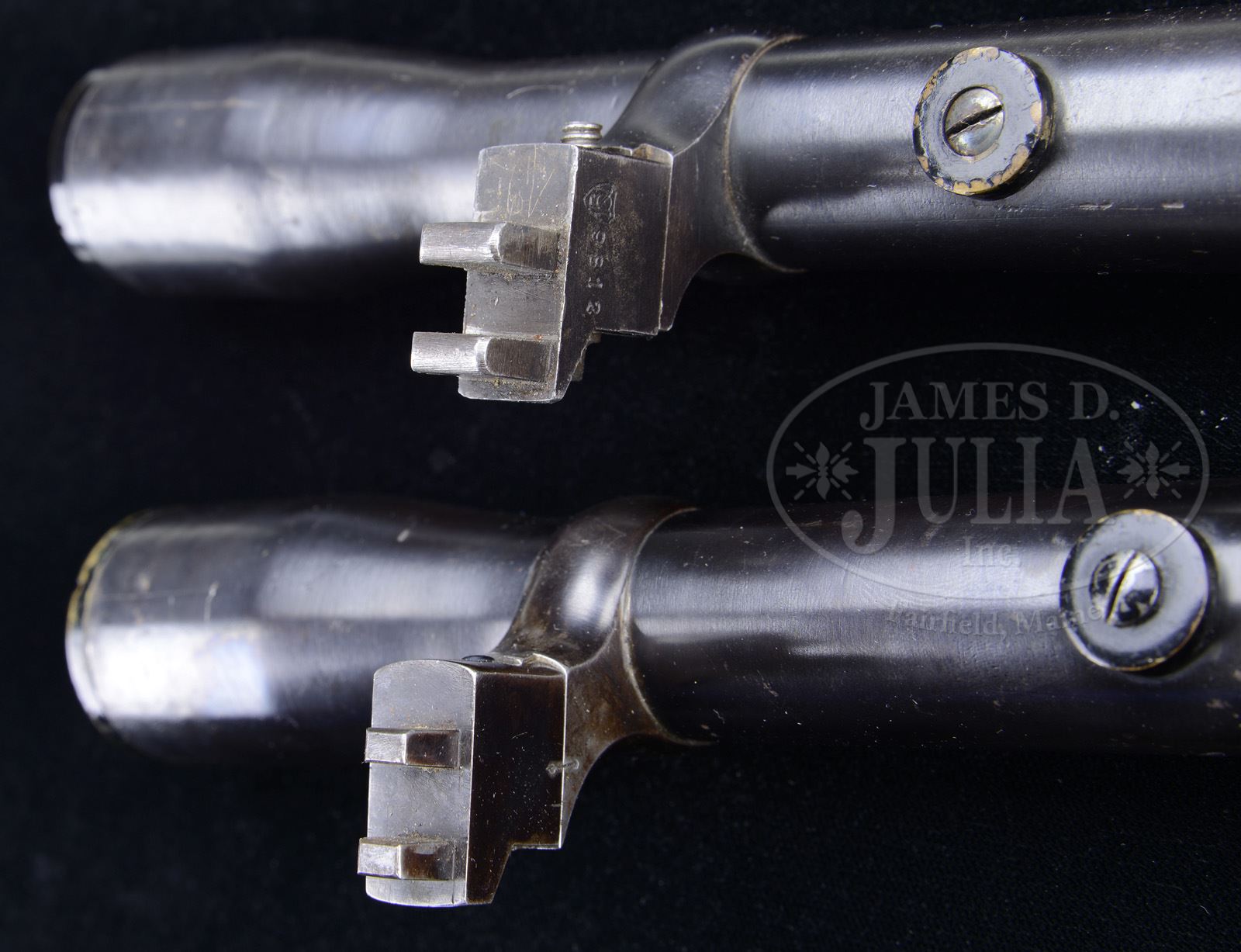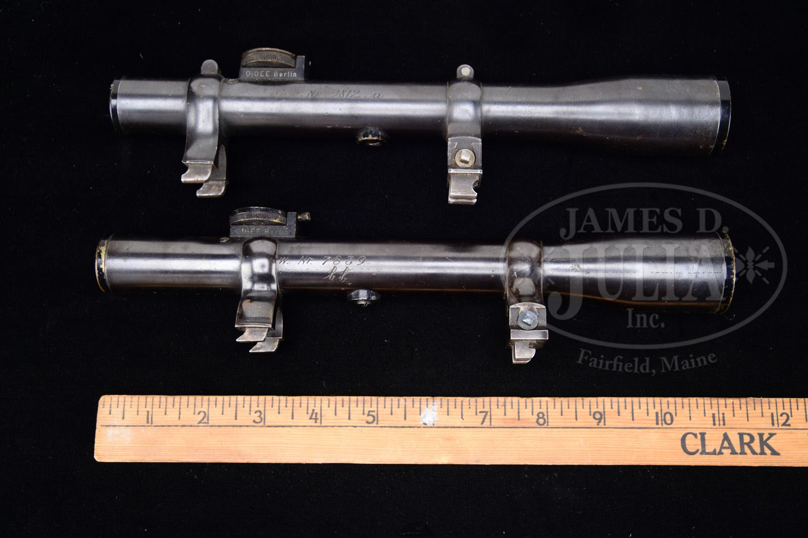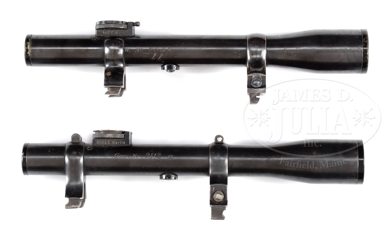 PAIR OF ZF OIGEE BERLIN WWI GEW 98 SNIPER SCOPES.Pair of Oigee Berlin Luxor 3x scopes with offset double claw mounts. Both are marked Oigee on adjustment dial and mounts. First scope is marked “Gen. Nr. 9812. a” on left side, and “LUXOR 3x 80285” on right adjustment base. Second scope is marked “W. Nr. 7839/bb.” on left side. “LUXOR 3x 76966” on adjustment base. Back of rear mount is stamped “V.LAPTSCHINSKY/RIGA”. PROVENANCE: Collection of Dr. Geoffrey Sturgess. CONDITION: Very good, retaining 97% blue. Both appear to have period arsenal finish over light pitting on scopes and orig blue on mounts. Optics are clear. 43475-1090 BWS (2,000-3,000) – Lot 3735