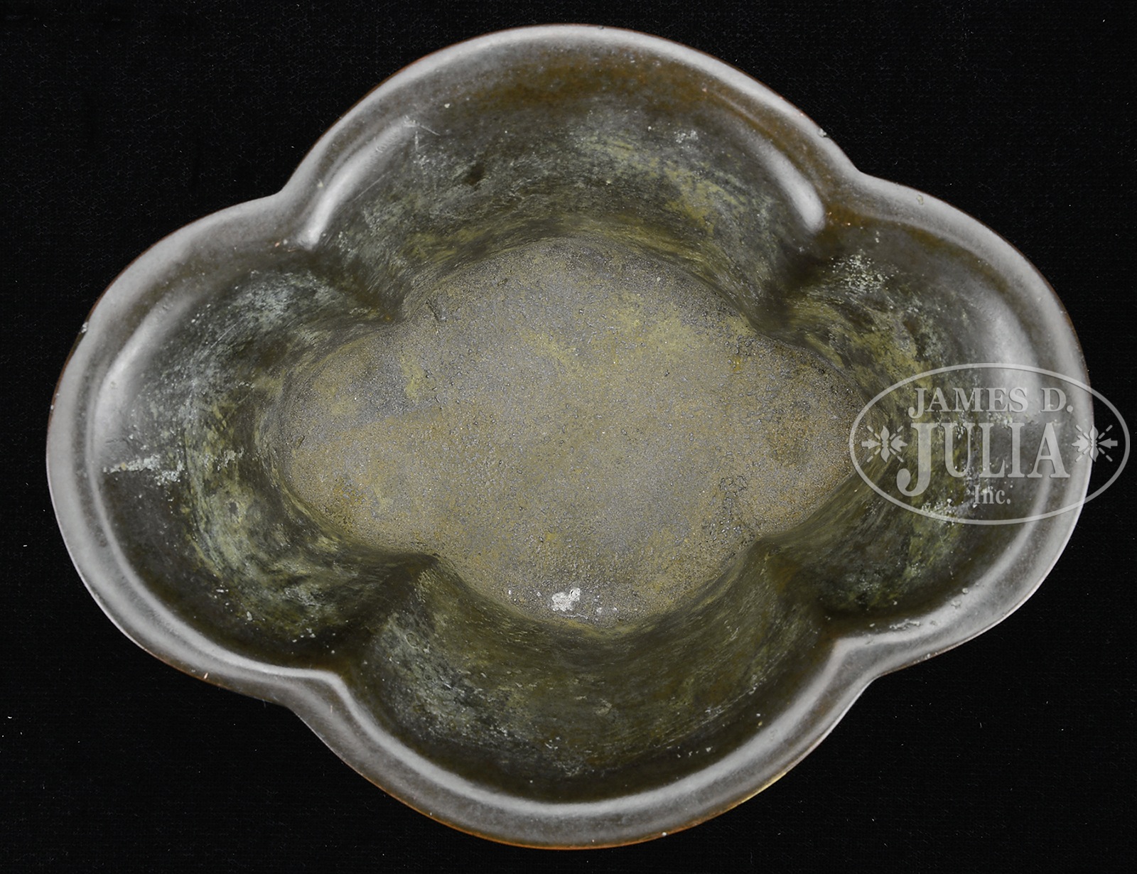 BRONZE CENSER.18th century, China. Lobated form with flower feet. Gold splashed “sun spot” type. 4 character hallmark on the base. SIZE: 5-1/2″ x 4-1/4″ x 3″ h. CONDITION: Very good. 9-91435 (300-500) – Lot 3738