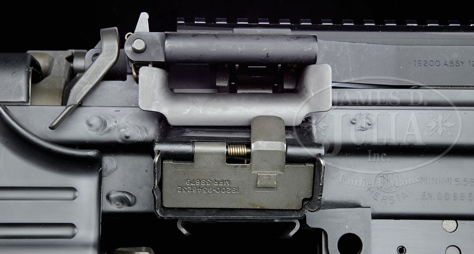 ***INCREDIBLY RARE FN MANUFACTURING “MINI MI” MACHINE GUN (PRE-86 DEALER SAMPLE).SN FN008959. Cal 5.56 mm, 19 1/2 ” bbl with flash hider. 2nd consecutively numbered specimen being offered in this auction. Fully automatic fire only, and also known as the Squad Automatic Weapon (SAW) in the United States military. This model is utilizes either a belt or magazine ammunition feeding system. It is Gas piston operated and firing from an open bolt, and utilizes a rotary bolt locking system, with a quick detachable chrome lined barrel. Standard features include a bipod, carrying handle and flip-up loop shoulder stock rest as well as rail for mounting a variety of sighting systems in addition to a rear peep sight. Marked “FN” within an oval over “HERSTAL” on left side of receiver with numerous original stock numbers on various parts. Action moves smoothly when operated by hand. This weapon appears to be fully functional. This is a National Firearms Act item and requires BATF approval prior to transfer. Currently on a Form 3 with Julia’s classified as a PRE-86 DEALER SAMPLE and annotated on the form “LIMITED TO USE AS A SALES SAMPLE”. CONDITION: Near excellent condition throughout. Evidence of having been fired only upon close observation. Top cover rail and mechanism within top cover or feed tray are excellent and show no evidence of firing. chamber absolutely clean. Firing residue visible at gas block and cylinder area. Slight handling marks with some barely discernible brassing on some of the high edges of the rail and buttplate, but just about as fantastic as one could hope for. This is one of very few examples in a status that require NO law enforcement letter for transfer to a current FFL and SOT license holder. As a pre-86 dealer sample, the dealer who has machine guns in this status who subsequently gives up their license may keep them as a private individual, subject to any local restrictions. Links for belts are readily available and no doubt someone will see the intrinsic value in this both as an investment as well as a recreational standpoint. 49318-3 JWK76 (35,000-60,000) – Lot 3741