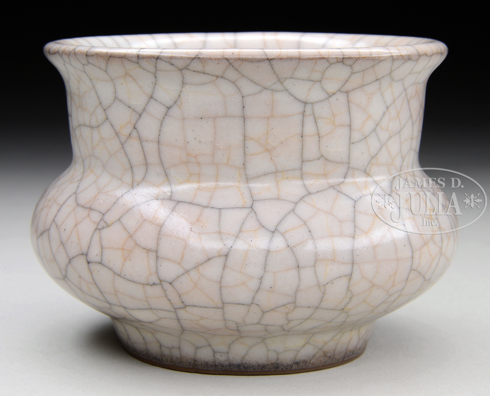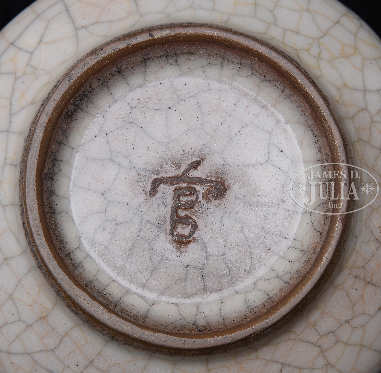 GUAN PORCELAIN POT.20th century, China. Made in squat form with wide cylindrical neck and slightly flared top rim. Glaze ending cleanly just above the foot surrounding a character done in relief on underside. SIZE: 4″ w x 2″ t. CONDITION: Very good. 50342-3 (600-900) – Lot 3741