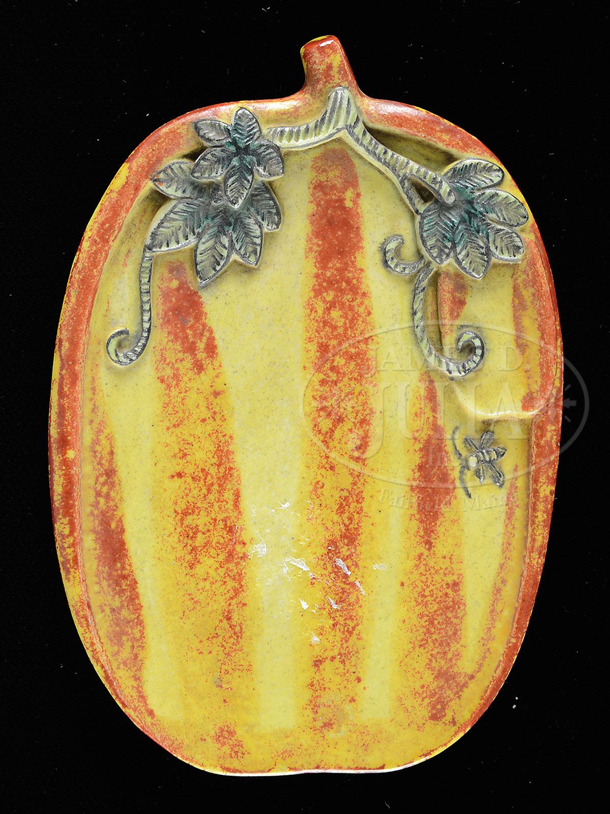 PORCELAIN INK PALETTE. 19th/20th century, China. Chih Lung mark and possibly of the period. Made in the shape of a melon. SIZE: 3-3/4″ l x 2-3/4″ w. CONDITION: Very good. 9-90787 (250-350)