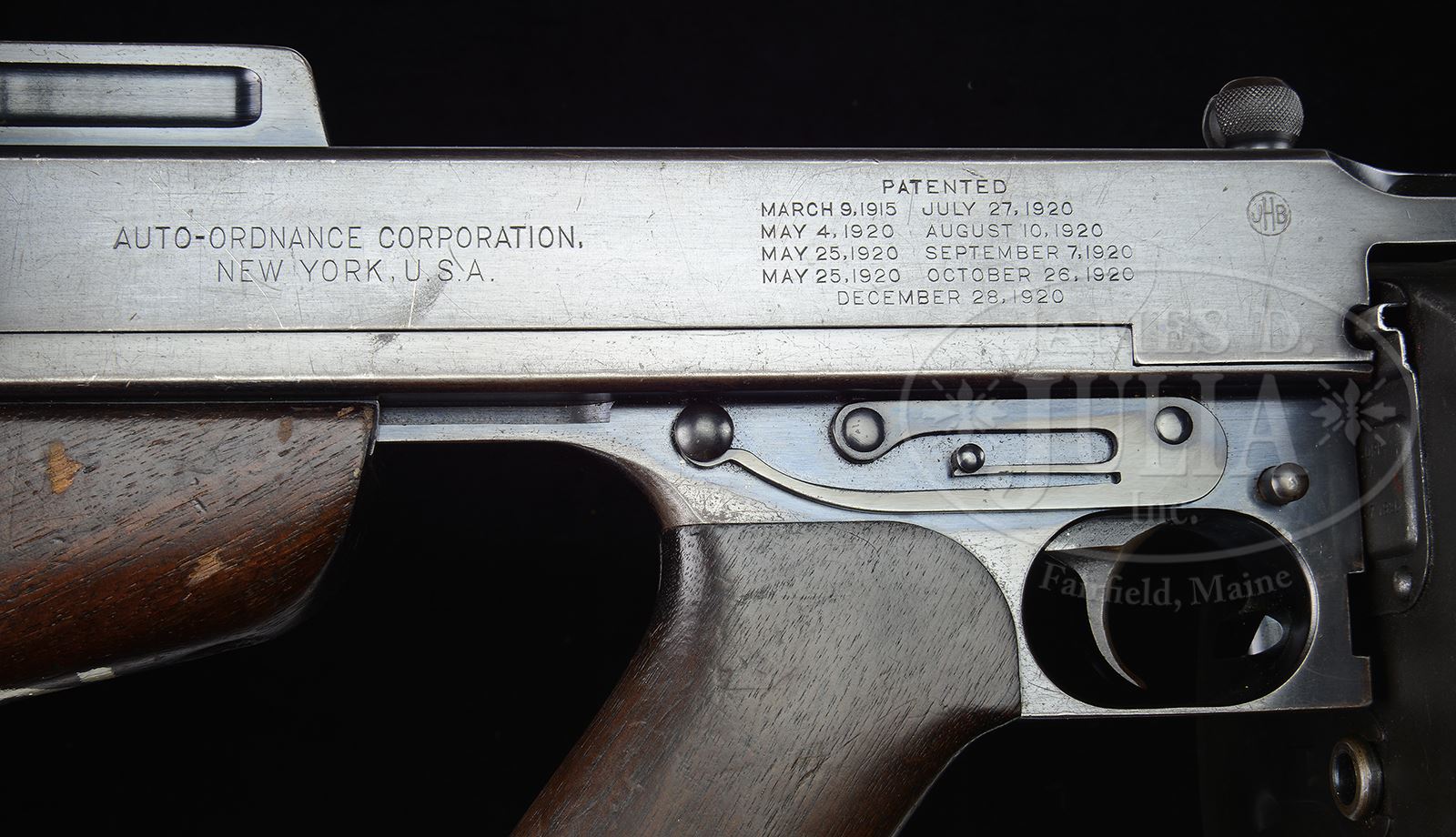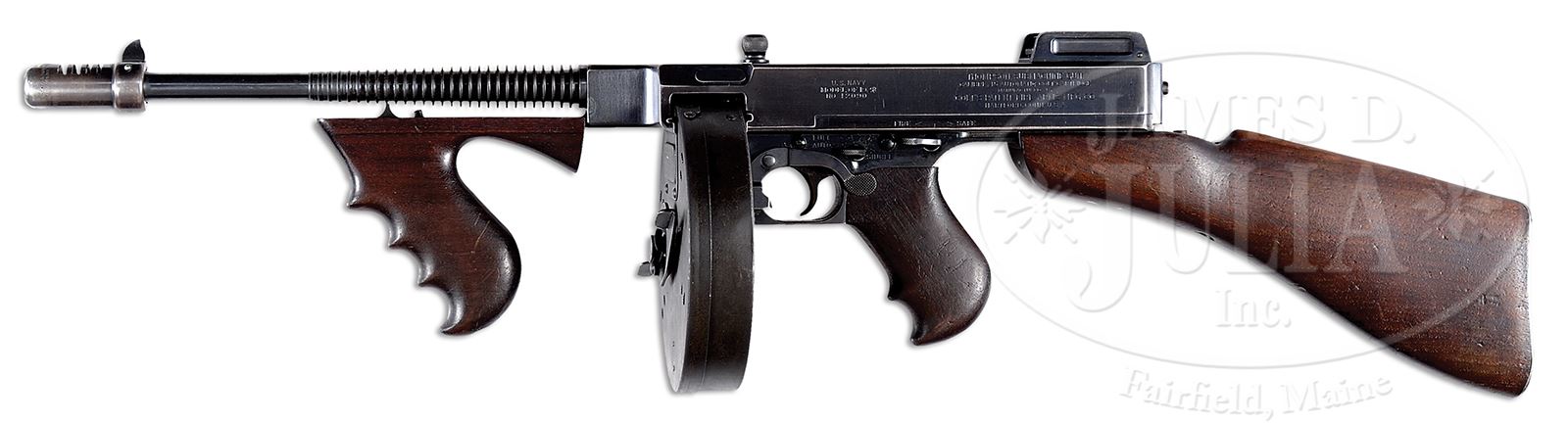 **COLT 1921/28 US NAVY OVERSTAMP THOMPSON SUB-MACHINE GUN.SN 12090. Cal. .45 ACP. 12-1/2″ bbl with “Cutts” marked compensator. Classic US Navy marked overstamp Thompson with “U.S. NAVY” lightly engraved over “MODEL OF 1921” with an “8” overstamped on the “1” of “21”. Typical and correct Colt and Auto-Ordnance markings. Correct 1928 internal parts consistent with Navy retrofit. Stenciled light numeral “2” on buttstock along toe line of buttstock consistent with Navy issue. Includes one Parkerized, blued steel 50-rnd drum marked with “NEW YORK N.Y., U.S.A.” address which is again consistent with military issue. Wooden buttstock has appropriate anchor cartouche at leading edge. Included in this lot is the orig deactivated bbl with weld plugging the chamber and forend iron which was damaged where joint meets receiver upon its removal. Firing mechanism moves smoothly when operated by hand. This weapon appears fully functional. This is a National Firearms Act item and requires BATF approval for transfer. CONDITION: Overall finish and appearance is fine to very fine. Orig blue finish, turning to a brown patina and thinning on the compensator along high edges. There are also some scratches and scuffs to be expected with normal use. Bbl is a replacement as is the forend iron. There is a noticeable heat discoloration half-moon mark 3/8″ long on both sides of the forward edge of the receiver. Bluing also thinning to bare metal at the rails where the magazines are inserted, both vertically and horizontally. Bolt has some very light pitting visible at the actuator slot. Bolt face is very fine. Wood has numerous light handling marks and very minor gouges. Buttplate bluing thinning to a brown patina revealing mostly grey metal. Magazine finish is very good with some scuffing and thinning at the high edges. Good tension of the springs evident. Bore is good with some slight pitting in the grooves. 49370-1 JWK20 C&R (17,500-25,000) – Lot 3750