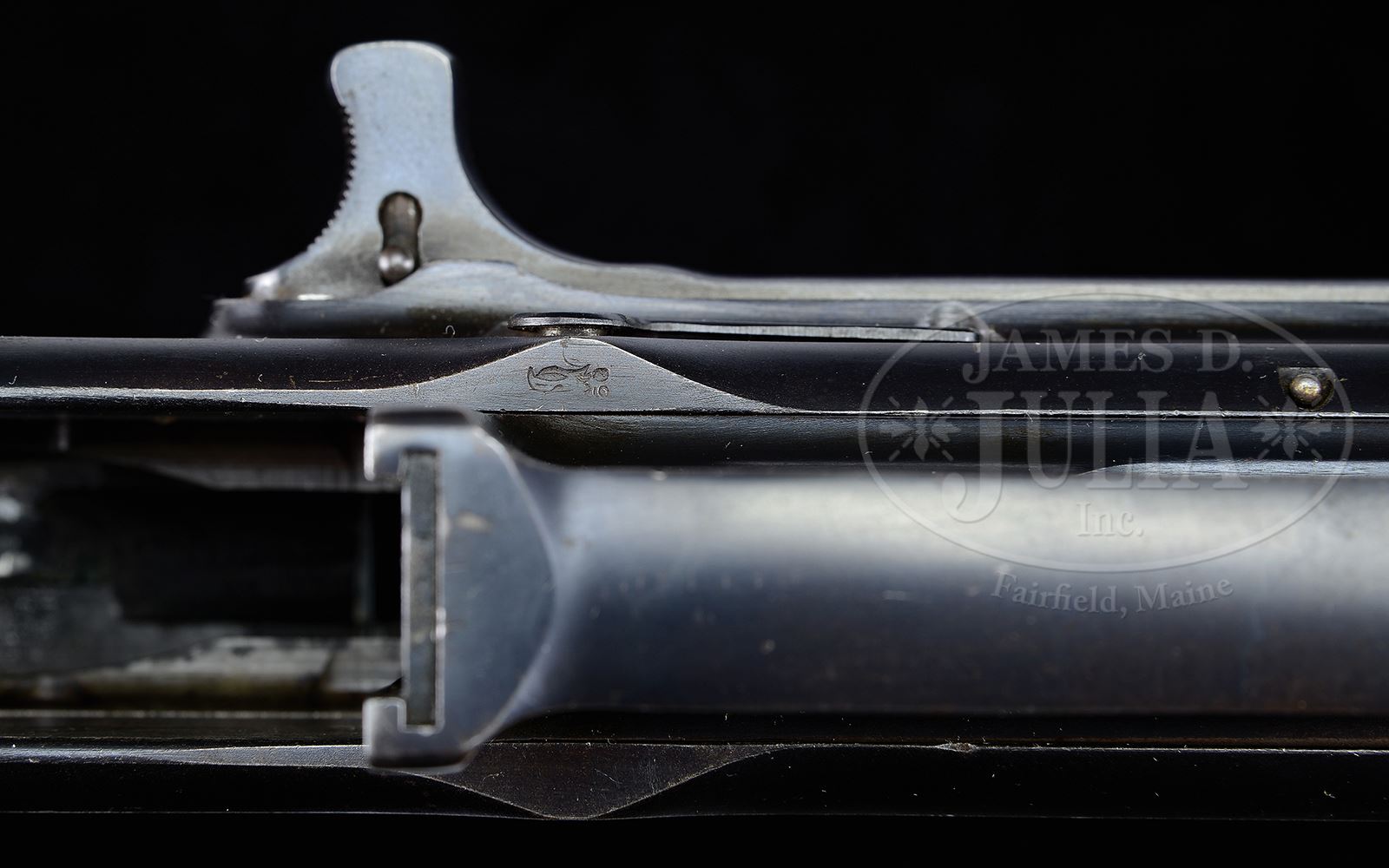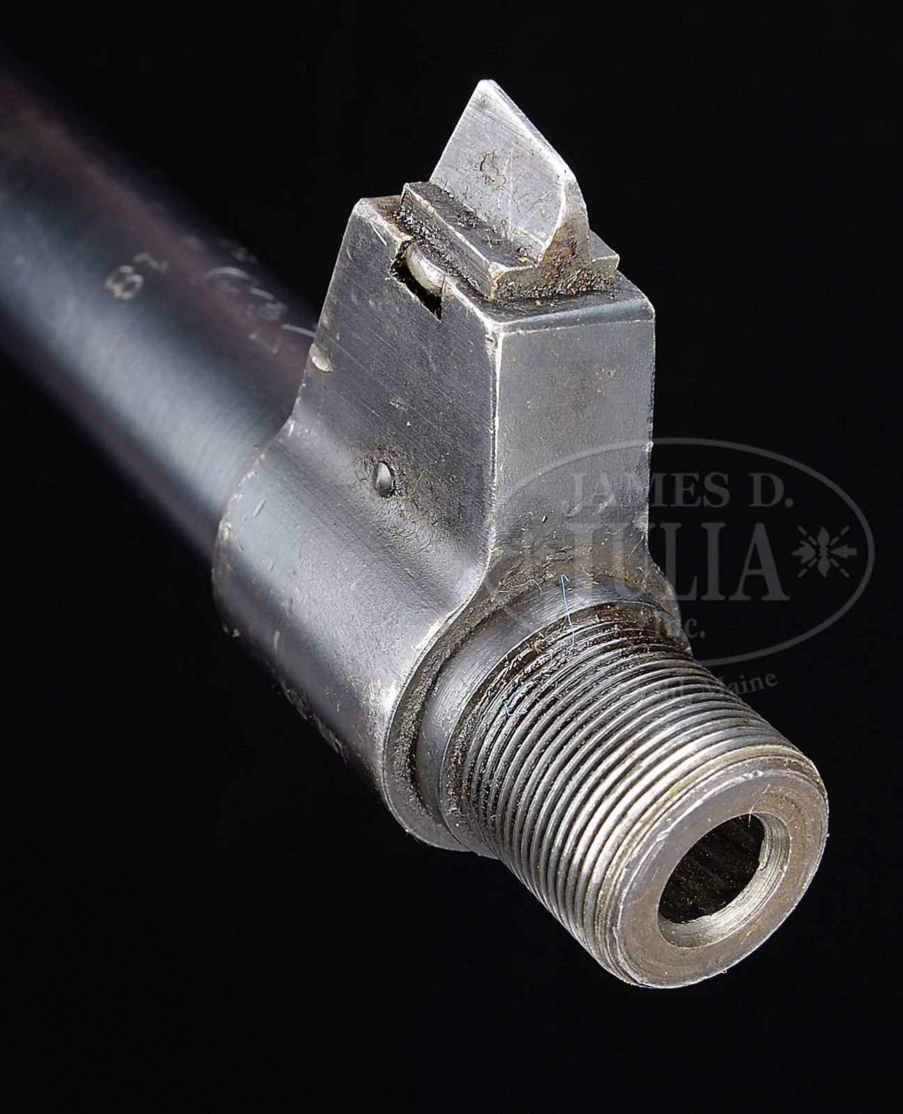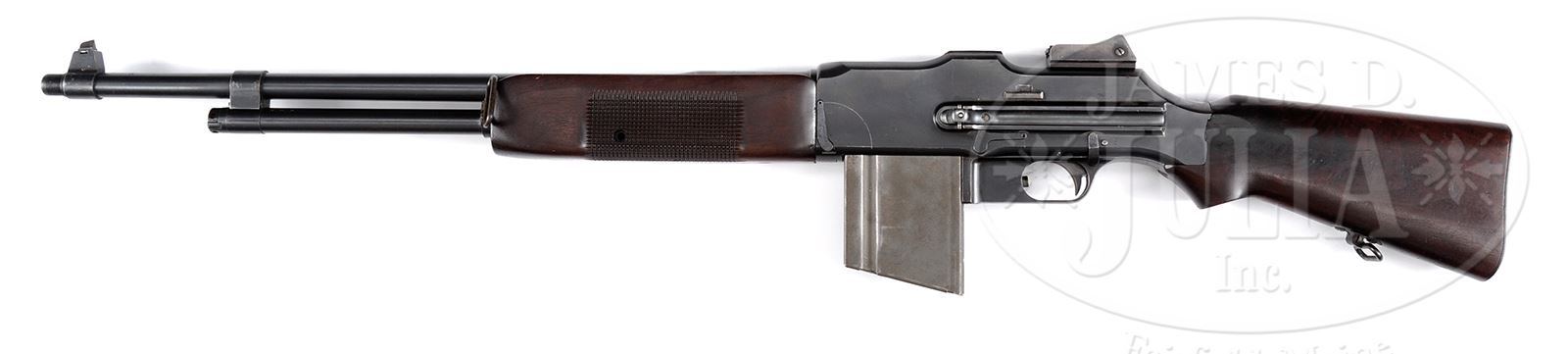 **BEAUTIFUL MARLIN-ROCKWELL MODEL 1918 BROWNING AUTOMATIC RIFLE (CURIO & RELIC).SN 255168. Cal. 30-06. 24″ bbl. Fantastic original Model 1918 B.A.R. made just after the end of WW 1. Bbl date is 12-18 with appropriate “M” over flaming bomb ordnance marking. Receiver bears makers markings “BROWNING AUTOMATIC RIFLE /U.S. MODEL OF 1918/MFD. BY. MARLIN-ROCKWELL CORP.” followed by SN, and then, “PATENT APPLIED FOR”. Marked “2Y” on underside of receiver, and a small eagle over a “50” proofmark on the left underside of the receiver below the trgger group detent pin. Screw-on flash hider not present. Includes two 20-rnd magazines. Rich brown checkered American walnut forend and buttstock. No protective ears on the forward edge of the trigger assembly make this specimen immediately recognizable. The Browning Automatic Rifle was developed and intended to provide “Walking Fire” for American Soldiers as they advanced on enemy positions. The butt was intended to fit into a specifically designed magazine carrying waist belt metal pocket. This specimen’s condition attests that this particular gun never was subjected to this kind of use. Nor was it later retrofitted into Model 1918A2 configuration. Firing mechanism moves smoothly when operated by hand. This weapon appears fully functional. This is a National Firearms Act item and requires BATF approval for transfer. CONDITION: Overall finish and appearance is extremely fine to near excellent. Deep lustrous original blue finish on all metal parts with a few handling marks, and the inescapable detent pin rotation scratches. Top of bolt unlocking plate just to the rear of the manufacturers markings has a mottling of brown patina, as does rear sight ladder. Loss of finish to gray metal at high edges of rear sight protective ears. Magazines have typical grey finish loss and scuff marks from use. Checkered forend has a few damaged checks and some very light handling marks, but is very attractive. Buttstock has a blemish on the left side where the charging handle has rubbed as well as some very light handling marks. Quite a bit of figure to the wood, and very attractive. Bore is good to very good with strong rifling, mostly shiny, and some light pitting, mostly in the grooves. This is a great find for both the shooting enthusiast and the collector. Extremely handsome gun. 49296-9 JWK39 C&R (20,000-30,000) – Lot 3754