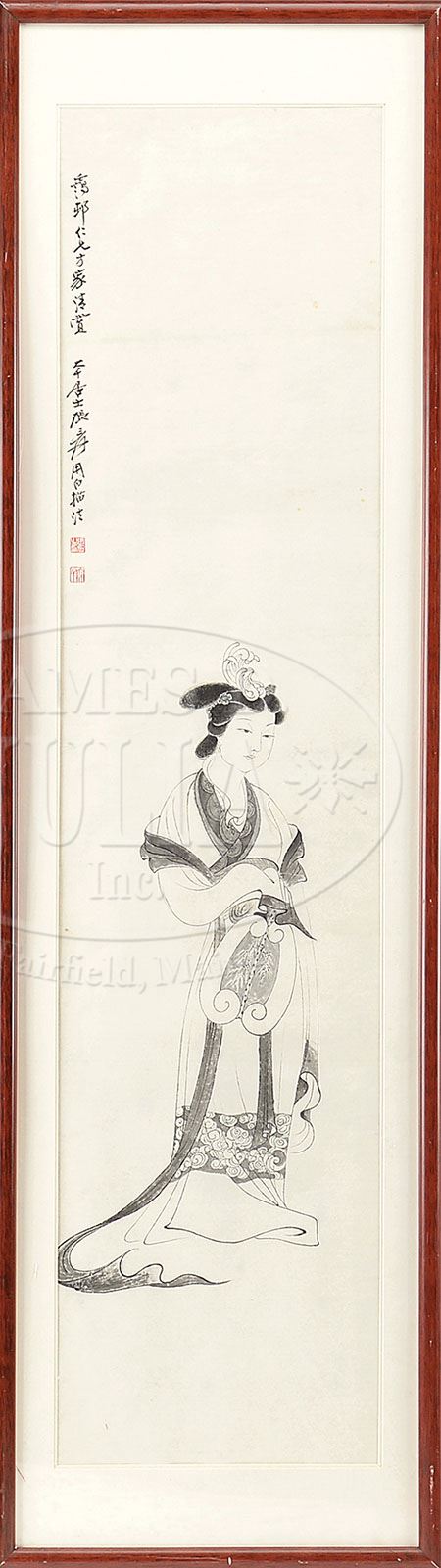 LARGE FRAMED PAINTING IN THE MANNER OF ZHANG DAQIAN. China, ink on paper, finely depicting in gongbi (fine pen) style an elegant lady, dedicated, signed “Daqian ju shi Zhang Yuan,” with two seals, framed and glazed SIZE: 51-1/2″ x 12″ CONDITION: Good, minor foxing 9-91087 (400-600)