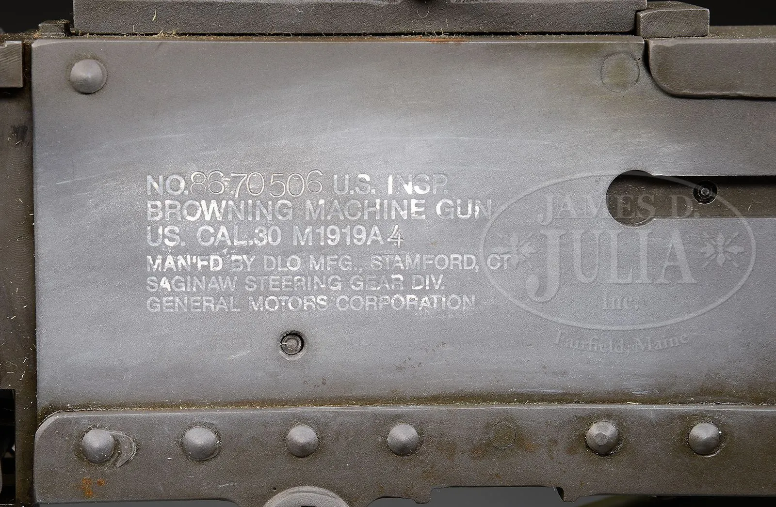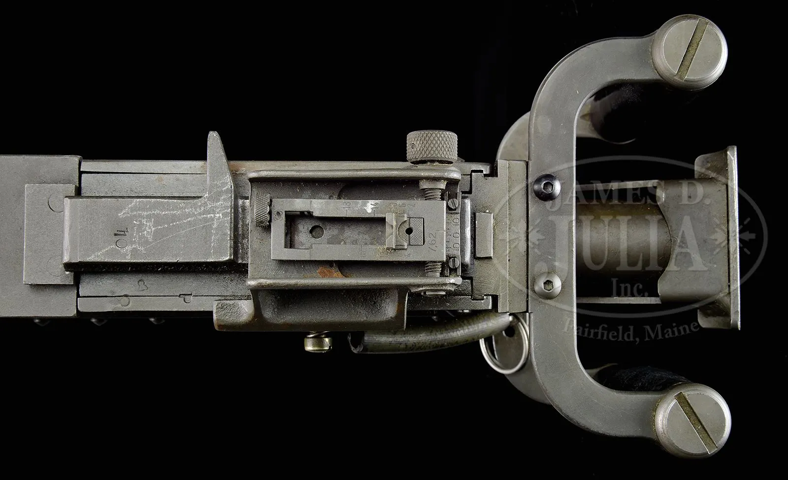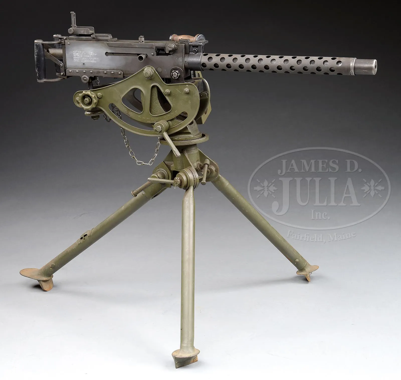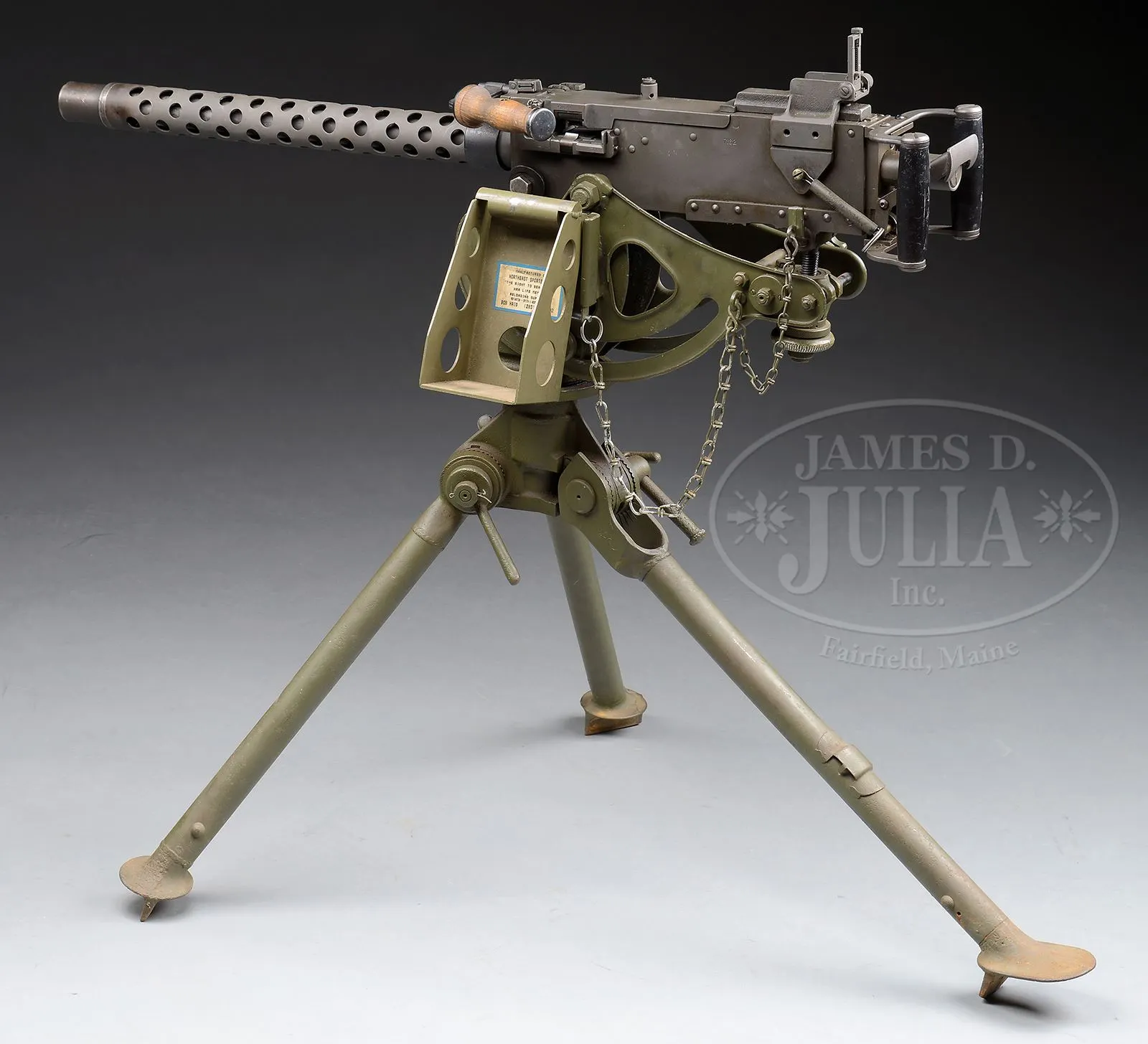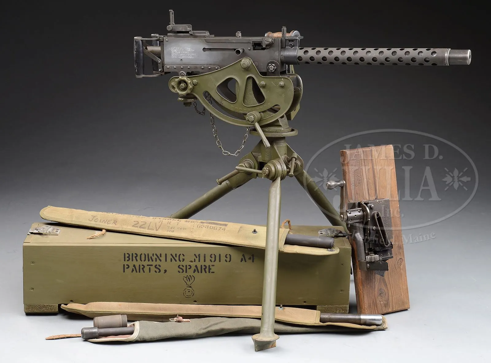 **DLO BROWNING 1919A4 MACHINE GUN WITH SPADE HANDLES ON TRIPOD (FULLY TRANSFERABLE).SN 86-70506. Cal. .308. 24″ bbl Israeli made 7.62 x 51MM parts kit assembled onto a DLO registered sideplate with a clamp on carrying handle and black composite spade grip backplate. 7.62MM spacers present in feedway. Accessories include an US 1917A1 tripod with cradle cover, Northeast Sports manufactured ammo box hanger, a steel Browning cloth belt filling machine Model of 1918, a US Browning 1919A4 .30-06 bbl with muzzle in a M9 bbl bag, a 8MM German MG34 bbl converted for use in the Browning 1919A4 with muzzle adapted for same in a canvas bag, a second 1919A4 bbl in 8MM in a M9 canvas bag, two in the wrapper Israeli chrome line .308 bbls and a partial Israeli 308 1919A4 parts set which includes .308 bbl & bbl shroud, 1-pc pistol grip, buttplate, left sideplate, bottom plate, rear sight and combination wrench, and about 200 metal links for 8mm or .30-06. Also a custom wooden transit chest, painted green & stenciled “BROWNING SPARE PARTS” with invoice for parts set dated 1997. Action moves smoothly when operated by hand. This weapon appears fully functional. Tripod and belt filling machine also appear fully functional. This is a National Firearms Act item and requires BATF approval for transfer. CONDITION: Overall finish and appearance extremely fine as refinished upon re-manufacture with a grey/green Parkerized finish. Tripod and cradle have been repainted OD green. Belt loading machine mounted on a wooden board. Partial parts set in good serviceable condition. Bores on .308 bbls are near excellent, shiny and bright. 8MM bores very good. Links are in excellent condition. This is an outstanding set up for the shooting enthusiast with it’s spares. No doubt it will make some collector very happy. 48986-3 JWK14 (12,500-17,500) – Lot 3762