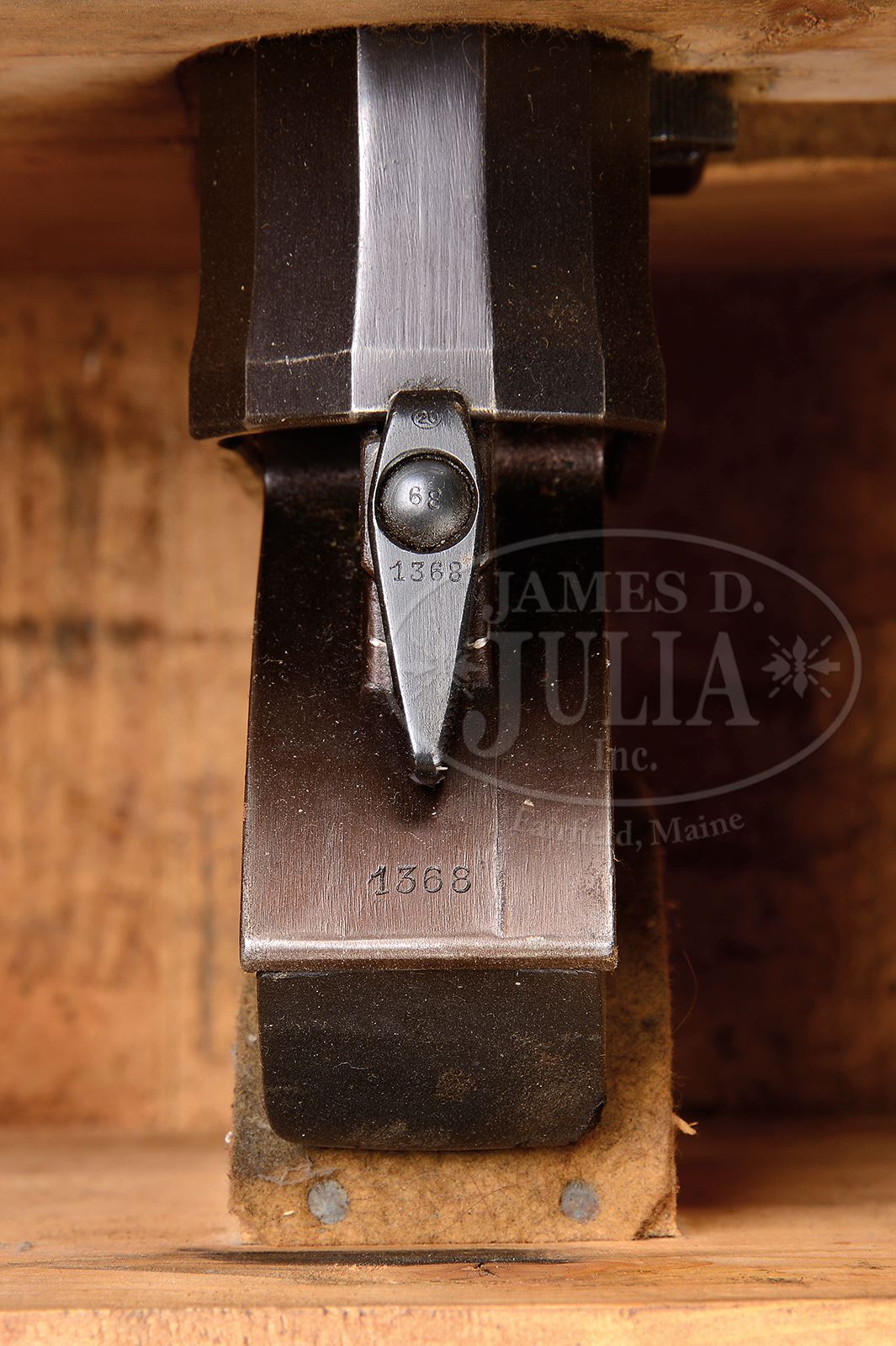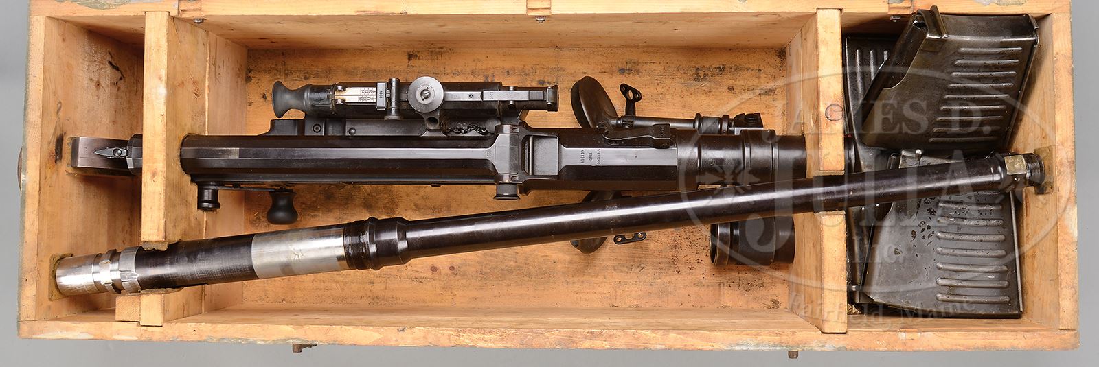 **SOLOTHURN A.G. S18-1000 ANTI-TANK CANNON (DESTRUCTIVE DEVICE)(CURIO & RELIC).SN 1368. Cal 20mm. 52″ bbl. Swiss model S18-1000 semi-auto anti-tank gun manufactured in 1940. Gun is all purple-hued bluing with a black rubber buttplate. Cocking/crank handle on right side receiver. The magazine-well with a spring loaded dust cover is on left side on receiver. Utilizes heavy bipod on front (adjustable for elevation), and monopod at rear. Telescopic sight on left side of receiver. Tangent rear sight (graduated 200-1500 meters) on top of scope. Removable bbl with two muzzle breaks (large and small) SN1283 and SN 1523 (too bad they don’t match gun SN). Front and rear leather bbl covers included as well as ten 10-rnd magazines. One grey canvas 2-cell magazine carrier and 1-cell cloth magazine carrier. Canvas cleaning rod kit complete with cleaning rod. One gunners tool wallet which appears to be complete with bbl wrench, pliers, hammer and other tools. Orig entrenching pick present. Also zippered leather spare parts case with tins containing many various small parts. 19 live rnds, one inert display round included as well as, cut-out vintage advertisement showing what an assortment such as this sold for in the past, as well as an article from 1976 Guns and Ammo Annual showcasing this weapon. Also included are the prior owners handwritten notes about its operation, parts and translation of nomenclature into English. All comes in fitted wooden crate covered in field gray paint and serialized to the gun. This is a National Firearms Act item and requires BATF approval for transfer. CONDITION: Overall finish and appearance extremely fine on all gun parts. Magazines more of a grey patina and have grease protecting them. Tools and tool wallet in extremely fine, serviceable condition. Grey canvas mag pouch extremely fine. Cloth mag pouch very good, serviceable condition. Ammunition near excellent in orig cardboard tubes except for one inert rnd which is loose. Transit chest in fine orig condition with orig paint and SN handwritten on the exterior. A treasure for the WW II Destructive Device collector. Not so perfect that it should not be fired, but still exceedingly nice. 48865-1 JWK18 C&R (8,000-18,000) – Lot 3766