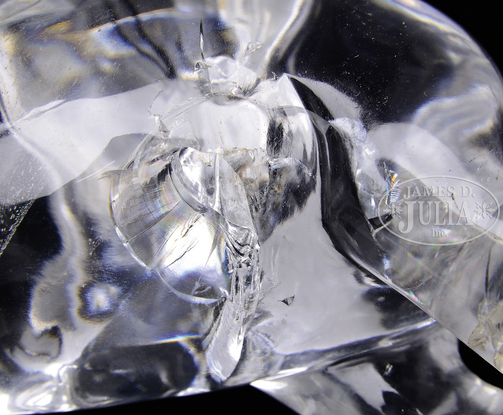ROCK CRYSTAL CARVING.19th century, China. Mythical animal carved from clear stone. With fitted rosewood stand. SIZE: 6-1/2″ h x 6-1/4″ l. CONDITION: Stone with fissures and a chip the animal’s horn. 7-74989 (400-600) – Lot 3771
