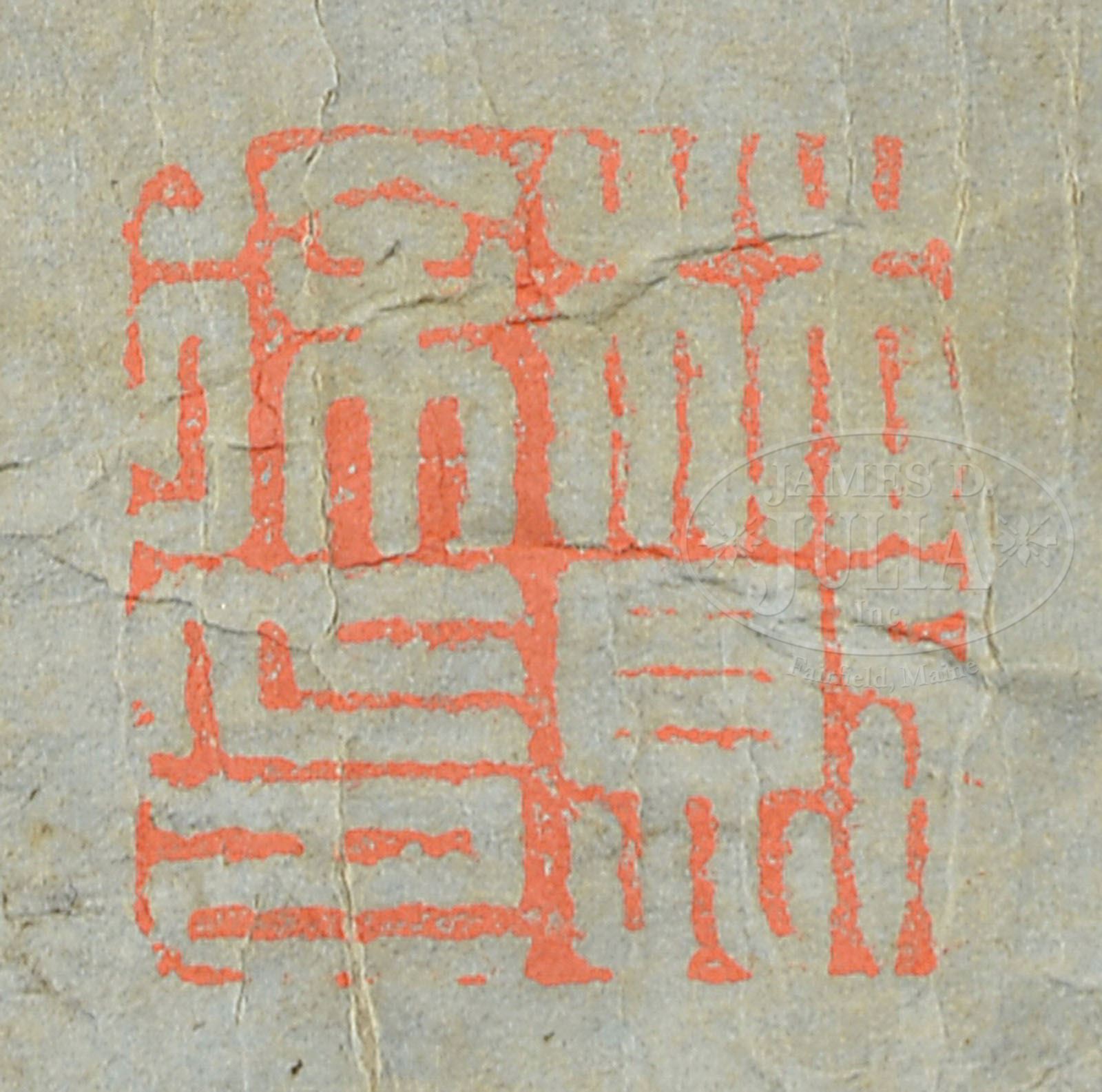 LOOSE CALLIGRAPHY. China, copy of Lin Zexu, standard script on green paper, signed, with one seal SIZE: 16″ X 62″ CONDITION: Mounted in handscroll format without scroll ends, poor condition, creases, surface abrasion and minor losses 7-74493 (200-300)