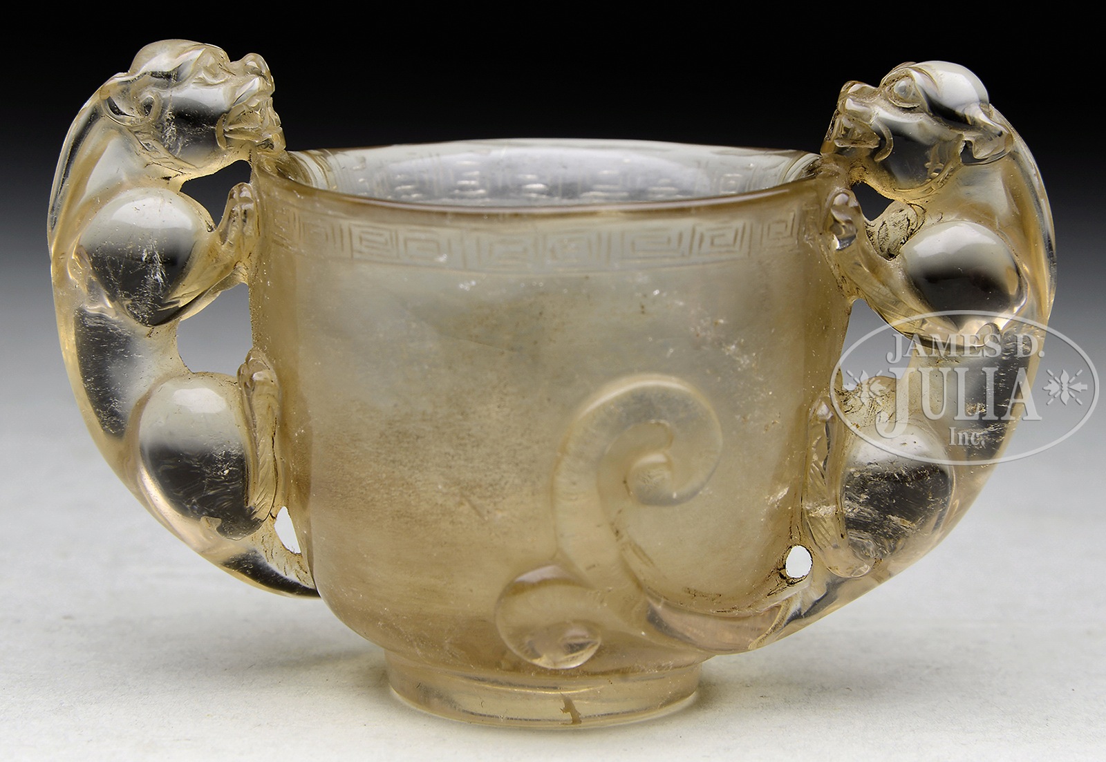 HARDSTONE WINE CUP.19th century, China. Smoky quartz carved with chih lung handles. Lei wen frieze at the mouth. SIZE: 2-3/4″ l x 1-3/4″ w. CONDITION: Very good. 7-74969 (2,000-2,500) – Lot 3777