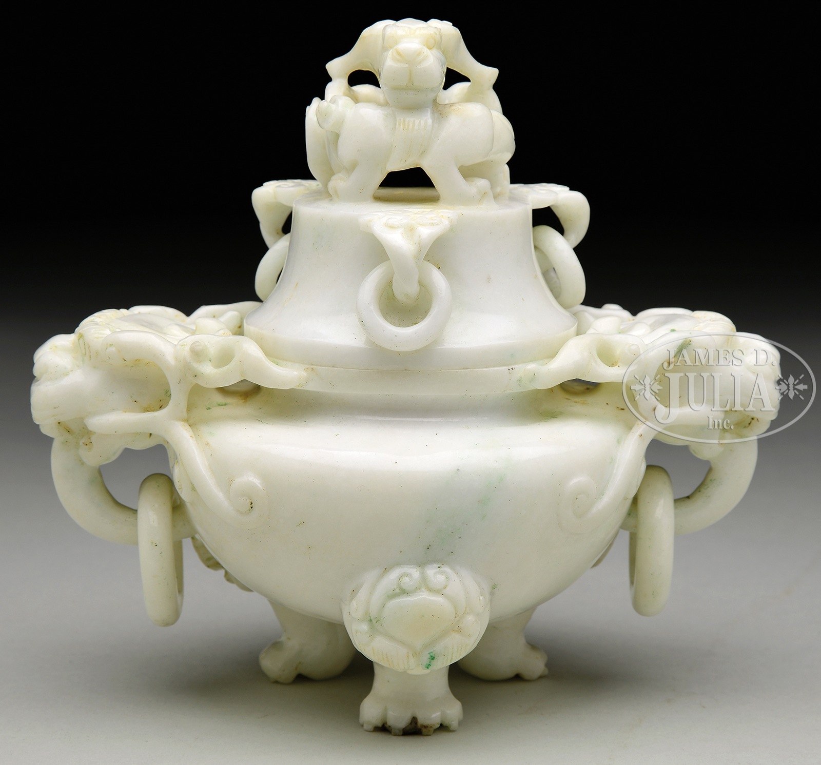 HARDSTONE COVERED INCENSE BURNER.20th century, China. White stone with green markings, foo dog finial, jump rings and feet. SIZE: 6″ h x 6-1/2″ w. PROVENANCE: From a fine private Long Island, NY collection. CONDITION: Very good. 9-93379 (400-600) – Lot 3784