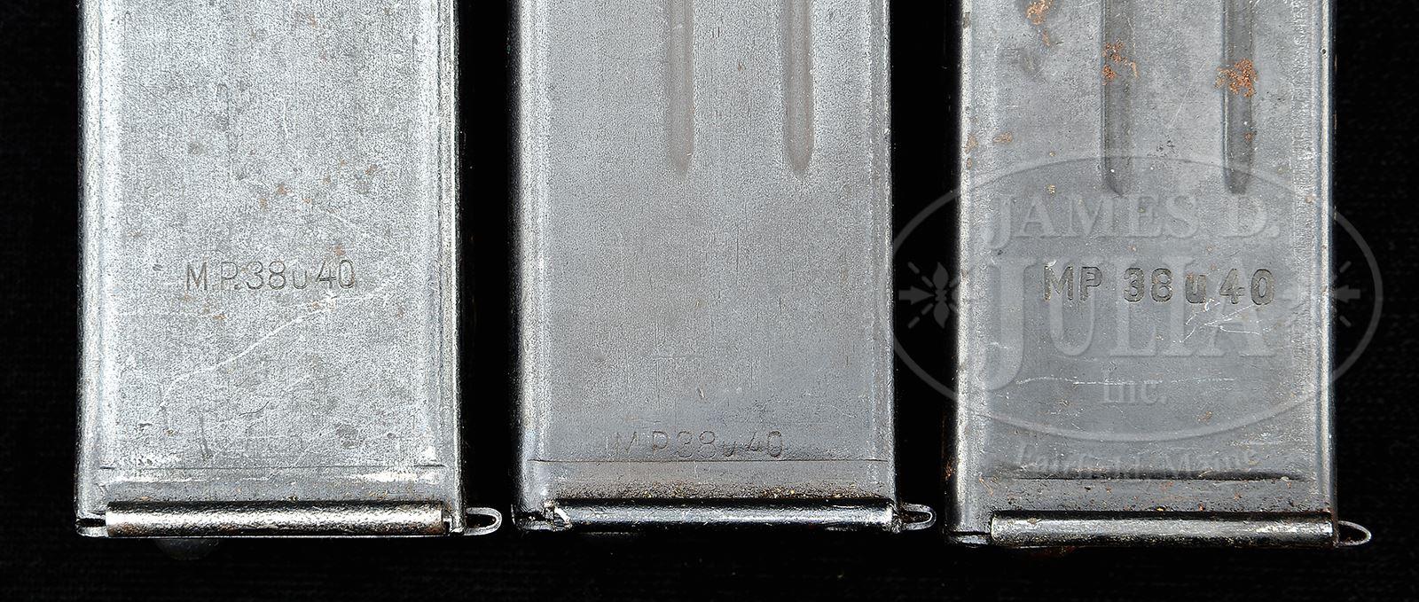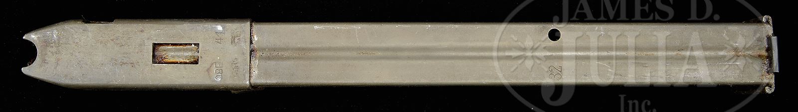 COLLECTOR’S GROUP OF MISCELLANEOUS LIGHT-AND SUB-MACHINE GUN MAGAZINES INCLUDING RARE MP 3008 AND VILLARPEROSA MAGAZINES.This eclectic lot of magazines from the Sturgess collection includes; 8 MP-40 mags 1 of which is a very rare unmarked French post-war (ca 1950) production mag (made by Manufacture National d’Armes de Levalloise who also made P.08 magazines for the pistol while in French service in the 1950s) which is a few mm shorter than the original German model while the others all have Nazi era markings, 1 of these Nazi marked mags is an very early MP-38 mag dated “38” manufactured by C.G. Haenel without the later dirt clearance ribbing along the sides. There is 1 MP-34ö mag in 9 mm Parabellum, 1 Suomi mag, 1 Sten gun mag, 3 universal type mags which have been filed and adapted for an unknown application, 1 very rare ZfG 38 70 rd blank firer magazine, 8 MG 13 spare mags in a steel box marked BSW 1938, and 1 German made 36 rd mag which fits perfectly in the MP 3008, and an incredibly rare 9 mm Glisenti 25 rd mag for the Villar Perosa machine gun. Also included is 1 MG 13 four mag canvas carrier with 4 mags. PROVENANCE: Collection of Dr. Geoffrey Sturgess. CONDITION: Condition of mags range from extremely fine as refinished to gray parkerized finish, all appear to be serviceable with good spring tension. Villar Perosa mag has a mat blued finish with scattered light pin prick corrosion, MP 3008 mag appears to have started out as a MP 18.1 mag which was adapted, MP 34ö mag has been refinish with light pin prick corrosion, MP 38 slab sided mag has a couple of dents & retains about 60% of its orig blued finish with some mottling of bare metal and scattered pitting, MG 13 mags are in very good (blank firing) to near excellent (standard mags) serviceable condition. Field gray canvas mag carrier is near excellent, completely serviceable in all respects. This collector’s lot contains both very rare and more common mags. 43475-1120 JWK68 (2,000-2,500) – Lot 3789