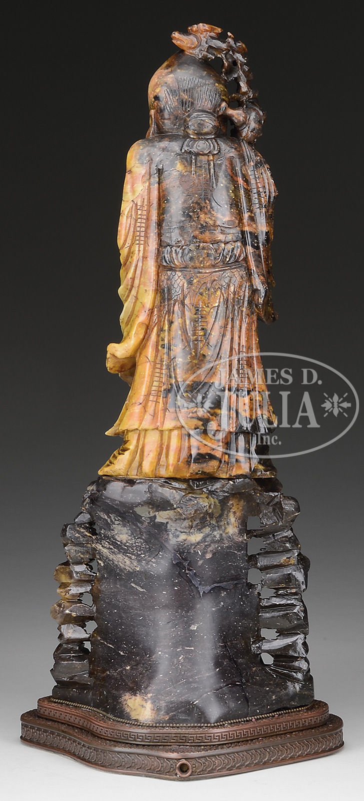 LARGE SOAPSTONE CARVING OF THE GOD OF LONGEVITY.19th to early 20th century, China. Figure is holding a peach and a staff. Stone of a yellow color with black and red markings. On a fitted metal stand. SIZE: 21-3/4″ l. CONDITION: Very good. 7-75139 (200-300) – Lot 3790